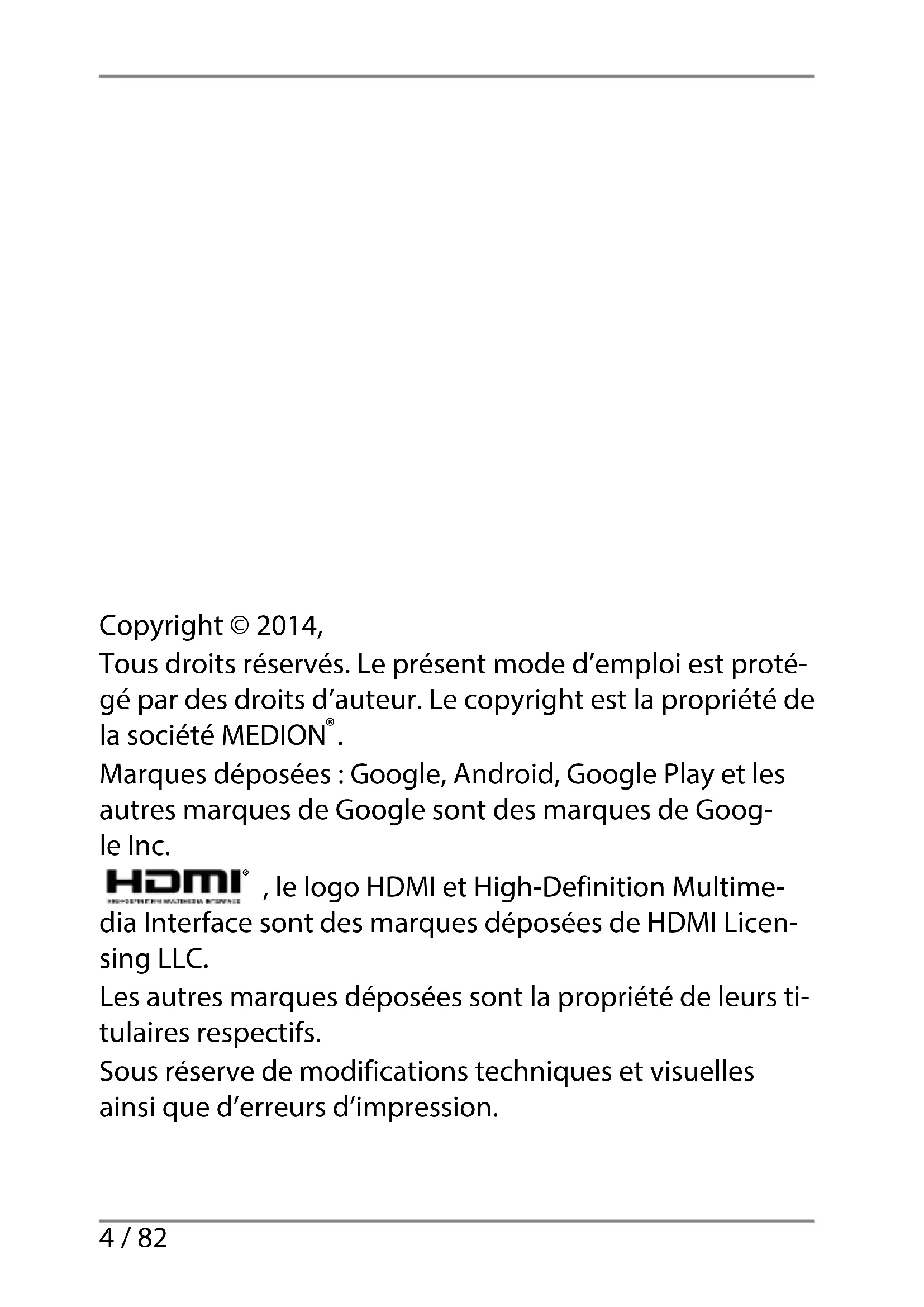 E10320_E10318_E10317 FR Generic Final Content.indd 3E10320_E10318_E10317 FR Generic Final Content.indd 3 05.02.2014 09:02:5505.02.2014 09:02:554 / 82 Copyright © 2014, Tous droits réservés. Le présent mode d’emploi est proté- gé par des droits d’auteur. Le copyright est la propriété de la société MEDION
