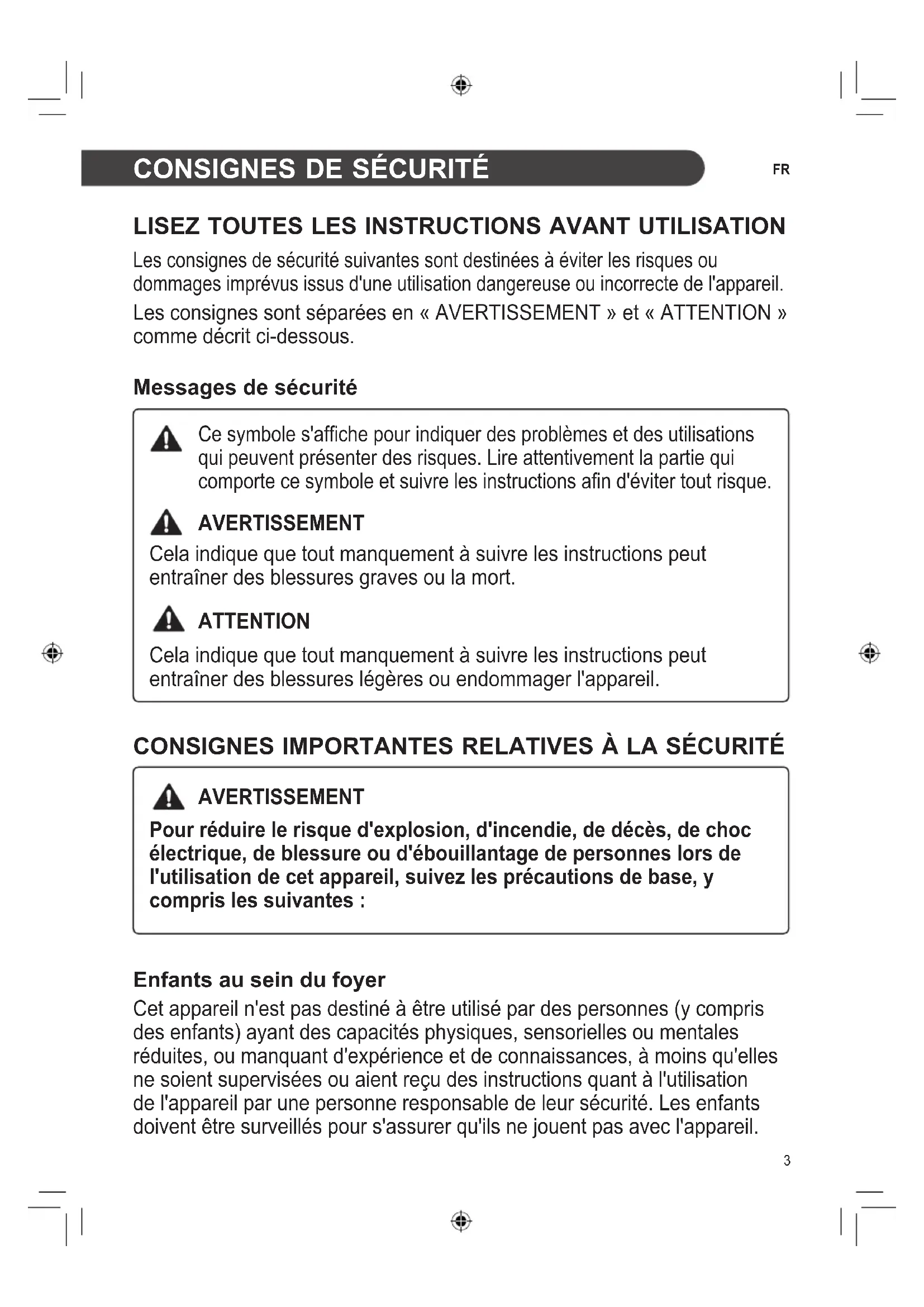 AVERTISSEMENT Pour réduire le risque d'explosion, d'incendie, de décès, de choc électrique, de blessure ou d'ébouillantage de personnes lors de l'utilisation de cet appareil, suivez les précautions de base, y compris les suivantes : Enfants au sein du foyer Cet appareil n'est pas destiné à être utilisé par des personnes (y compris des enfants) ayant des capacités physiques, sensorielles ou mentales réduites, ou manquant d'expérience et de connaissances, à moins qu'elles ne soient supervisées ou aient reçu des instructions quant à l'utilisation de l'appareil par une personne responsable de leur sécurité. Les enfants doivent être surveillés pour s'assurer qu'ils ne jouent pas avec l'appareil.4