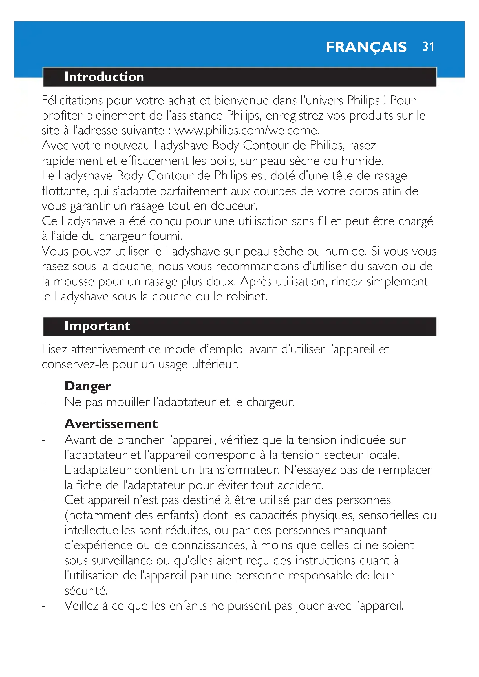 SUOMI 29Takuu & huolto Jos haluat lisätietoja tai laitteen suhteen on ongelmia, käy Philipsin Internet-sivuilla osoitteessa www.philips.com tai ota yhteys Philipsin asiakaspalveluun (puhelinnumero löytyy takuulehtisestä). Voit myös ottaa yhteyden Philips-myyjään tai Philipsin valtuuttamaan huoltoliikkeeseen tai suoraan Philips Domestic Appliances and Personal Care BV:n huolto- osastoon. SUOMI3031 Introduction Félicitations pour votre achat et bienvenue dans l’univers Philips ! Pour proter pleinement de l’assistance Philips, enregistrez vos produits sur le site à l’adresse suivante : www.philips.com/welcome. Avec votre nouveau Ladyshave Body Contour de Philips, rasez rapidement et efcacement les poils, sur peau sèche ou humide. Le Ladyshave Body Contour de Philips est doté d’une tête de rasage ottante, qui s’adapte parfaitement aux courbes de votre corps an de vous garantir un rasage tout en douceur. Ce Ladyshave a été conçu pour une utilisation sans l et peut être chargé à l’aide du chargeur fourni. Vous pouvez utiliser le Ladyshave sur peau sèche ou humide. Si vous vous rasez sous la douche, nous vous recommandons d’utiliser du savon ou de la mousse pour un rasage plus doux. Après utilisation, rincez simplement le Ladyshave sous la douche ou le robinet. Important Lisez attentivement ce mode d’emploi avant d’utiliser l’appareil et conservez-le pour un usage ultérieur. Danger Ne pas mouiller l’adaptateur et le chargeur. Avertissement Avant de brancher l’appareil, vériez que la tension indiquée sur l’adaptateur et l’appareil correspond à la tension secteur locale. L’adaptateur contient un transformateur. N’essayez pas de remplacer la che de l’adaptateur pour éviter tout accident. Cet appareil n’est pas destiné à être utilisé par des personnes (notamment des enfants) dont les capacités physiques, sensorielles ou intellectuelles sont réduites, ou par des personnes manquant d’expérience ou de connaissances, à moins que celles-ci ne soient sous surveillance ou qu’elles aient reçu des instructions quant à l’utilisation de l’appareil par une personne responsable de leur sécurité. Veillez à ce que les enfants ne puissent pas jouer avec l’appareil.