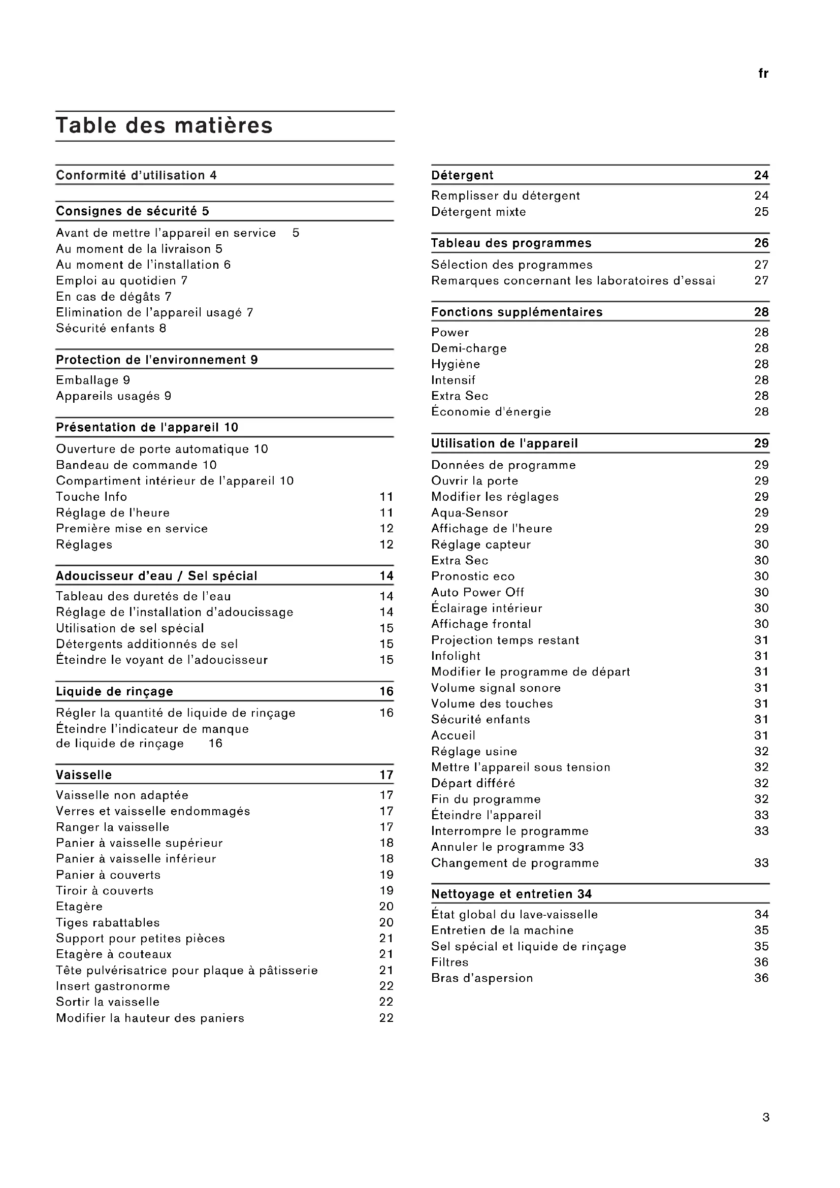 Table des matières Mode d’emploi Conformité d’utilisation 4 Consignes de sécurité 5 Avant de mettre l’appareil en service 5 Au moment de la livraison 5 Au moment de l’installation 6 Emploi au quotidien 7 En cas de dégâts 7 Elimination de l’appareil usagé 7 Sécurité enfants 8 Protection de l'environnement 9 Emballage 9 Appareils usagés 9 Présentation de l'appareil 10 Ouverture de porte automatique 10 Bandeau de commande 10 Compartiment intérieur de l’appareil 10 Touche Info 11 Réglage de l'heure 11 Première mise en service 12 Réglages 12 Adoucisseur d’eau / Sel spécial 14 Tableau des duretés de l’eau 14 Réglage de l’installation d’adoucissage 14 Utilisation de sel spécial 15 Détergents additionnés de sel 15 Éteindre le voyant de l’adoucisseur 15 Liquide de rinçage 16 Régler la quantité de liquide de rinçage 16 Éteindre l’indicateur de manque de liquide de rinçage 16 Vaisselle 17 Vaisselle non adaptée 17 Verres et vaisselle endommagés 17 Ranger la vaisselle 17 Panier à vaisselle supérieur 18 Panier à vaisselle inférieur 18 Panier à couverts 19 Tiroir à couverts 19 Etagère 20 Tiges rabattables 20 Support pour petites pièces 21 Etagère à couteaux 21 Tête pulvérisatrice pour plaque à pâtisserie 21 Insert gastronorme 22 Sortir la vaisselle 22 Modifier la hauteur des paniers 22 Détergent 24 Remplisser du détergent 24 Détergent mixte 25 Tableau des programmes 26 Sélection des programmes 27 Remarques concernant les laboratoires d’essai 27 Fonctions supplémentaires 28 Power 28 Demi-charge 28 Hygiène 28 Intensif 28 Extra Sec 28 Économie d'énergie 28 Utilisation de l'appareil 29 Données de programme 29 Ouvrir la porte 29 Modifier les réglages 29 Aqua-Sensor 29 Affichage de l'heure 29 Réglage capteur 30 Extra Sec 30 Pronostic eco 30 Auto Power Off 30 Éclairage intérieur 30 Affichage frontal 30 Projection temps restant 31 Infolight 31 Modifier le programme de départ 31 Volume signal sonore 31 Volume des touches 31 Sécurité enfants 31 Accueil 31 Réglage usine 32 Mettre l’appareil sous tension 32 Départ différé 32 Fin du programme 32 Éteindre l'appareil 33 Interrompre le programme 33 Annuler le programme 33 Changement de programme 33 Nettoyage et entretien 34 État global du lave-vaisselle 34 Entretien de la machine 35 Sel spécial et liquide de rinçage 35 Filtres 36 Bras d’aspersion 36fr Conformité d’utilisation