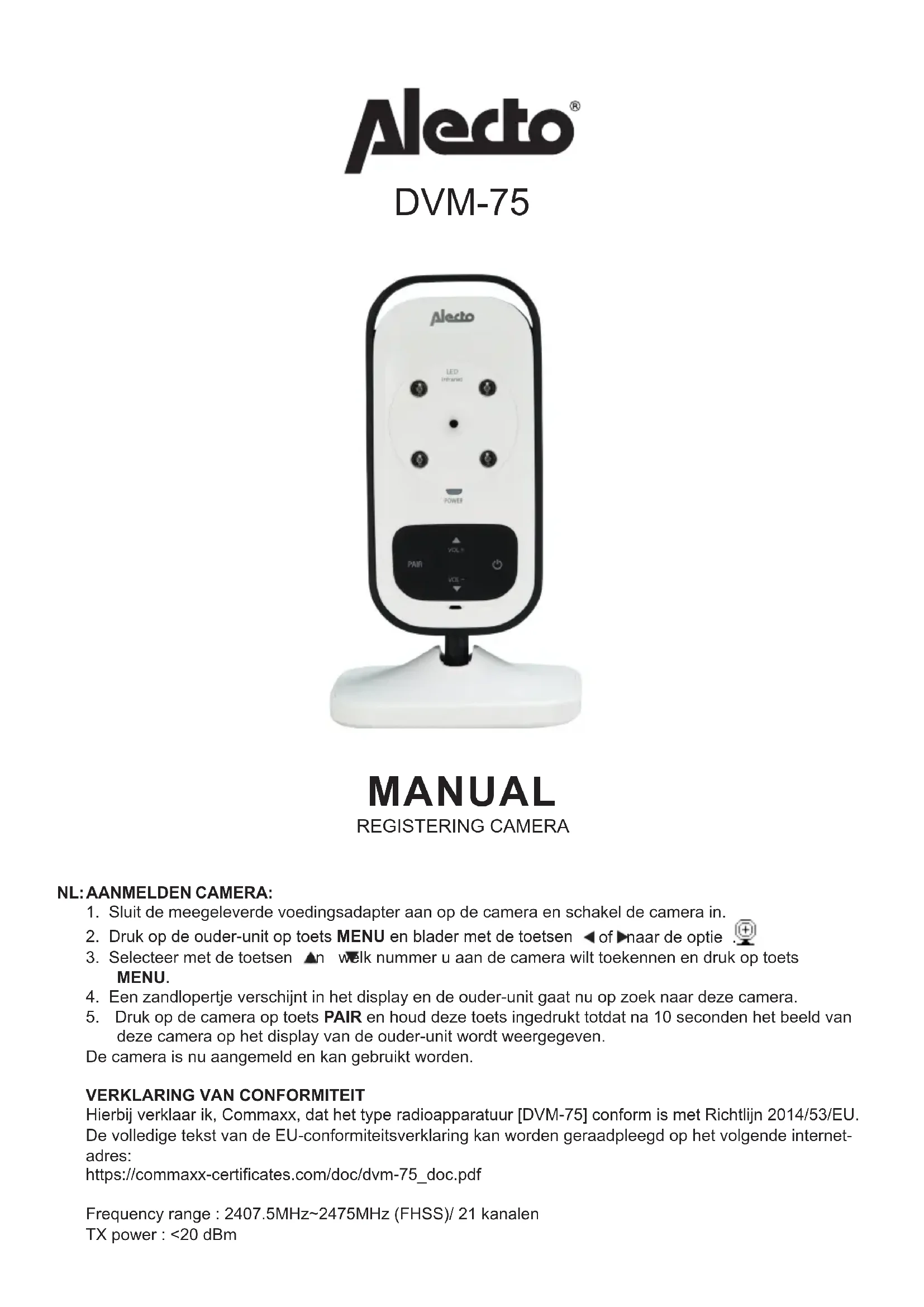 Le soussigné, Commaxx, déclare que l’équipement radioélectrique du type [Merk modelnummer] est conforme à la directive 2014/53/UE. Le texte complet de la déclaration UE de conformité est disponible à l’adresse internet suivante: https://commaxx-certicates.com/doc/dvm-75_doc.pdf Frequency range : 2407.5MHz~2475MHz (FHSS)/ 21 canal TX power : <20 dBm DE: KAMERA REGISTRIEREN: