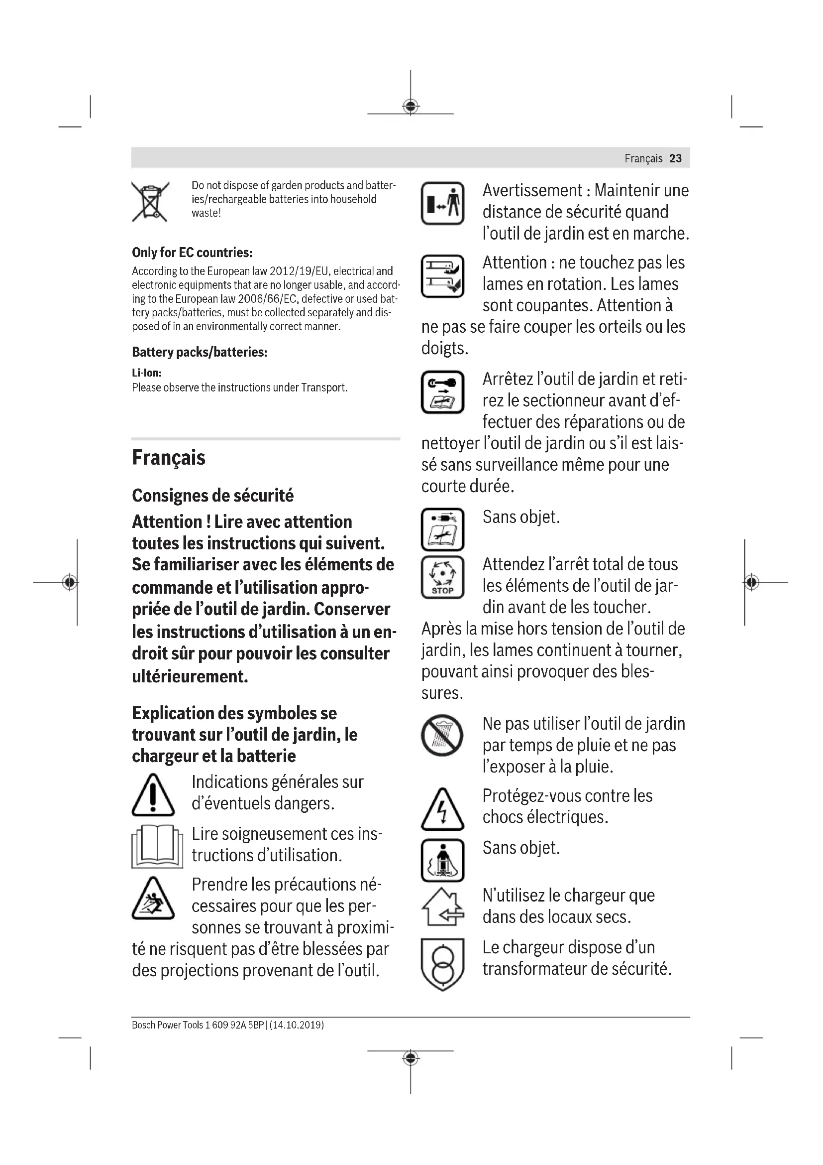 distance de sécurité quand l’outil de jardin est en marche. Attention: ne touchez pas les lames en rotation. Les lames sont coupantes. Attention à ne pas se faire couper les orteils ou les doigts. Arrêtez l’outil de jardin et reti- rez le sectionneur avant d’ef- fectuer des réparations ou de nettoyer l’outil de jardin ou s’il est lais- sé sans surveillance même pour une courte durée. Sans objet. Attendez l’arrêt total de tous les éléments de l’outil de jar- din avant de les toucher. Après la mise hors tension de l’outil de jardin, les lames continuent à tourner, pouvant ainsi provoquer des bles- sures. Ne pas utiliser l’outil de jardin par temps de pluie et ne pas l’exposer à la pluie. Protégez-vous contre les chocs électriques. Sans objet. N’utilisez le chargeur que dans des locaux secs. Le chargeur dispose d’un transformateur de sécurité. Bosch Power Tools 1 609 92A 5BP | (14.10.2019)24 | Français N’utilisez pas de nettoyeur haute pression ni de tuyau d’arrosage pour nettoyer l’outil de jar- din. Assurez-vous qu’il n’y ait pas d’animaux sauvages ou do- mestiques dans la zone dans laquelle l’outil de jardin doit être utili- sé. Les animaux sauvages ou domes- tiques peuvent être blessés pendant l’utilisation de la machine. Contrôlez soigneusement la zone d’utilisation de la machine et retirez pierres, bâtons, fils, os et corps étrangers. Lors de l’uti- lisation de la machine, assurez-vous qu’aucun animal sauvage ou domes- tique, ni des petits troncs d’arbre ne soient cachés dans l’herbe épaisse. Utilisation u Ne laissez jamais un enfant ou une autre personne n’ayant pas pris connaissance des instructions d’utili- sation se servir du produit. Il est pos- sible que les réglementations natio- nales limitent l’âge minimum de l’opérateur. Gardez le produit non utilisé hors de la portée des enfants. u Ne jamais permettre aux enfants ou personnes ne disposant pas des ca- pacités physiques, sensorielles ou mentales adaptées ou n’ayant pas l’expérience et/ou les connaissances nécessaires d’utiliser cet outil de jar- din. u Les enfants doivent être surveillés pour s’assurer qu’ils ne jouent pas avec le produit. u N’utilisez jamais l’outil de jardin lorsque des personnes, en particu- lier des enfants ou des animaux do- mestiques, se trouvent à proximité. u L’utilisateur de la tondeuse est res- ponsable des accidents et des dom- mages causés à autrui ou à leurs biens. u Ne portez pas de chaussures en ca- outchouc ouverts ou des sandalettes quand vous utilisez le produit. Portez toujours des chaussures fermées et des pantalons longs. u Inspectez soigneusement la surface à travailler et éliminez pierres, bâ- tons, fils métalliques, os et autres corps étrangers. u Avant de mettre l’appareil en marche, contrôlez toujours si les lames, les vis des lames et le sous- groupe de coupage ne sont pas usés ou endommagés. Remplacez les lames usées ou endommagées tou- jours en même temps que les vis des lames pour éviter tout balourd. u Ne tondez que de jour ou sous un bon éclairage artificiel. u Ne travaillez pas avec la tondeuse à gazon dans des conditions météoro- logiques défavorables et plus parti- culièrement en cas d’approche d’orage. u Si possible, n’utilisez pas l’outil de jardin lorsque l’herbe est mouillée. 1 609 92A 5BP | (14.10.2019) Bosch Power ToolsFrançais | 25 u Ne menez l’appareil qu’au pas, ne ja- mais courir. u N’utilisez jamais l’outil de jardin quand les équipements de sécurité sont défectueux, sans carter ou sans équipements de protection tels que par exemple le pare-chocs et/ou le bac de ramassage. u Pour votre propre protection, nous vous recommandons de porter une protection acoustique. u N’utilisez pas le produit si vous êtes fatigué ou sous l’emprise de drogues, d’alcool ou de médica- ments. u Travailler sur des talus peut être dan- gereux: – Ne tondez pas des pentes très abruptes. – Sur des pentes ou de l’herbe mouillée, faites attention à ne pas perdre l’équilibre. – Tondez toujours perpendiculaire- ment à la pente, jamais de haut en bas ou de bas en haut. – Faites très attention lors d’un changement de direction sur une pente. u Faites très attention en reculant ou en tirant l’outil de jardin vers vous. u Lors des travaux de tonte, poussez l’outil de jardin toujours vers l’avant et ne le tirez jamais vers vous. u Les lames doivent être totalement à l’arrêt quand vous devez incliner l’ou- til de jardin pour le transporter, quand vous traversez des surfaces autres que le gazon ou quand vous transportez l’outil de jardin entre deux surfaces à tondre. u N’inclinez pas l’outil de jardin lors du démarrage ou lorsque vous mettez le moteur en marche. u Mettez l’outil de jardin en marche conformément aux instructions du mode d’emploi et veillez à maintenir les pieds largement à l’écart des par- ties en rotation. u Tenez les pieds et les mains éloignés des parties rotatives de l’outil de jar- din. u Gardez une distance suffisante par rapport à la zone d’éjection lorsque vous travaillez avec l’outil de jardin. u Ne soulevez ni transportez jamais l’outil de jardin pendant que le mo- teur est en marche. u Faites attention lors du stockage à ce que les 4 roues de l’outil de jardin soient au sol. u Ne soulevez l’outil de jardin que par la poignée. Maniez la poignée avec prudence. u N’effectuez aucune modification sur le produit. Des modifications non autorisées peuvent s’avérer pré- judiciables à la sécurité de votre pro- duit et conduiront à une augmenta- tion des émissions de bruit et des vi- brations. Ramasser les feuilles La lame est formée de sorte à pouvoir ramasser les feuilles d’automne de Bosch Power Tools 1 609 92A 5BP | (14.10.2019)26 | Français votre jardin. Pour obtenir un résultat optimal avec cette fonction, respectez les in