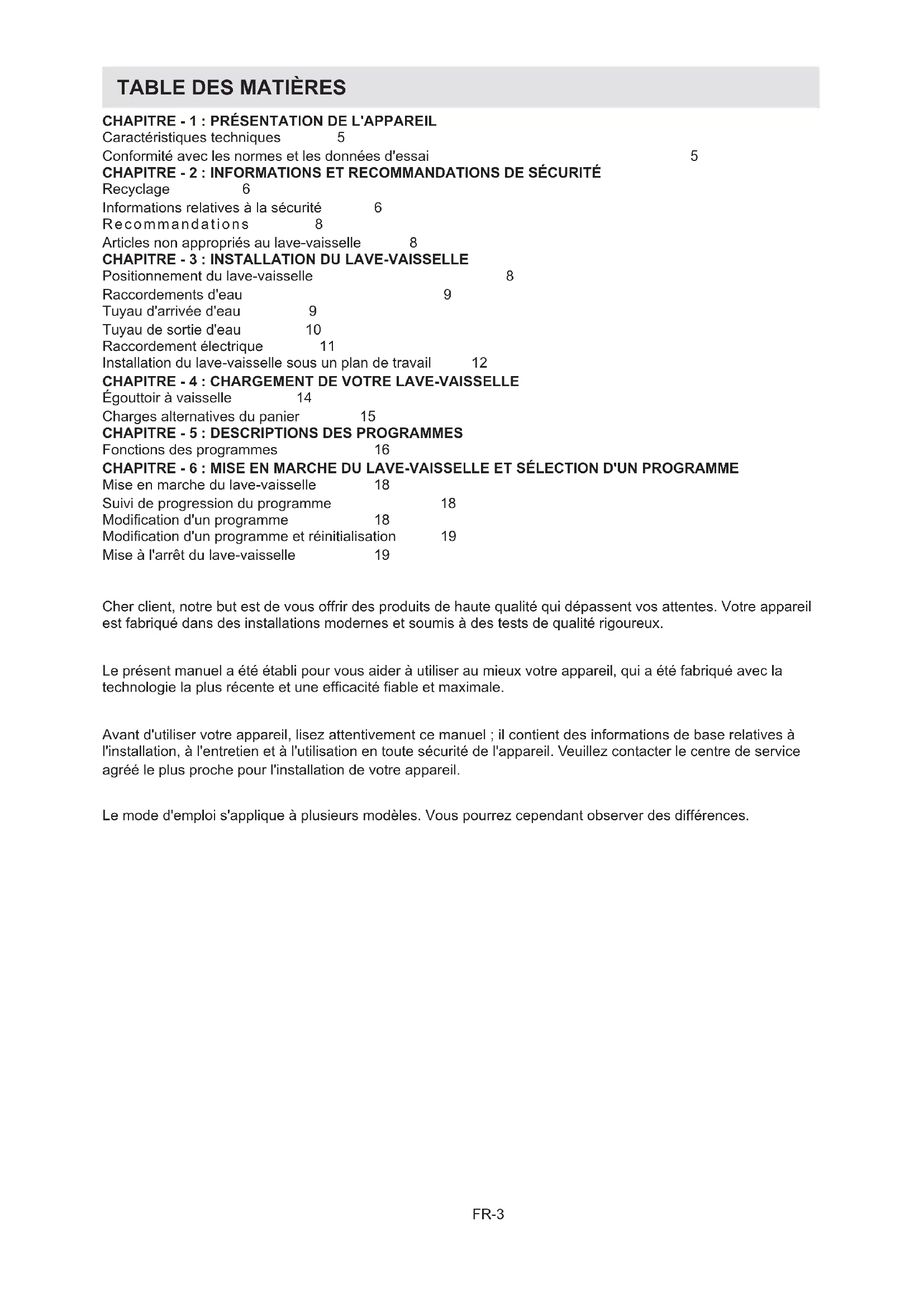 Fonctions des programmes 16 CHAPITRE - 6 : MISE EN MARCHE DU LAVE-VAISSELLE ET SÉLECTION D'UN PROGRAMME Mise en marche du lave-vaisselle 18 Suivi de progression du programme 18 Modication d'un programme 18 Modication d'un programme et réinitialisation 19 Mise à l'arrêt du lave-vaisselle 19 Cher client, notre but est de vous offrir des produits de haute qualité qui dépassent vos attentes. Votre appareil est fabriqué dans des installations modernes et soumis à des tests de qualité rigoureux. Le présent manuel a été établi pour vous aider à utiliser au mieux votre appareil, qui a été fabriqué avec la technologie la plus récente et une efcacité able et maximale. Avant d'utiliser votre appareil, lisez attentivement ce manuel ; il contient des informations de base relatives à l'installation, à l'entretien et à l'utilisation en toute sécurité de l'appareil. Veuillez contacter le centre de service agréé le plus proche pour l'installation de votre appareil. Le mode d'emploi s'applique à plusieurs modèles. Vous pourrez cependant observer des différences.