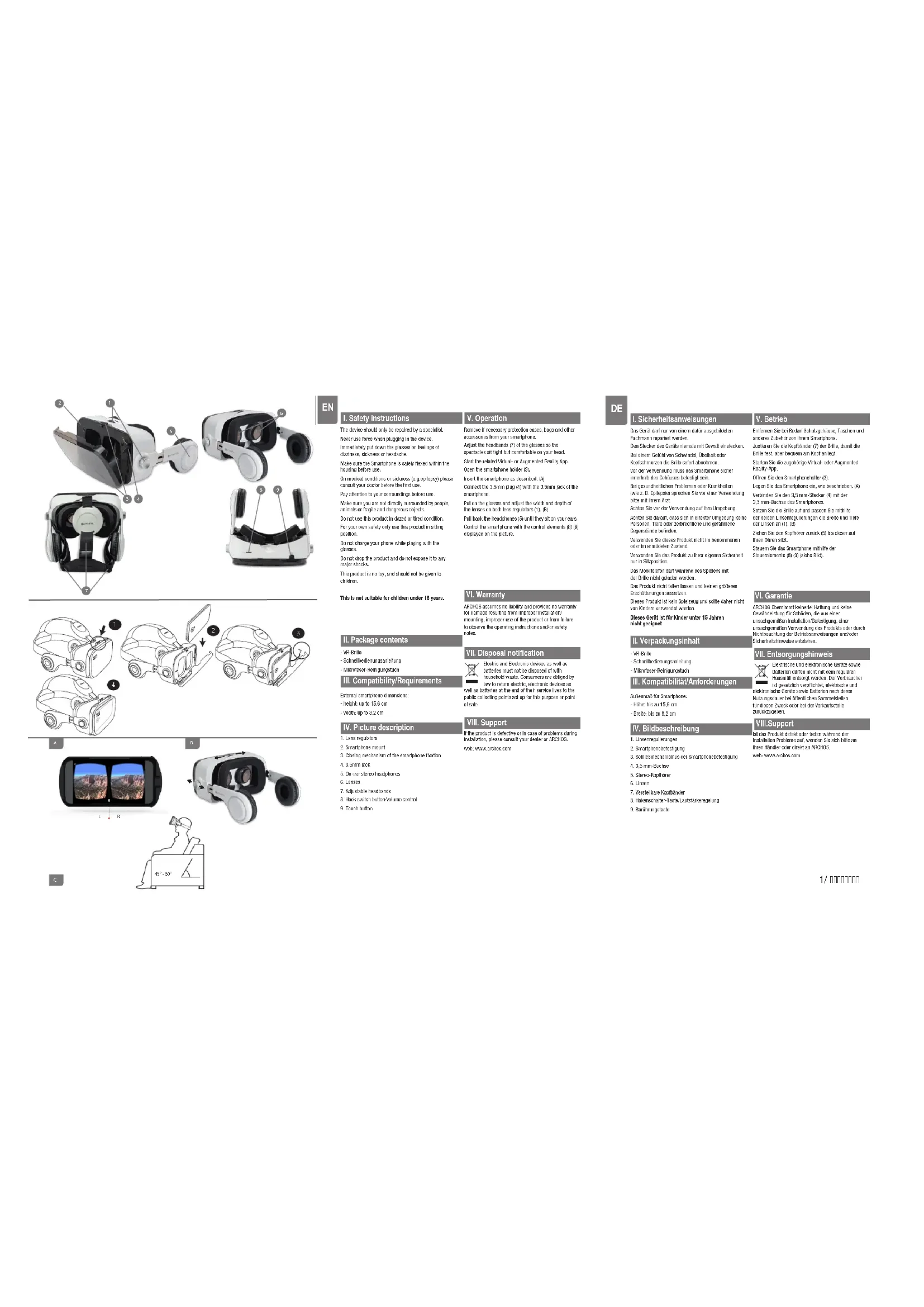 L’appareil ne doit être réparé que par un spécialiste.Ne pas forcer le connecteur.Cessez d’utiliser les VR glasses immédiatement dès que vous ressentez des vertiges, des maux de tête ou des nausées.Assurez-vous de bien installer le téléphone dans son compartiment avant toute utilisation.Si vous souffrez de pathologie ou maladie telle que l’épilepsie, consultez votre médecin traitant avant d’utiliser les VR Glasses.Faites attention à ce qui vous entoure avant d’utiliser le casque.Assurez-vous de ne pas être entouré de personnes, d’animaux ou d’objets dangereux ou fragiles.Ne pas utiliser les VR Glasses alors que vous êtes fatigué ou distrait.Pour votre sécurité, n’utilisez ce produit qu’en position assise.Ne pas recharger la batterie du téléphone alors que vous l’utilisez avec les VR Glasses.Ne pas jeter le produit et ne pas l’exposer à des chocs dangereux.Ce produit n’est pas un jouet et ne doit pas être laissé entre les mains d’enfants.Ce produit n’est pas adapté aux enfants de moins de 15 ans.- Lunettes de réalité virtuelle- Guide d’utilisation rapide- Chiffon de nettoyage en microfibreDimensions du téléphone :- hauteur : jusqu’à 15.6 cm- largeur : jusqu’à 8.2 cm1. Boutons de réglage des lentilles2. Emplacement du téléphone3. Fermeture de l’emplacement du téléphone4. Connecteur jack 3.5mm 5. Casque stéréo6. Lentilles7. Bandeau de maintien ajustable8. Bouton pour décrocher/raccrocher/volume 9. Bouton de sélection/bouton de tirEnlevez les éléments de protection des lunettes et du téléphone et tout autre accessoire.Ajustez le bandeau de maintien (7) de telle sorte que les lunettes soient bien fixées.Lancez l’application de réalité virtuelle désirée.Ouvrez l’emplacement réservé au télépone(3).Insérez le téléphone. (A)Connectez le câble de 3.5mm (4) avec la prise jack de votre téléphone.Portez les lunettes et ajustez les lentilles en largeur et en profondeur avec les boutons de réglage (1). (B)Ajustez le casque afin qu’il repose sur vos oreilles (5).Contrôlez le téléphone avec les boutons de volume et le bouton OK (8) (9).ARCHOS n’est pas responsable et ne fournit aucune garantie pour toute utilisation résultant d’une mauvaise installation, utilisation ou de toute incapacité à suivre les règles d’utilisation et les mesures de sécurité.