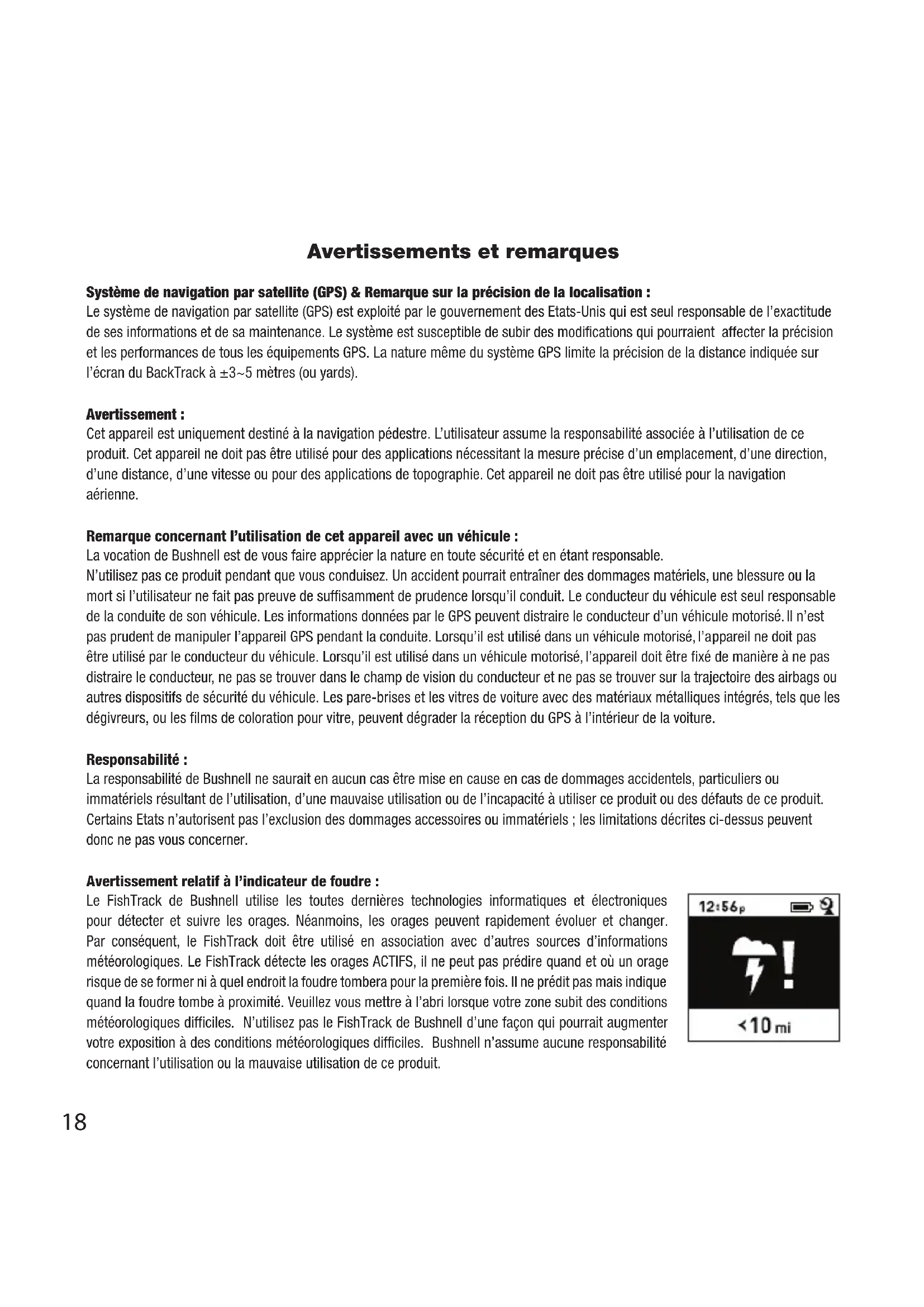 Cet appareil est uniquement destiné à la navigation pédestre. L’utilisateur assume la responsabilité associée à l’utilisation de ce produit. Cet appareil ne doit pas être utilisé pour des applications nécessitant la mesure précise d’un emplacement, d’une direction, d’une distance, d’une vitesse ou pour des applications de topographie. Cet appareil ne doit pas être utilisé pour la navigation aérienne. Remarque concernant l’utilisation de cet appareil avec un véhicule : La vocation de Bushnell est de vous faire apprécier la nature en toute sécurité et en étant responsable. N’utilisez pas ce produit pendant que vous conduisez. Un accident pourrait entraîner des dommages matériels, une blessure ou la mort si l’utilisateur ne fait pas preuve de suffisamment de prudence lorsqu’il conduit. Le conducteur du véhicule est seul responsable de la conduite de son véhicule. Les informations données par le GPS peuvent distraire le conducteur d’un véhicule motorisé. Il n’est pas prudent de manipuler l’appareil GPS pendant la conduite. Lorsqu’il est utilisé dans un véhicule motorisé, l’appareil ne doit pas être utilisé par le conducteur du véhicule. Lorsqu’il est utilisé dans un véhicule motorisé, l’appareil doit être fixé de manière à ne pas distraire le conducteur, ne pas se trouver dans le champ de vision du conducteur et ne pas se trouver sur la trajectoire des airbags ou autres dispositifs de sécurité du véhicule. Les pare-brises et les vitres de voiture avec des matériaux métalliques intégrés, tels que les dégivreurs, ou les films de coloration pour vitre, peuvent dégrader la réception du GPS à l’intérieur de la voiture. Responsabilité : La responsabilité de Bushnell ne saurait en aucun cas être mise en cause en cas de dommages accidentels, particuliers ou immatériels résultant de l’utilisation, d’une mauvaise utilisation ou de l’incapacité à utiliser ce produit ou des défauts de ce produit. Certains Etats n’autorisent pas l’exclusion des dommages accessoires ou immatériels ; les limitations décrites ci-dessus peuvent donc ne pas vous concerner. Avertissement relatif à l’indicateur de foudre : Le FishTrack de Bushnell utilise les toutes dernières technologies informatiques et électroniques pour détecter et suivre les orages. Néanmoins, les orages peuvent rapidement évoluer et changer. Par conséquent, le FishTrack doit être utilisé en association avec d’autres sources d’informations météorologiques. Le FishTrack détecte les orages ACTIFS, il ne peut pas prédire quand et où un orage risque de se former ni à quel endroit la foudre tombera pour la première fois. Il ne prédit pas mais indique quand la foudre tombe à proximité. Veuillez vous mettre à l’abri lorsque votre zone subit des conditions météorologiques difficiles. N’utilisez pas le FishTrack de Bushnell d’une façon qui pourrait augmenter votre exposition à des conditions météorologiques difficiles. Bushnell n’assume aucune responsabilité concernant l’utilisation ou la mauvaise utilisation de ce produit.19