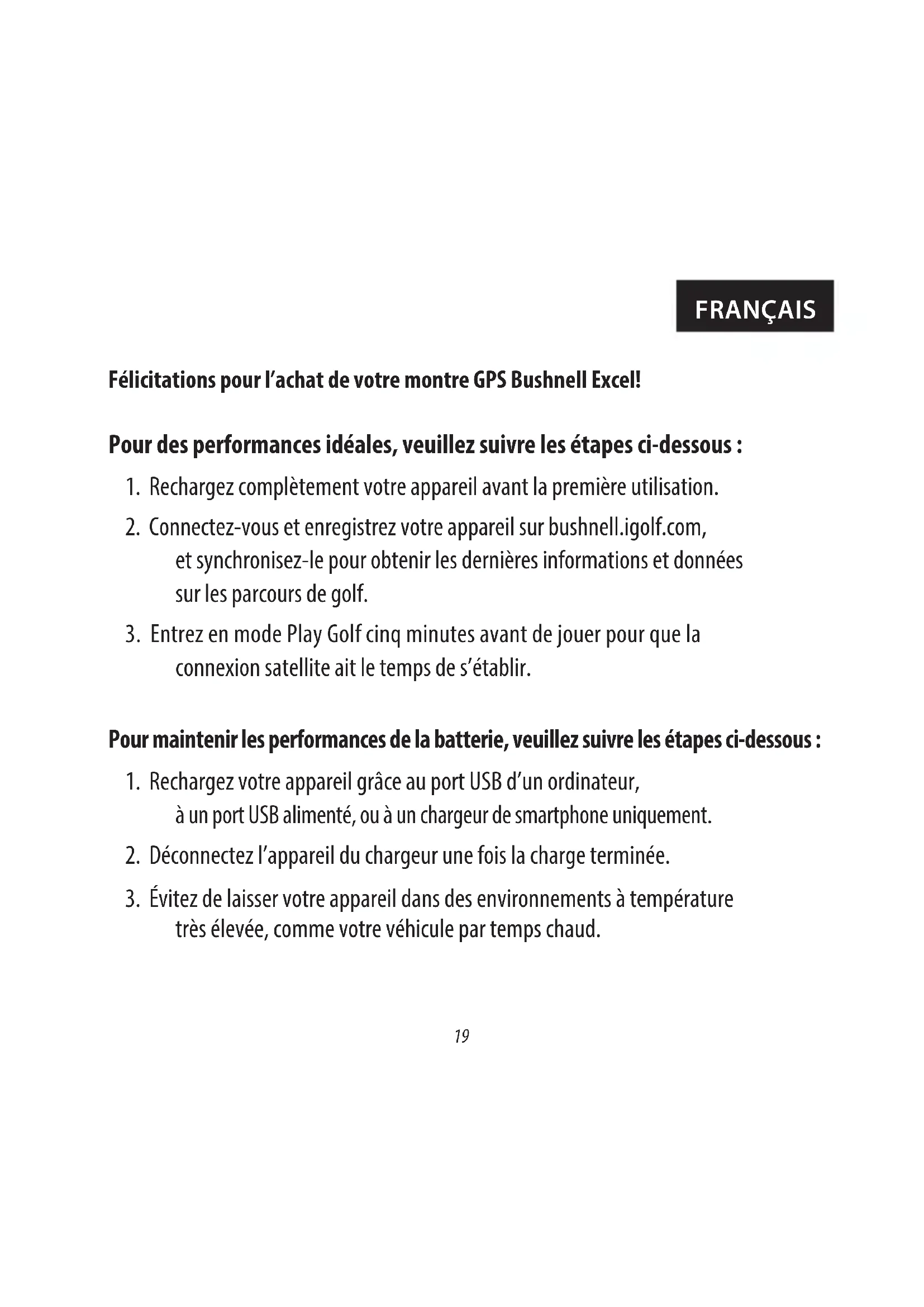 - Recyclez ou mettez l’appareil au rebut de la manière appropriée. Ne le mettez pas dans l’eau ou le feu. Limitation de responsabilité En utilisant ce produit, vous reconnaissez que Bushnell Outdoor Products ne sera pas tenu pour responsable juridiquement de tout blessure ou dommage inigé à vous ou toute personne ou propriété, causé par l’utilisation incorrecte de l’utilisateur et/ou un mauvais jugement lors de l’utilisation de ce produit. Remarque : consultez la garantie limitée pour prendre connaissance des autres limitations de notre responsabilité. Informations supplémentaires Le Global Positioning System (GPS), un réseau de 32satellites qui orbitent autour de la Terre, est exploité et maintenu par le gouvernement américain. Cet appareil GPS a besoin de l’acquisition d’au moins troissatellites pour déterminer votre position avec précision. Tout changement apporté au système par le gouvernement peut aecter la précision etlesperformances de ce produit. Site Web Bushnell Golf GPS www.bushnellgolf.com ou www.bushnellgolf.eu est la meilleure ressource en ligne pour tous les propriétaires de produits GPS Golf, comprenant un support produit, une FAQ, etc. Ces sites servent également de portail pour accéder aux chiers de terrain GPS iGolf.com à utiliser avec ces produits Bushnell. Il n’est pas obligatoire d’enregistrer votre montre Excel via www.bushnell.igolf.com, mais l’enregistrement vous donne accès aux données de terrain GPS les plus récentes.32