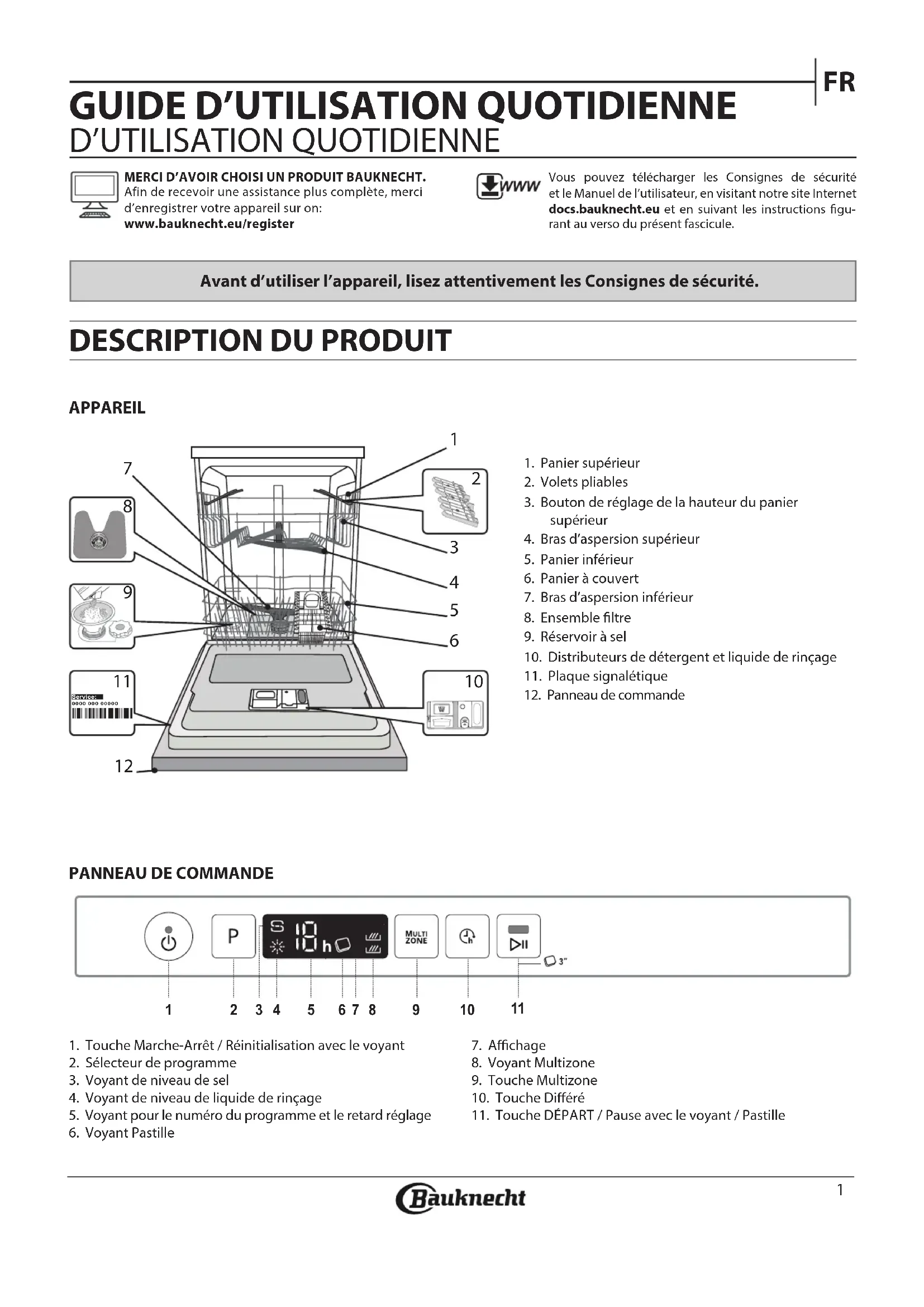 PANNEAU DE COMMANDEMERCI D’AVOIR CHOISI UN PRODUIT BAUKNECHT. Afin de recevoir une assistance plus complète, merci d’enregistrer votre appareil sur on: www.bauknecht.eu/registerVous pouvez télécharger les Consignes de sécurité et le Manuel de l’utilisateur, en visitant notre site Internet docs.bauknecht.eu et en suivant les instructions gu-rant au verso du présent fascicule.1. Panier supérieur2. Volets pliables3. Bouton de réglage de la hauteur du panier supérieur4. Bras d’aspersion supérieur5. Panier inférieur6. Panier à couvert7. Bras d’aspersion inférieur8. Ensemble ltre9. Réservoir à sel10. Distributeurs de détergent et liquide de rinçage11. Plaque signalétique12. Panneau de commande1. Touche Marche-Arrêt / Réinitialisation avec le voyant2. Sélecteur de programme3. Voyant de niveau de sel4. Voyant de niveau de liquide de rinçage5. Voyant pour le numéro du programme et le retard réglage6. Voyant Pastille7. Achage8. Voyant Multizone9. Touche Multizone10. Touche Diéré11. Touche DÉPART / Pause avec le voyant / Pastille0000 000 00000 Service: