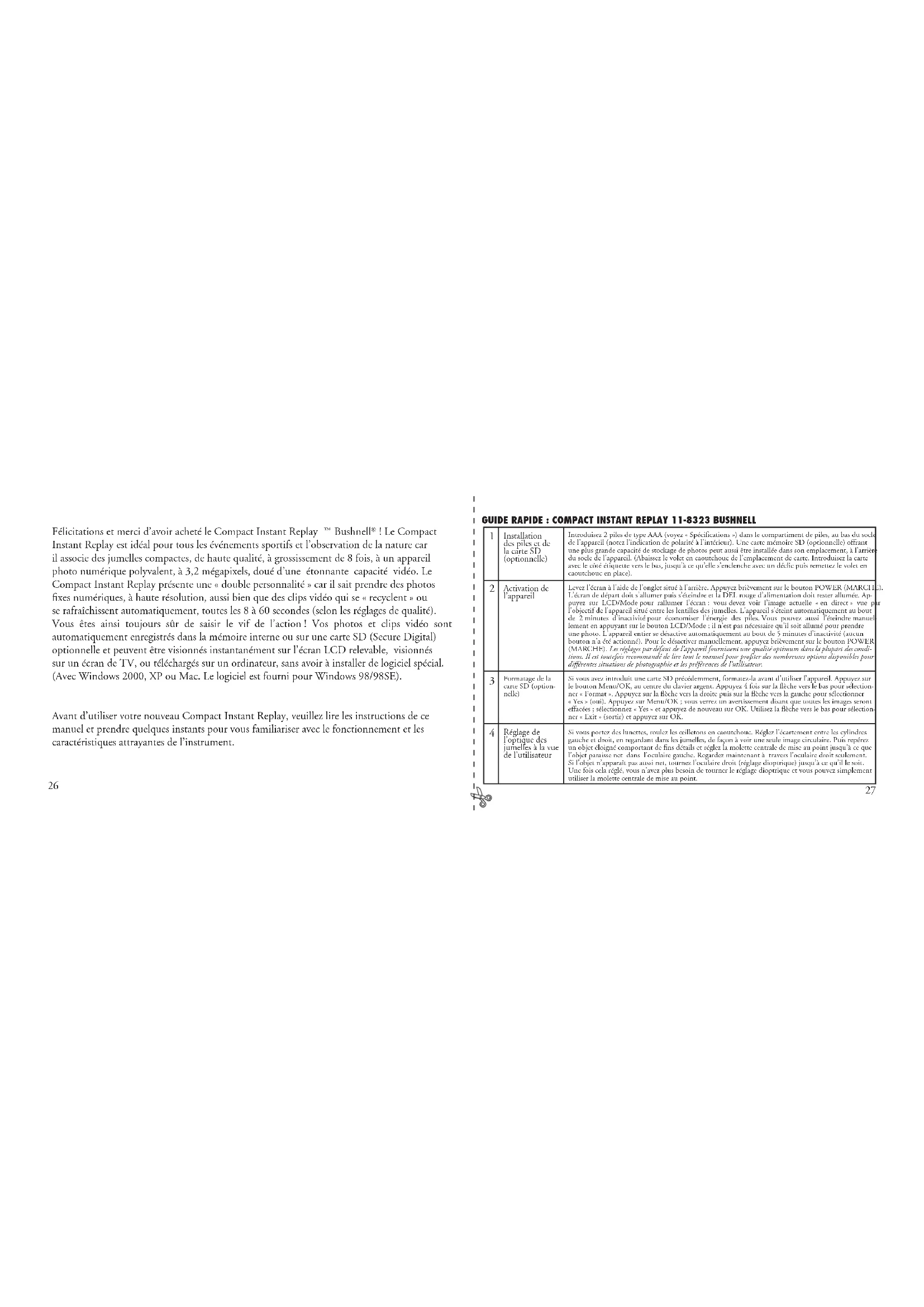 ! Le Compact Instant Replay est idéal pour tous les événements sportifs et l’observation de la nature car il associe des jumelles compactes, de haute qualité, à grossissement de 8 fois, à un appareil photo numérique polyvalent, à 3,2 mégapixels, doué d’une étonnante capacité vidéo. Le Compact Instant Replay présente une « double personnalité » car il sait prendre des photos fixes numériques, à haute résolution, aussi bien que des clips vidéo qui se « recyclent » ou se rafraîchissent automatiquement, toutes les 8 à 60 secondes (selon les réglages de qualité). Vous êtes ainsi toujours sûr de saisir le vif de l’action ! Vos photos et clips vidéo sont automatiquement enregistrés dans la mémoire interne ou sur une carte SD (Secure Digital) optionnelle et peuvent être visionnés instantanément sur l’écran LCD relevable, visionnés sur un écran de TV, ou téléchargés sur un ordinateur, sans avoir à installer de logiciel spécial. (Avec Windows 2000, XP ou Mac. Le logiciel est fourni pour Windows 98/98SE). Avant d’utiliser votre nouveau Compact Instant Replay, veuillez lire les instructions de ce manuel et prendre quelques instants pour vous familiariser avec le fonctionnement et les caractéristiques attrayantes de l’instrument. GUIDE RAPIDE : COMPACT INSTANT REPLAY 11-8323 BUSHNELL