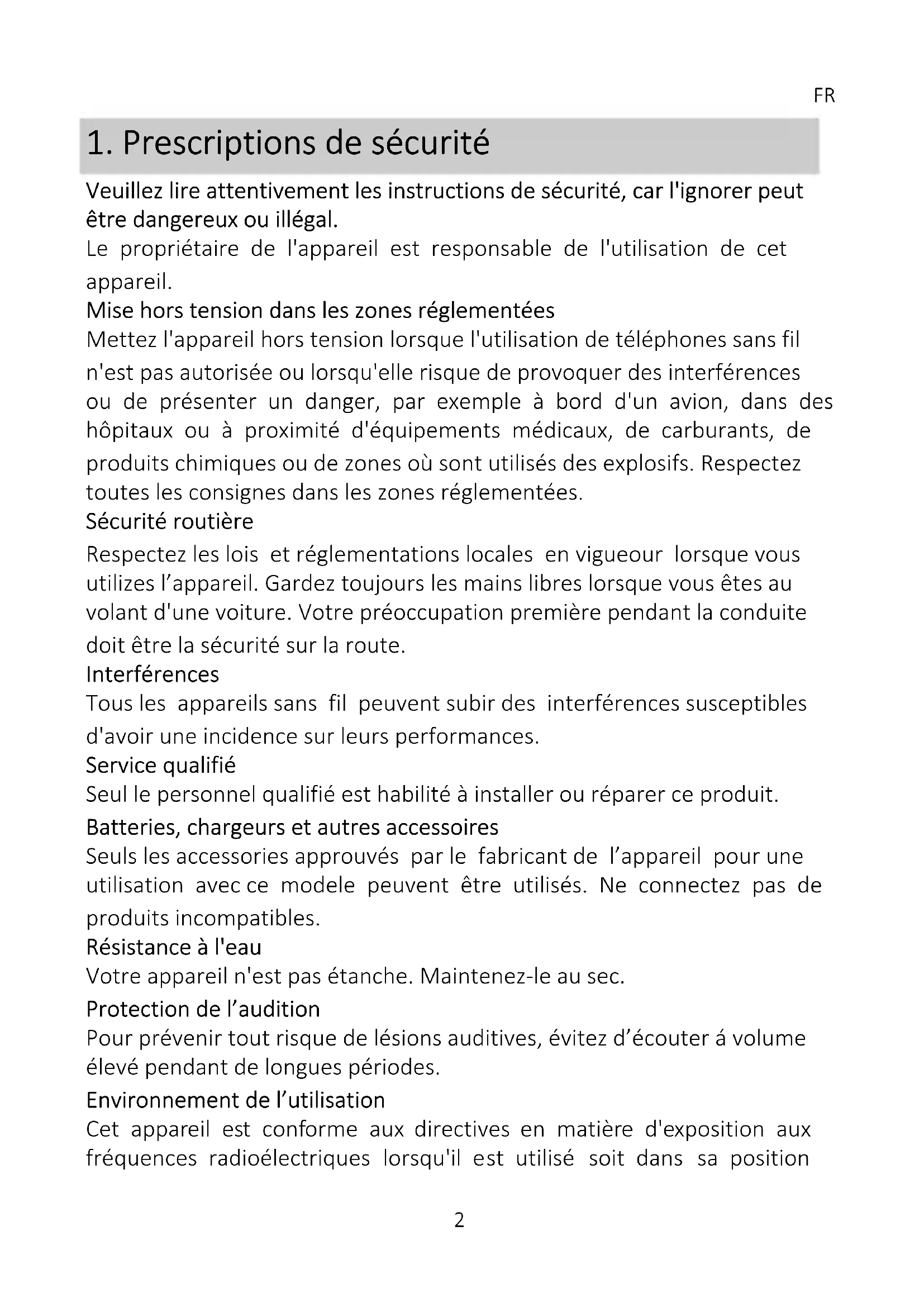 Veuillez lire attentivement les instructions de sécurité, car l'ignorer peut être dangereux ou illégal. Le propriétaire de l'appareil est responsable de l'utilisation de cet appareil. Mise hors tension dans les zones réglementées Mettez l'appareil hors tension lorsque l'utilisation de téléphones sans fil n'est pas autorisée ou lorsqu'elle risque de provoquer des interférences ou de présenter un danger, par exemple à bord d'un avion, dans des hôpitaux ou à proximité d'équipements médicaux, de carburants, de produits chimiques ou de zones où sont utilisés des explosifs. Respectez toutes les consignes dans les zones réglementées. Sécurité routière Respectez les lois et réglementations locales en vigueour lorsque vous utilizes l’appareil. Gardez toujours les mains libres lorsque vous êtes au volant d'une voiture. Votre préoccupation première pendant la conduite doit être la sécurité sur la route. Interférences Tous les appareils sans fil peuvent subir des interférences susceptibles d'avoir une incidence sur leurs performances. Service qualifié Seul le personnel qualifié est habilité à installer ou réparer ce produit. Batteries, chargeurs et autres accessoires Seuls les accessories approuvés par le fabricant de l’appareil pour une utilisation avec ce modele peuvent être utilisés. Ne connectez pas de produits incompatibles. Résistance à l'eau Votre appareil n'est pas étanche. Maintenez-le au sec. Protection de l’audition Pour prévenir tout risque de lésions auditives, évitez d’écouter á volume élevé pendant de longues périodes. Environnement de l’utilisation Cet appareil est conforme aux directives en matière d'exposition aux fréquences radioélectriques lorsqu'il est utilisé soit dans sa positionFR