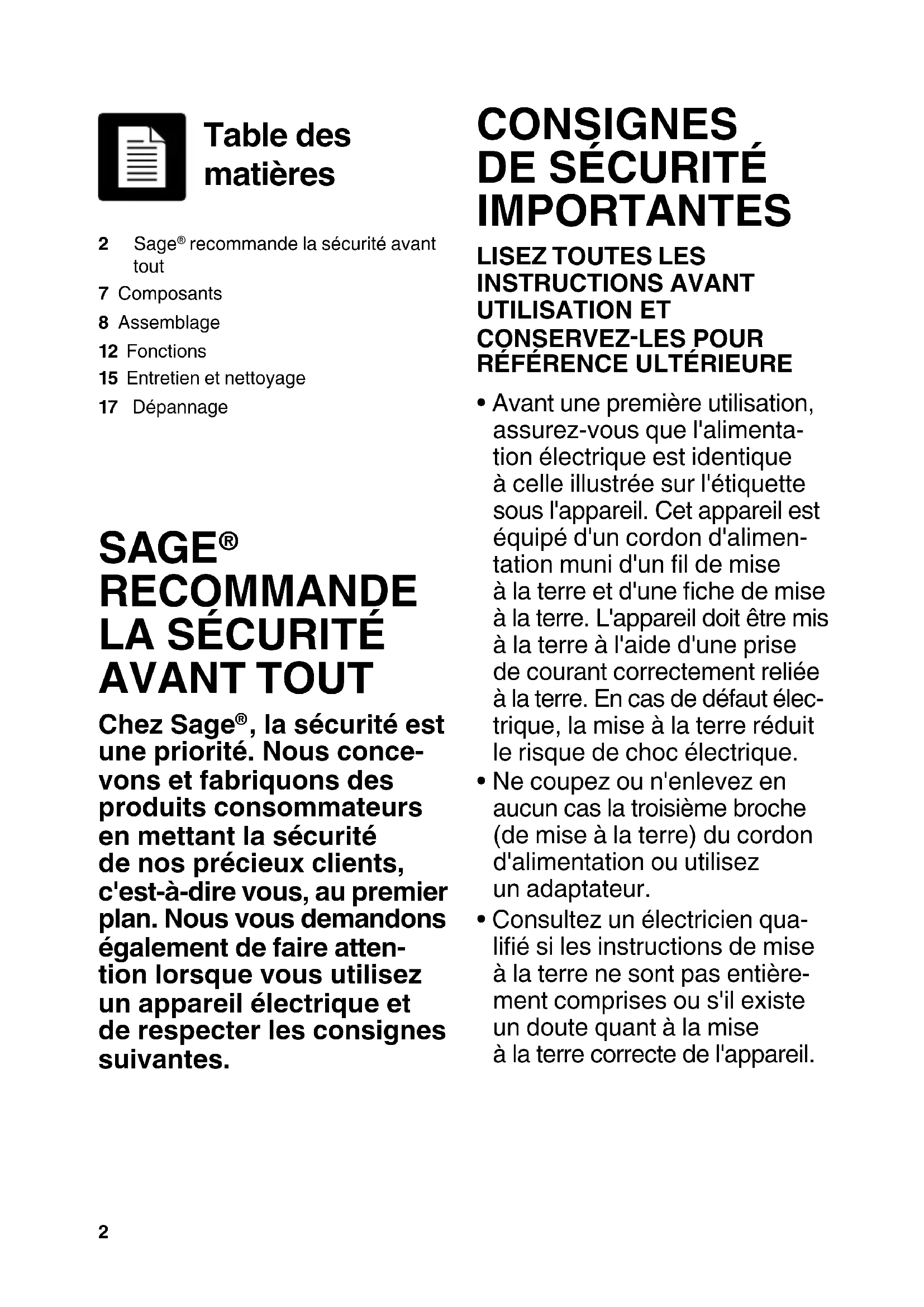 - Consultez un électricien qua- lié si les instructions de mise à la terre ne sont pas entière- ment comprises ou s'il existe un doute quant à la mise à la terre correcte de l'appareil. Table des matières 2 Sage recommande la sécurité avant tout 7 Composants8 Assemblage12 Fonctions15 Entretien et nettoyage17 Dépannage3