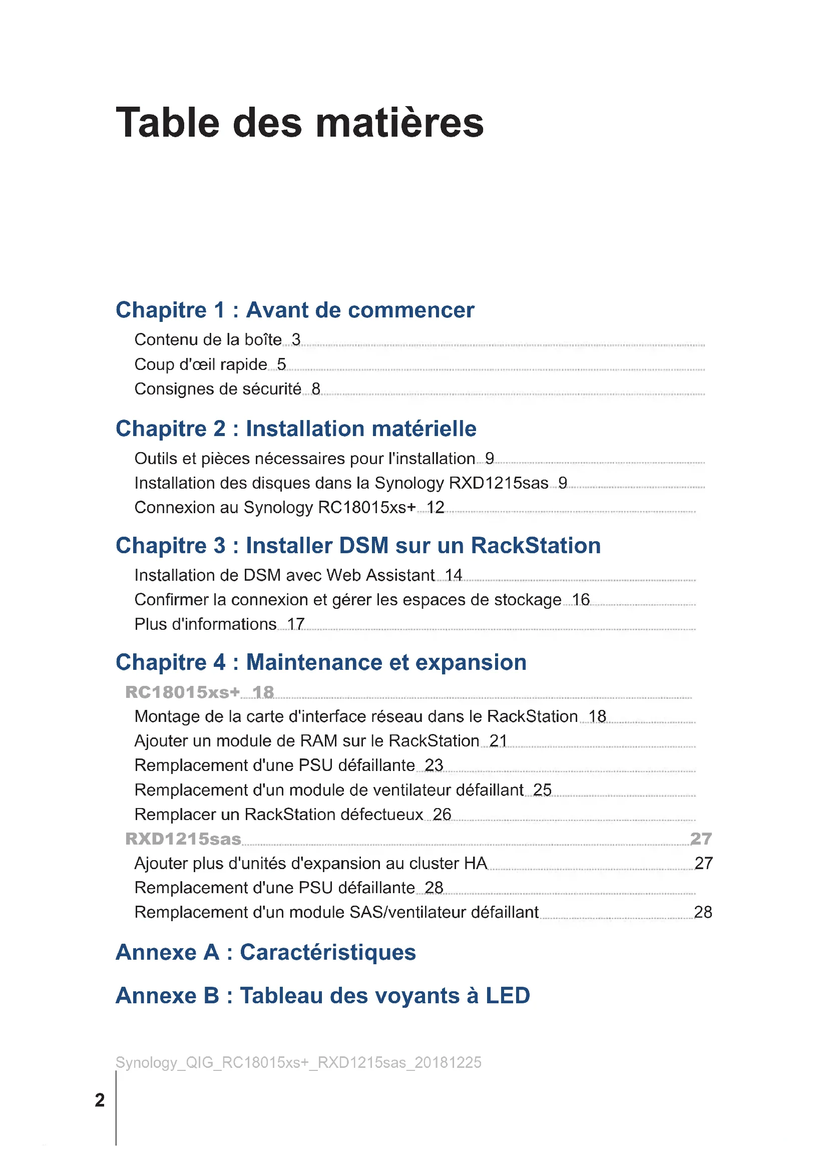 Chapitre Table des matières Nous vous remercions d'avoir acheté le Synology RackStation RC18015xs+ / l'unité d'expansion RXD1215sas ! Avant d'installer votre nouveau RackStation/unité d'expansion, veuillez vérier le contenu du colis an de vous assurer que vous avez reçu les éléments ci-dessous.* Veillez également à lire attentivement les instructions de sécurité pour éviter de vous blesser ou d'endommager vos produits Synology. Dans les chapitres suivant, nous vous expliquerons comment congurer et commencer à utiliser le RackStation et les unités d'expansion.* Le Synology RackStation RC18015xs+ et l'unité d'expansion RXD1215sas sont vendus séparément.Remarque : Le RC18015xs+ est conçu pour fonctionner en tant que cluster high-availability (HA). Deux RC18015xs+ et au moins une unité d'expansion RXD1215sas sont nécessaires pour congurer et congurer l'ensemble du système et le faire fonctionner normalement. Contenu de la boîte RC18015xs+ Unité principale x 1Cordon d'alimentation secteur x 2Guide d'installation rapide x 1 Avant de commencer4
