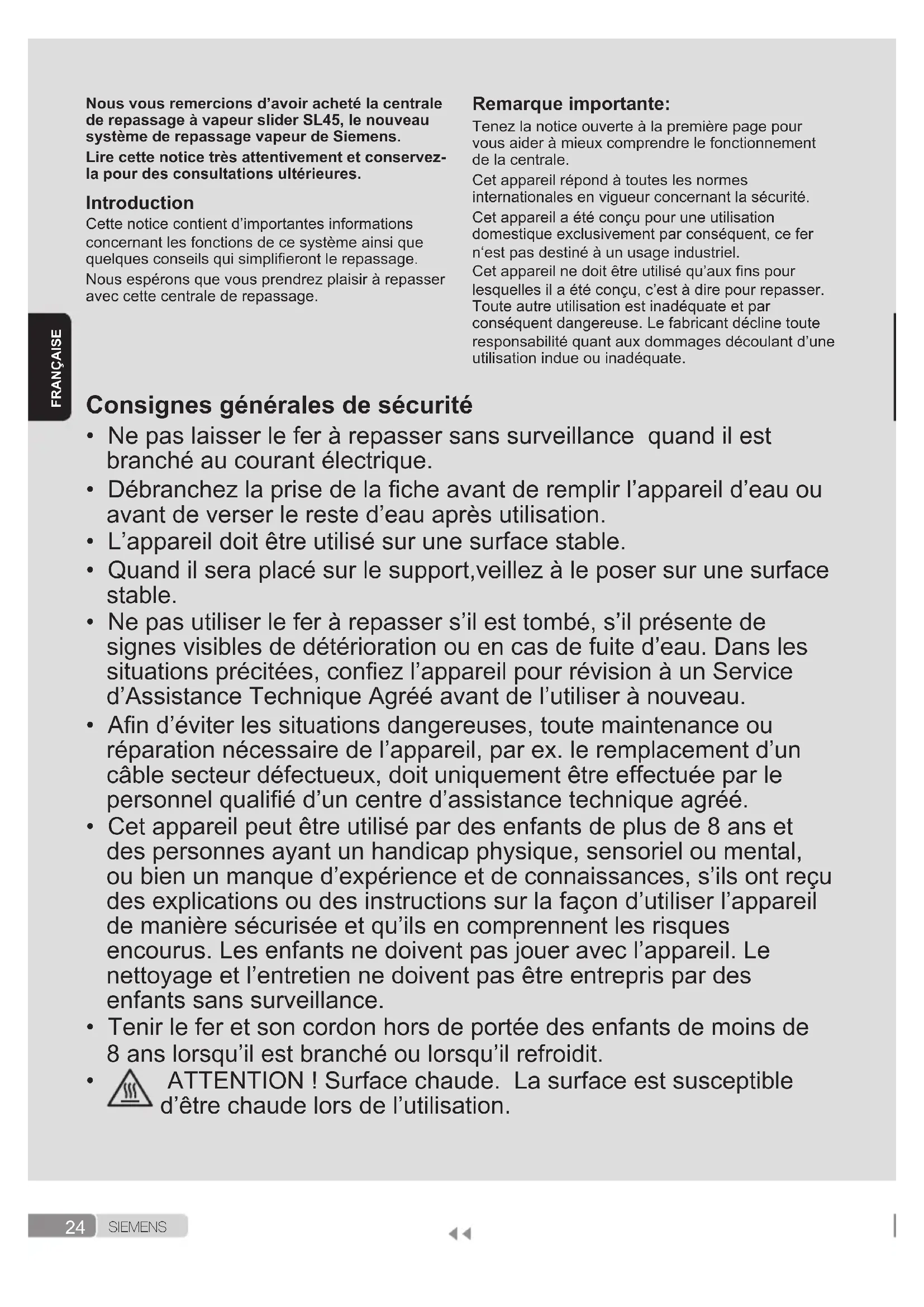 Cet appareil atteint des températures élevées et produit de la vapeur pendant son utilisation, il faudra par conséquent être très prudent pour éviter tous risques de brûlures dans le cas d’une utilisation incorrecte. Le tuyau à vapeur, la station de base, la plaque métallique à la base du repose-fer amovible (2) et le fer lui-même peuvent devenir chauds pendant l’utilisation. Ceci est normal. Ne pas diriger la vapeur vers les personnes ni vers des animaux. Evitez le contact du cordon d‘alimentation avec la semelle lorsqu‘elle est chaude N'oubliez pas que le système peut continuer à libérer de la vapeur pendant quelque temps après avoir relâché la gâchette de vapeur. Il s'agit d'une fonction normale.26 S I E M E N S