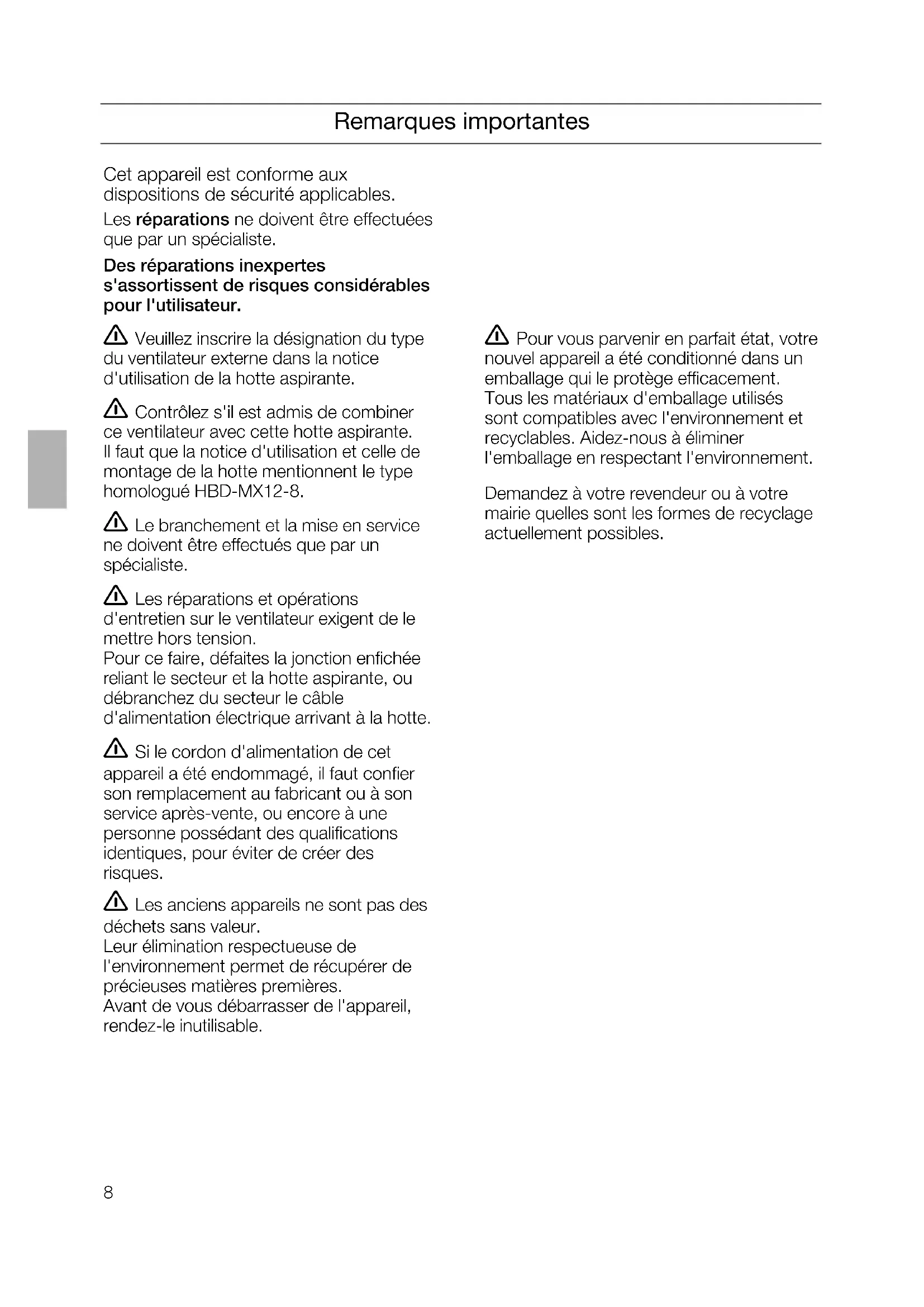 with the extension cable. The additional cover on the plug must always be attached and closed for safety reasons.8 Remarques importantes Cet appareil est conforme aux dispositions de sécurité applicables. Les réparations ne doivent être effectuées que par un spécialiste. Des réparations inexpertes s'assortissent de risques considérables pour l'utilisateur. Veuillez inscrire la désignation du type du ventilateur externe dans la notice d'utilisation de la hotte aspirante. Contrôlez s'il est admis de combiner ce ventilateur avec cette hotte aspirante. Il faut que la notice d'utilisation et celle de montage de la hotte mentionnent le type homologué HBD-MX12-8. Le branchement et la mise en service ne doivent être effectués que par un spécialiste. Les réparations et opérations d'entretien sur le ventilateur exigent de le mettre hors tension. Pour ce faire, défaites la jonction enfichée reliant le secteur et la hotte aspirante, ou débranchez du secteur le câble d'alimentation électrique arrivant à la hotte. Si le cordon d'alimentation de cet appareil a été endommagé, il faut confier son remplacement au fabricant ou à son service après-vente, ou encore à une personne possédant des qualifications identiques, pour éviter de créer des risques. Les anciens appareils ne sont pas des déchets sans valeur. Leur élimination respectueuse de l'environnement permet de récupérer de précieuses matières premières. Avant de vous débarrasser de l'appareil, rendez-le inutilisable. Dieses Gerät entspricht den einschlägigen Sicherheitsbestimmungen. Reparaturen dürfen nur von Fachkräften durchgeführt werden. Durch unsachgemäße Reparaturen können erhebliche Gefahren für den Benutzer entstehen. Pour vous parvenir en parfait état, votre nouvel appareil a été conditionné dans un emballage qui le protège efficacement. Tous les matériaux d'emballage utilisés sont compatibles avec l'environnement et recyclables. Aidez-nous à éliminer l'emballage en respectant l'environnement. Demandez à votre revendeur ou à votre mairie quelles sont les formes de recyclage actuellement possibles.9 Avant le montage