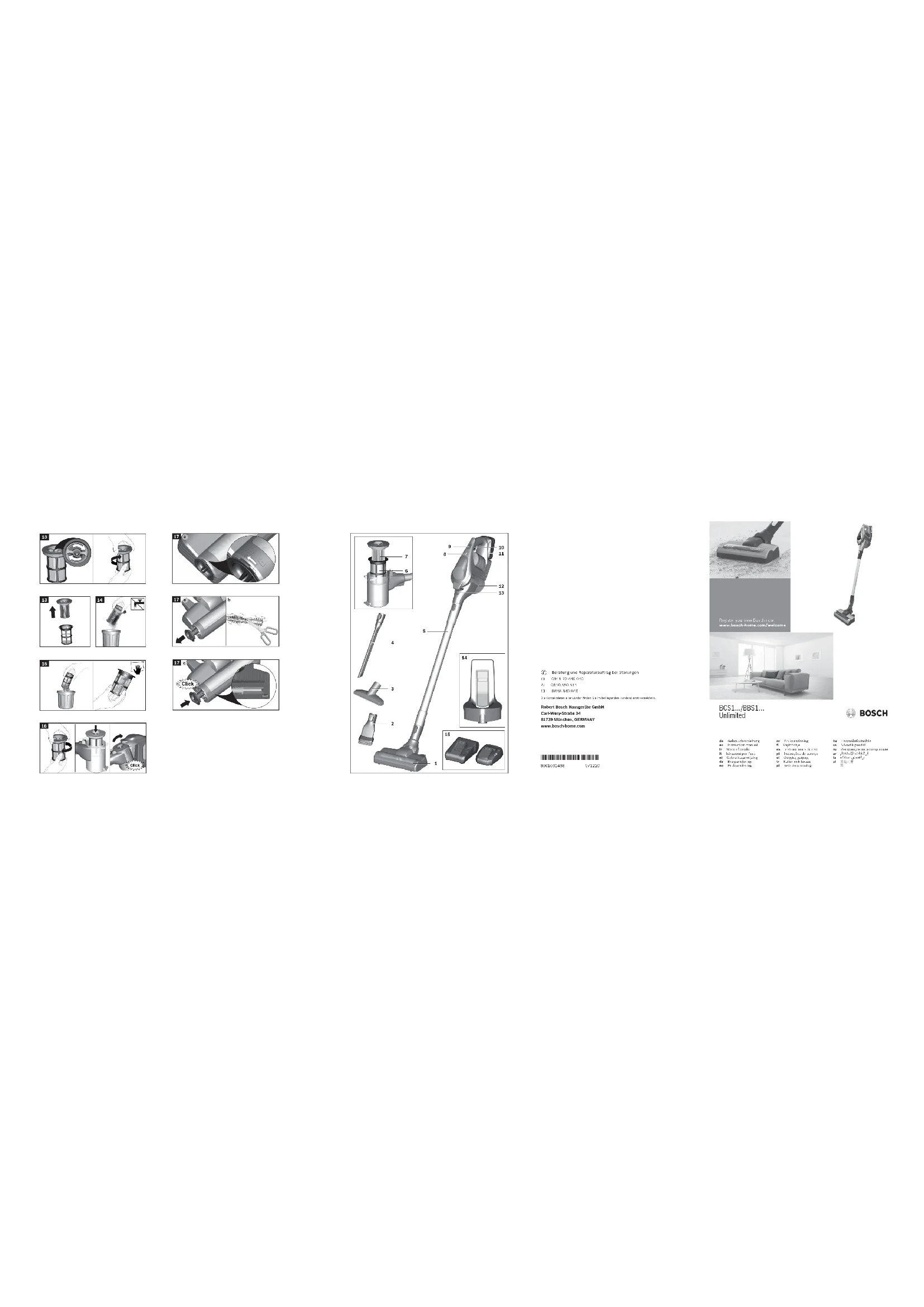 Caution: Do not use abrasive, glass-cleaning or all-purpose cleaning products. Never immerse the vacuum cleaner in water. Subject to technical modifications. Battery state indicator Operating status LED indicator Normal mode Green LED lit Turbo mode Green LED flashing quickly Battery capacity redu- ced by 20% Red LED flashing slowly Battery flat LED off Over-/undertemperature protection Red LED remains lit continuously for 10 se- conds, then goes out47 Nous vous remercions d'avoir choisi un aspirateur Bosch de la série BCS1/BBS1 « Unlimited ». Cette notice d'utilisation présente différents modèles de la série BCS1/BBS1 « Unlimited ». Il se peut donc que l'ensemble des caractéristiques et des fonctions décrites ici ne concernent pas toutes votre aspirateur. Utilisez exclusivement les accessoires d'origine Bosch. Ils sont spécialement conçus pour votre aspirateur, pour vous permettre d'obtenir un résultat de nettoyage optimal. Veuillez déplier les volets illustrés ! 1 Brosse pour sols avec électrobrosse 2 Brosse aspirateur pour meuble 2-en-1 avec suceur ameublement 3 Suceur ameublement XXL* 4 Suceur long flexible 5 Tuyau d'aspiration 6 Filtre à peluche 7 Filtre à cartouche 8 Indicateur d'état de charge de la batterie 9 Interrupteur Turbo 10 Interrupteur Marche / Arrêt 11 Batterie* 12 Collecteur de poussières 13 Touche de déverrouillage du collecteur de pous- sières 14 Cage murale* 15 Chargeur rapide* Avant la première utilisation Fig.
