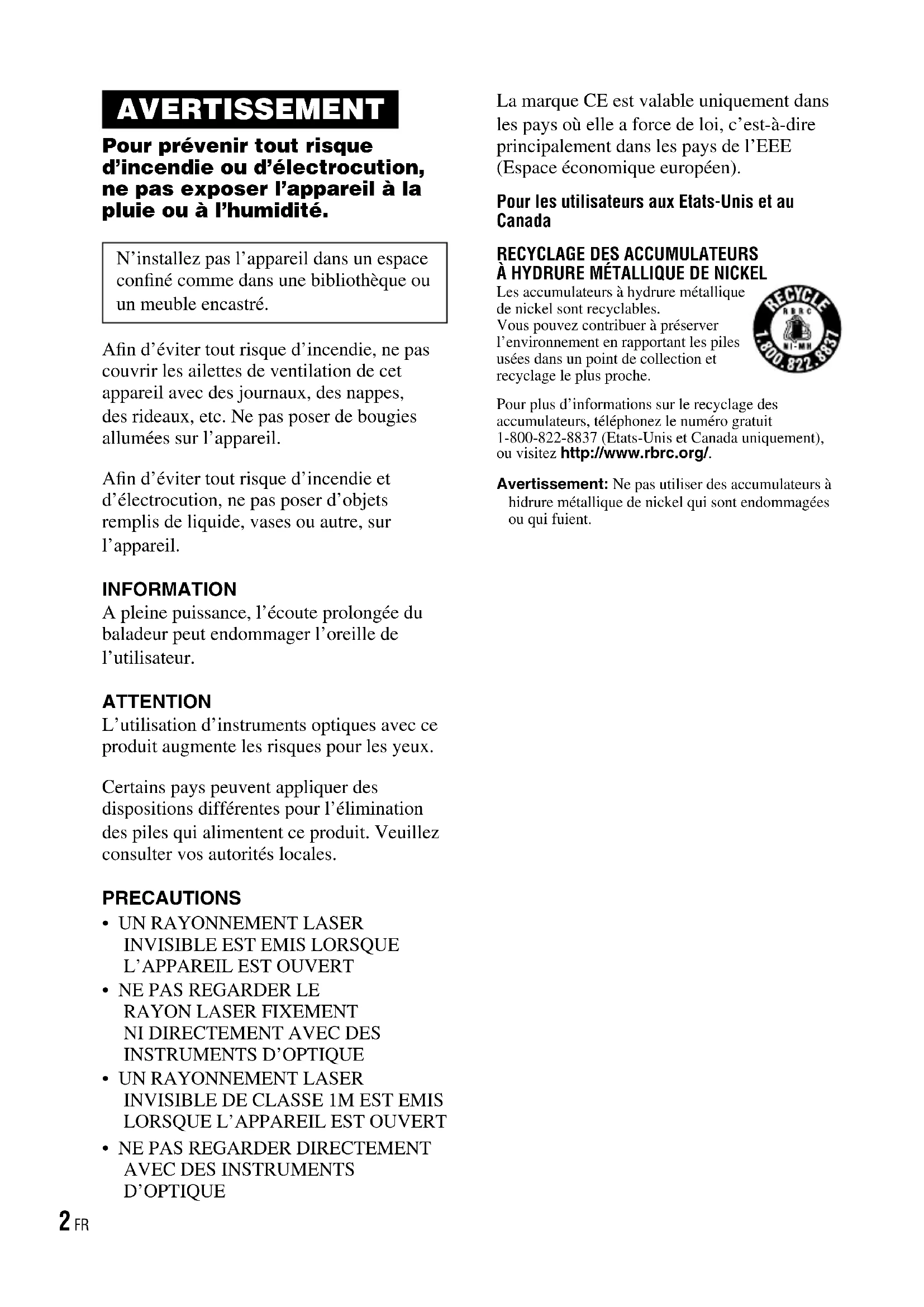 Les accumulateurs à hydrure métallique de nickel sont recyclables. Vous pouvez contribuer à préserver l’environnement en rapportant les piles usées dans un point de collection et recyclage le plus proche.Pour plus d’informations sur le recyclage des accumulateurs, téléphonez le numéro gratuit 1-800-822-8837 (Etats-Unis et Canada uniquement), ou visitez http://www.rbrc.org/.Avertissement: Ne pas utiliser des accumulateurs à hidrure métallique de nickel qui sont endommagées ou qui fuient. AVERTISSEMENT Pour prévenir tout risque d’incendie ou d’électrocution, ne pas exposer l’appareil à la pluie ou à l’humidité. N’installez pas l’appareil dans un espace confiné comme dans une bibliothèque ou un meuble encastré. Afin d’éviter tout risque d’incendie, ne pas couvrir les ailettes de ventilation de cet appareil avec des journaux, des nappes, des rideaux, etc. Ne pas poser de bougies allumées sur l’appareil. Afin d’éviter tout risque d’incendie et d’électrocution, ne pas poser d’objets remplis de liquide, vases ou autre, sur l’appareil. INFORMATION A pleine puissance, l’écoute prolongée du baladeur peut endommager l’oreille de l’utilisateur. ATTENTION L’utilisation d’instruments optiques avec ce produit augmente les risques pour les yeux. Certains pays peuvent appliquer des dispositions différentes pour l’élimination des piles qui alimentent ce produit. Veuillez consulter vos autorités locales. PRECAUTIONS