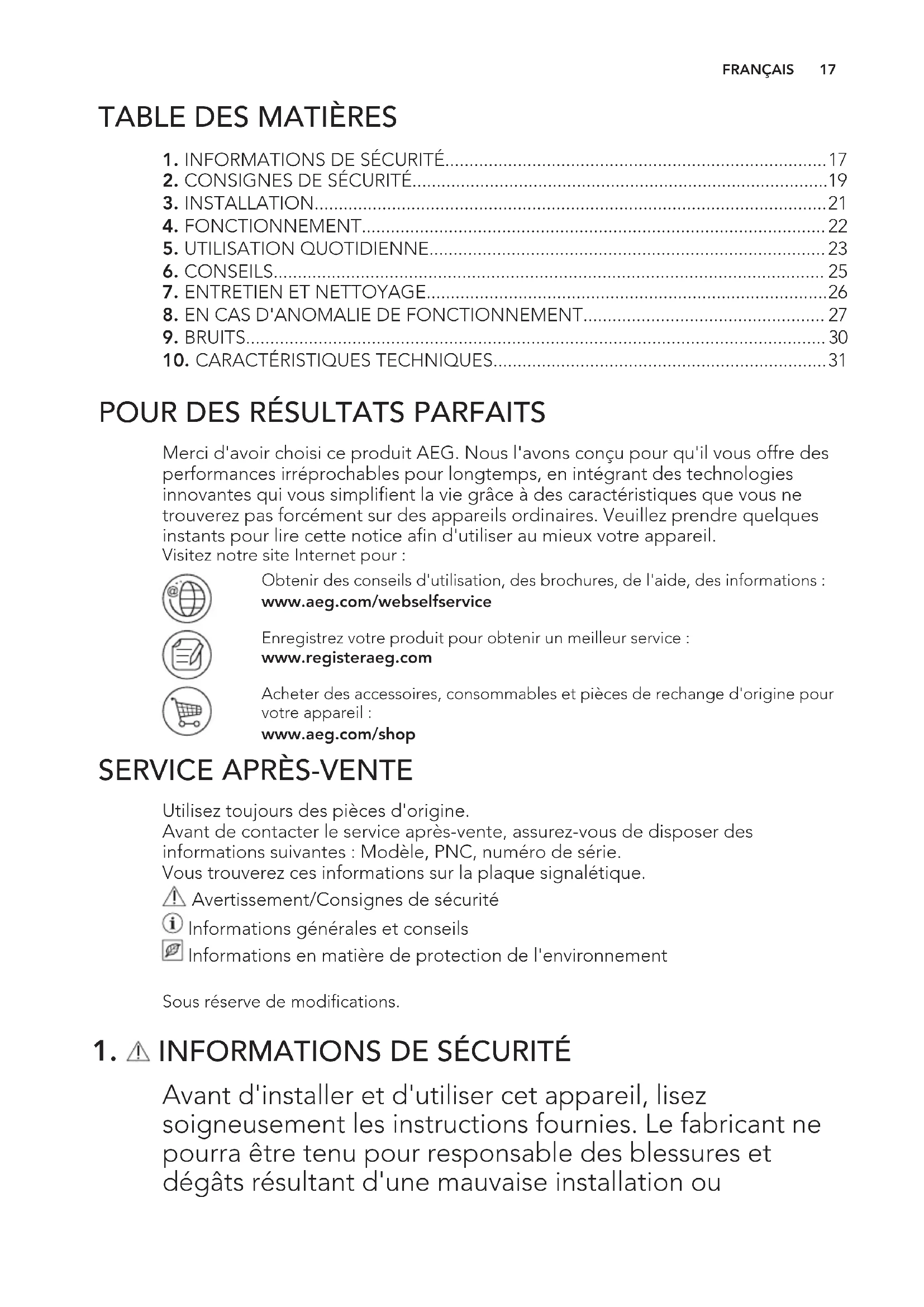 Merci d'avoir choisi ce produit AEG. Nous l'avons conçu pour qu'il vous offre des performances irréprochables pour longtemps, en intégrant des technologies innovantes qui vous simplifient la vie grâce à des caractéristiques que vous ne trouverez pas forcément sur des appareils ordinaires. Veuillez prendre quelques instants pour lire cette notice afin d'utiliser au mieux votre appareil. Visitez notre site Internet pour : Obtenir des conseils d'utilisation, des brochures, de l'aide, des informations : www.aeg.com/webselfservice Enregistrez votre produit pour obtenir un meilleur service : www.registeraeg.com Acheter des accessoires, consommables et pièces de rechange d'origine pour votre appareil : www.aeg.com/shop