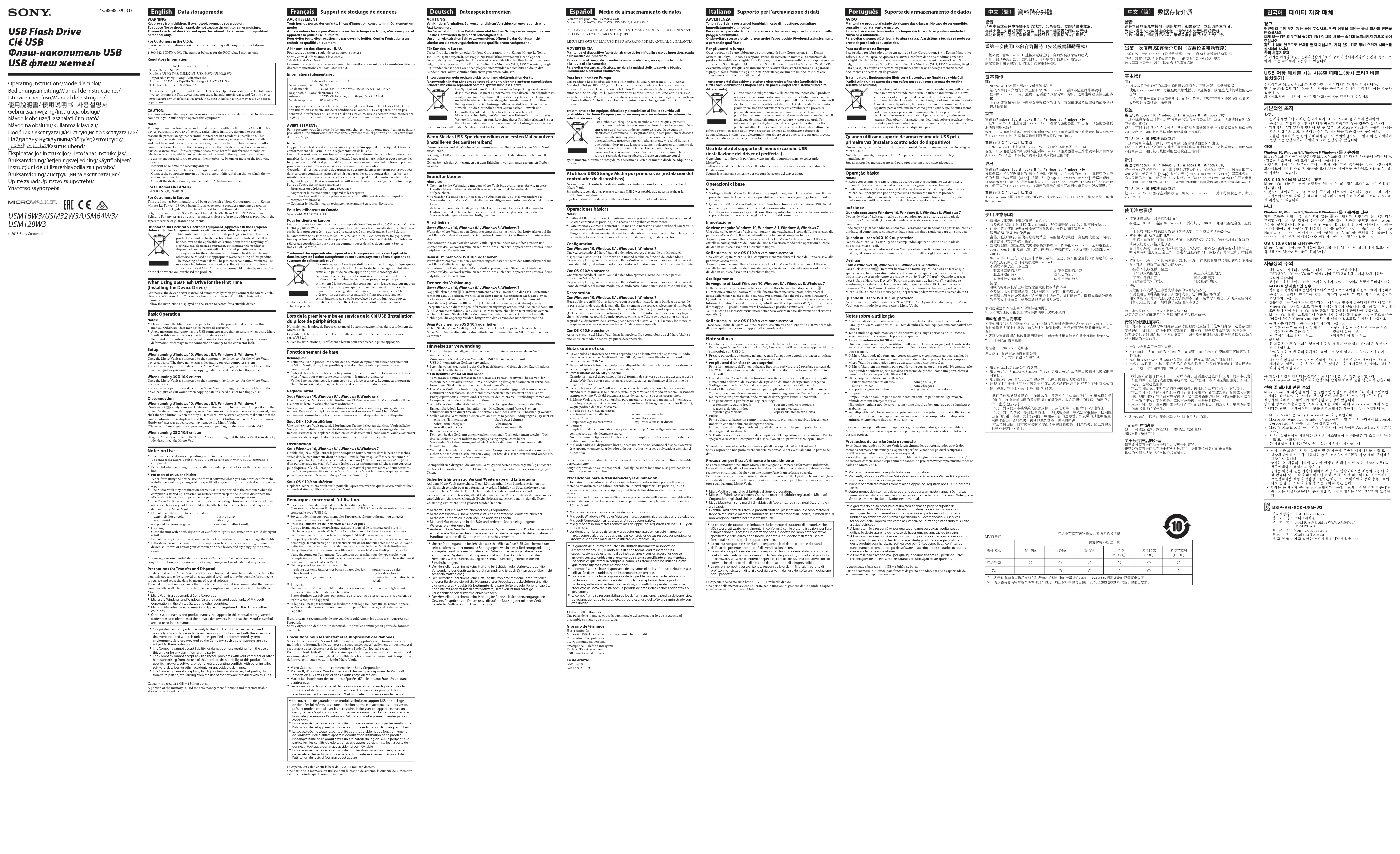 Gebruiksaanwijzing/Instrukcja obsługi/ Návod k obsluze/Használati útmutató/ Návod na obsluhu/Kullanma kılavuzu/ Посібник з експлуатації/Инструкция по эксплуатации/ Пайдалану нұсқаулығы/Οδηγίες λειτουργίας/ /Kasutusjuhend/ Eksploatacijos instrukcijos/Lietošanas instrukcijas/ Bruksanvisning/Betjeningsvejledning/Käyttöohjeet/ Instrucţiuni de utilizare/Navodila za uporabo/ Bruksanvisning/Инструкции за експлоатация/ Upute za rad/Uputstvo za upotrebu/ Упатство заупотреба USB Flash Drive Clé USB Флэш-накопитель USB USB флеш жетегі Data storage media WARNINGKeep away from children. If swallowed, promptly see a doctor.To reduce fire or shock hazard, do not expose the unit to rain or moisture.To avoid electrical shock, do not open the cabinet. Refer servicing to qualified personnel only.For Customers in the U.S.A.If you have any questions about this product, you may call: Sony Customer Information Center1-800-942-SONY(7669). The number below is for the FCC related matters only.Regulatory Information:Declaration of ConformityTrade Name : SONYModel : USM16W3, USM32W3, USM64W3, USM128W3 Responsible Party : Sony Electronics Inc.Address : 16535 Via Esprillo, San Diego, CA 92127 U.S.A.Telephone Number : 858-942-2230This device complies with part 15 of the FCC rules. Operation is subject to the following two conditions: (1) This device may not cause harmful interference, and (2) this device must accept any interference received, including interference that may cause undesired operation.CAUTION:You are cautioned that any changes or modifications not expressly approved in this manual could void your authority to operate this equipment.Note:This equipment has been tested and found to comply with the limits for a Class B digital device, pursuant to part 15 of the FCC Rules. These limits are designed to provide reasonable protection against harmful interference in a residential installation. This equipment generates, uses and can radiate radio frequency energy and, if not installed and used in accordance with the instructions, may cause harmful interference to radio communications. However, there is no guarantee that interference will not occur in a particular installation. If this equipment does cause harmful interference to radio or television reception, which can be determined by turning the equipment off and on, the user is encouraged to try to correct the interference by one or more of the following measures:Reorient or relocate the receiving antenna. ˋIncrease the separation between the equipment and receiver. ˋConnect the equipment into an outlet on a circuit different from that to which the ˋreceiver is connected.Consult the dealer or an experienced radio/TV technician for help. ˋFor Customers in CANADACAN ICES-3(B)/NMB-3(B)For Customers in EuropeThis product has been manufactured by or on behalf of Sony Corporation, 1-7-1 Konan Minato-ku Tokyo, 108-0075 Japan. Inquiries related to product compliance based on European Union legislation shall be addressed to the authorized representative, Sony Belgium, bijkantoor van Sony Europe Limited, Da Vincilaan 7-D1, 1935 Zaventem, Belgium. For any service or guarantee matters, please refer to the addresses provided in the separate service or guarantee documents.Disposal of Old Electrical & Electronic Equipment (Applicable in the European Union and other European countries with separate collection systems)This symbol on the product or on its packaging indicates that this product shall not be treated as household waste. Instead it shall be handed over to the applicable collection point for the recycling of electrical and electronic equipment. By ensuring this product is disposed of correctly, you will help prevent potential negative consequences for the environment and human health, which could otherwise be caused by inappropriate waste handling of this product. The recycling of materials will help to conserve natural resources. For more detailed information about recycling of this product, please contact your local Civic Office, your household waste disposal service or the shop where you purchased the product. When Using USB Flash Drive for the First Time (Installing the Device Driver) Ordinarily, the device driver is installed automatically when you connect the Micro Vault.However, with some USB 2.0 cards or boards, you may need to initiate installation manually.Follow the instructions displayed on the screen to search for a suitable driver. Basic Operation Notes: Please remove the Micro Vault properly following the procedure described in this ˎ manual. Otherwise, data may not be recorded correctly. Avoid inserting and removing the USB connector more than necessary when using Micro ˎ Vault, as this can lead to early mechanical deterioration. Be careful not to subject the exposed connector to a large force. Doing so can cause deformation or damage to the connector or damage to the connector lock.SetupWhen running Windows 10, Windows 8.1, Windows 8, Windows 7Once the Micro Vault is connected to the computer, the drive icon for the Micro Vault device appears. (The drive name varies, depending on your computer system.)You can now copy and save data on the Micro Vault by dragging files and folders on the drive icon, just as you would when copying data to a hard disk or to a floppy disk.When running OS X 10.9 or laterOnce the Micro Vault is connected to the computer, the drive icon for the Micro Vault device appears.You can now copy and save data on the Micro Vault by dragging files and folders on the drive icon, just as you would when copying data to a hard disk or to a floppy disk.DisconnectionWhen running Windows 10, Windows 8.1, Windows 8, Windows 7Double-click (Safely Remove Hardware) in the task tray in the lower right portion of the screen. In the window that appears, select the name of the device 