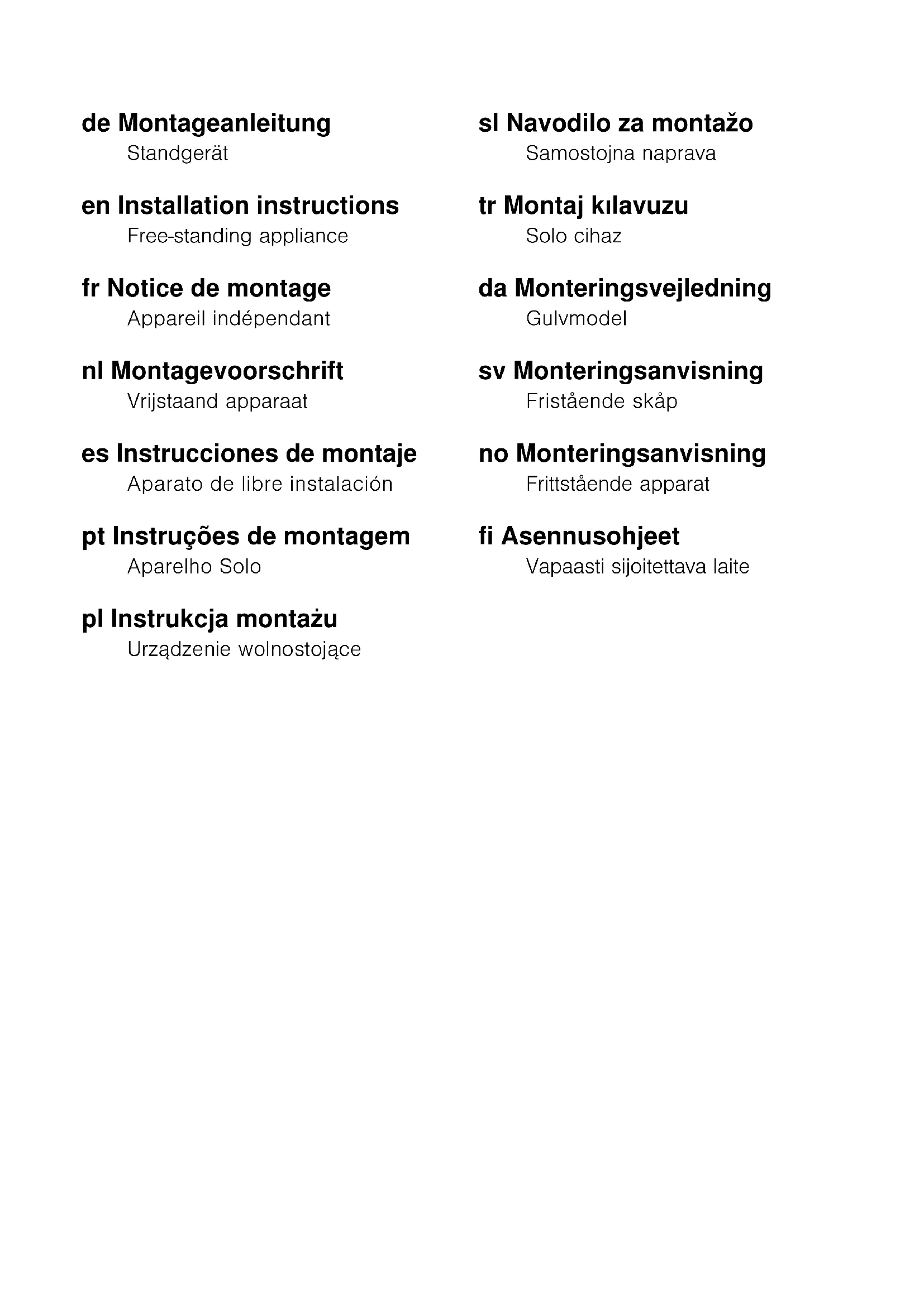 frTable des matières frNotic e de montage Appareil indépendant Utiliser la notice de montage Veuillez déplier la dernière page, illustrée, de la notice. Cette notice de montage vaut pour plusieurs modèles. Selon le modèle, l’appareil peut différer du contenu des illustrations. Lieu d’installation Un local sec et aérable convient comme lieu d’installation. Il faudrait que le lieu d’installation ne soit pas directement exposé aux rayons solaires et pas à proximité d’une source de chaleur (cuisinière, radiateur, etc.). Si l’installation à côté d’une source de chaleur est inévitable, veuillez utiliser un panneau isolant approprié ou respecter les écarts minimums suivants par rapport à la source de chaleur : ■ 3 cm par rapport aux cuisinières électriques ou à gaz. ■ 30 cm par rapport à un appareil de chauffage au fuel ou au charbon. Sur l’emplacement, le sol ne doit pas s’affaisser. Renforcez-le le cas échéant. Placez des garnitures sous l’appareil pour compenser les inégalités du sol éventuelles. Écart mural Implantez l’appareil de sorte à garantir un angle d’ouverture de porte de 90°.fr