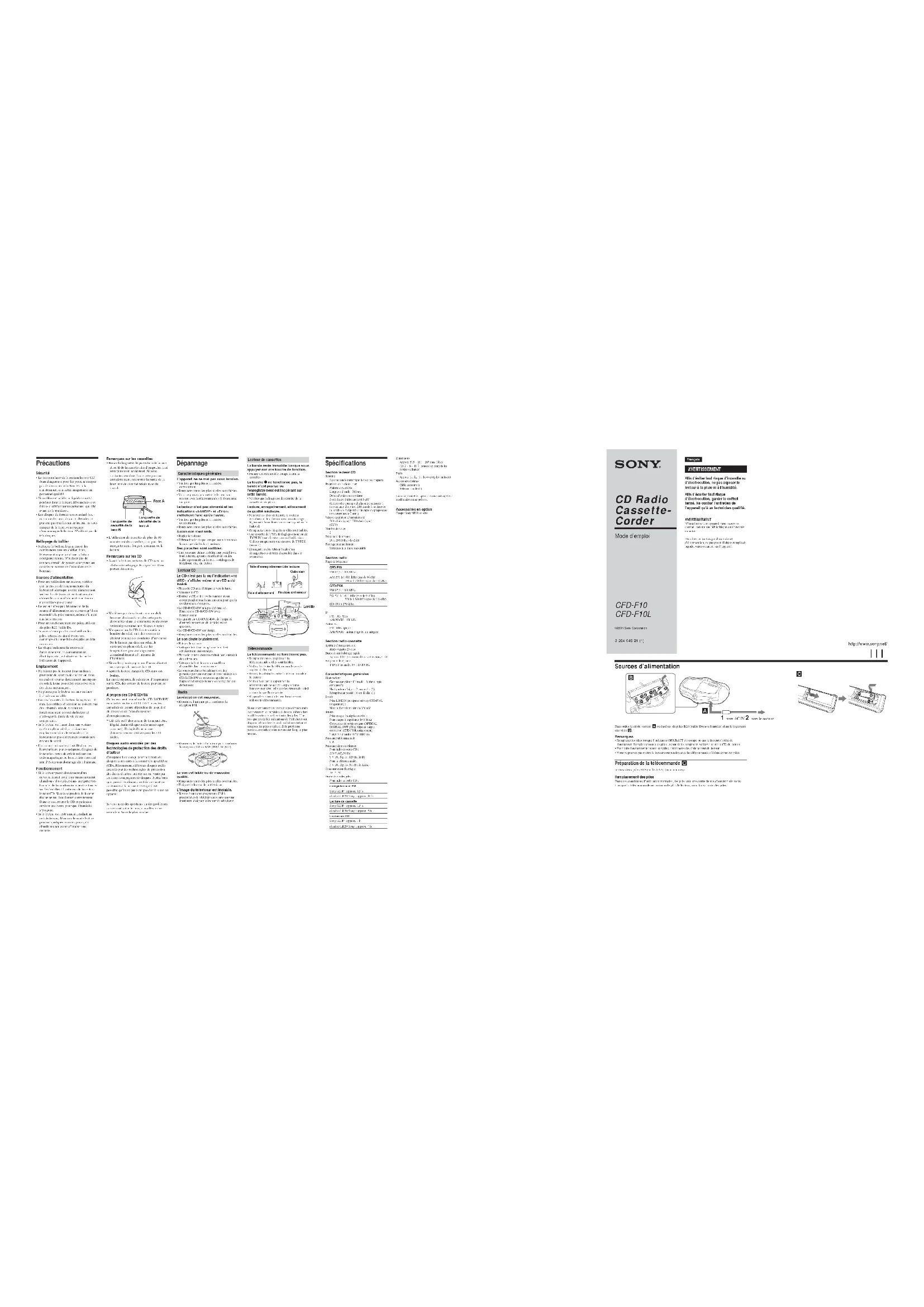 Lecteur de cassettesLa bande reste immobile lorsque vousappuyez sur une touche de fonction.• Fermez correctement le compartiment àcassettes.La touche z ne fonctionne pas, labande n’est pas lue oul’enregistrement est inopérant surcette bande.• Vérifiez que la languette de sécurité de lacassette est en place.Lecture, enregistrement, effacementde qualité médiocre.• Nettoyez les têtes de lecture, le rouleauentraîneur et le cabestan avec un coton-tigelégèrement humidifié avec un nettoyant ou del’alcool.• Remplacez toutes les piles si elles sont faibles.• Une cassette de TYPE II (high position) ou deTYPE IV (metal) est en cours d’utilisation.Utilisez uniquement une cassette de TYPE I(normal).• Démagnétisez les têtes à l’aide d’undémagnétiseur de têtes disponible dans lecommerce.TélécommandeLa télécommande ne fonctionne pas.• Remplacez toutes les piles de latélécommande si elles sont faibles.• Veillez à orienter la télécommande vers lecapteur du lecteur.• Retirez les obstacles entre la télécommande etle lecteur.• Veillez à ce que le capteur de latélécommande ne soit pas exposé à unelumière trop vive, telle que les rayons du soleilou une lampe fluorescente.• Rapprochez-vous du lecteur lorsque vousutilisez la télécommande.Si vous rencontrez toujours des problèmes aprèsavoir essayer les remèdes ci-dessus, débranchezle câble secteur et retirez toutes les piles. Unefois que toutes les indications de l’afficheur ontdisparu, rebranchez le cordon d’alimentation etremettez les piles en place. Si le problèmepersiste, consultez votre revendeur Sony le plusproche.©2004 Sony Corporation Mode d’emploi CD Radio Cassette- Corder 3-264-046-31 (1) CFD-F10 CFD-F10L Précautions Sécurité• Le faisceau laser de la section lecteur CDétant dangereuse pour les yeux, n’essayezpas de démonter le boîtier. Pour lamaintenance, contactez uniquement unpersonnel qualifié.• Si un élément solide ou liquide venait àpénétrer dans le lecteur, débranchez-le etfaites-le vérifier par un personnel qualifiéavant de le réutiliser.• Les disques de formes non standard (ex. :en forme de cœur, de carré, d'étoile) nepeuvent pas être lus sur ce lecteur. Si vousessayez de le faire, vous risquezd'endommager le lecteur. N'utilisez pas detels disques.Nettoyage du boîtier• Nettoyez le boîtier, le panneau et lescommandes avec un chiffon doux,légèrement imprégné d’une solutiondétergente neutre. N’utilisez pas detampon abrasif, de poudre détergente oude solvant comme de l’alcool ou de labenzine.Sources d’alimentation• Pour une utilisation sur secteur, vérifiezque la tension de fonctionnement dulecteur est identique à votre alimentationsecteur locale (voir «Spécifications») etutilisez le cordon d’alimentation fourni ;n’en utilisez pas d’autre.• Le lecteur n’est pas déconnecté de lasource d’alimentation secteur tant qu’il estraccordé à la prise murale, même s’il a étémis hors tension• Pour un fonctionnement sur piles, utilisezsix piles R20 (taille D).• Si vous n’avez pas besoin d’utiliser lespiles, retirez-les afin d’éviter toutdommage dû à une fuite des piles ou à lacorrosion.• La plaque indiquant la tension defonctionnement, la consommationélectrique, etc., est située sur la partieinférieure de l’appareil.Emplacement• Ne laissez pas le lecteur dans un lieu àproximité de sources de chaleur ou dansun endroit soumis directement aux rayonsdu soleil, à une poussière excessive ou àdes chocs mécaniques.• Ne placez pas le lecteur sur une surfaceinclinée ou instable.• Laissez les côtés du boîtier dégagés sur 10mm. Les orifices d’aération ne doivent pasêtre obstrués afin de garantir unfonctionnement correct du lecteur etd’allonger la durée de vie de sescomposants.• Si le lecteur est laissé dans une voituregarée en plein soleil, choisissez unemplacement dans le véhicule où lelecteur n’est pas directement soumis auxrayons du soleil.• Un aimant puissant est installé dans leshaut-parleurs, par conséquent, éloignez dulecteur les cartes de crédit utilisant uncode magnétique ou les montres à ressortafin d’éviter tout dommage dû à l’aimant.Fonctionnement• Si le lecteur passe directement d’unenvironnement froid à un environnementchaud ou s’il est placé dans une pièce trèshumide, de la condensation peut se formersur les lentilles à l’intérieur de la sectionlecteur CD. Si cela se produit, le lecteurrisque ne pas fonctionner correctement.Dans ce cas, retirez le CD et patientezenviron une heure pour que l’humidités’évapore.• Si le lecteur est resté inactif pendant uncertain temps, démarrez le mode lecturependant quelques minutes pour qu’ilchauffe un peu avant d’insérer unecassette. Spécifications Section lecteur CDSystèmeSystème audio numérique à disques compactsPropriétés de la diode laserMatériau : GaAlAsLongueur d’onde : 780 nmDurée d’émission : continueSortie laser : inférieure à 44,6 µW(Cette sortie correspond à la valeur mesurée àune distance d’environ 200 mm de la surface dela lentille de l’objectif sur le capteur optique avecune ouverture de 7 mm.)Vitesse du plateau d’enroulement200 tr/min (rpm) à 500 tr/min (rpm)(CLV)Nombre de voies Fréquence de réponse20 à 20 000 Hz +1/–2 dBPleurage et scintillementInférieurs à la limite mesurableSection radioPlage de fréquenceCFD-F10FM 87,5 à 108 MHzAM 531 à 1 611 kHz (pas de 9 kHz)530 à 1 710 kHz (pas de 10 kHz)CFD-F10LFM 87,5 à 108 MHzPO 531 à 1 611 kHz (pas de 9 kHz)530 à 1 610 kHz (pas de 10 kHz)GO 153 à 279 kHz FM : 10,7 MHzAM/PO/GO : 450 kHzAntennesFM : télescopiqueAM/PO/GO : antenne tige ferrite intégréeSection radio-cassetteSystème d’enregistrementstéréo 4 pistes 2 voiesDurée du rembobinage rapideApprox. 110 s (sec.) avec des cassettes Sony C-60Fréquence de réponseTYPE I (normal) : 80 à 13 000 HzCaractéristiques g