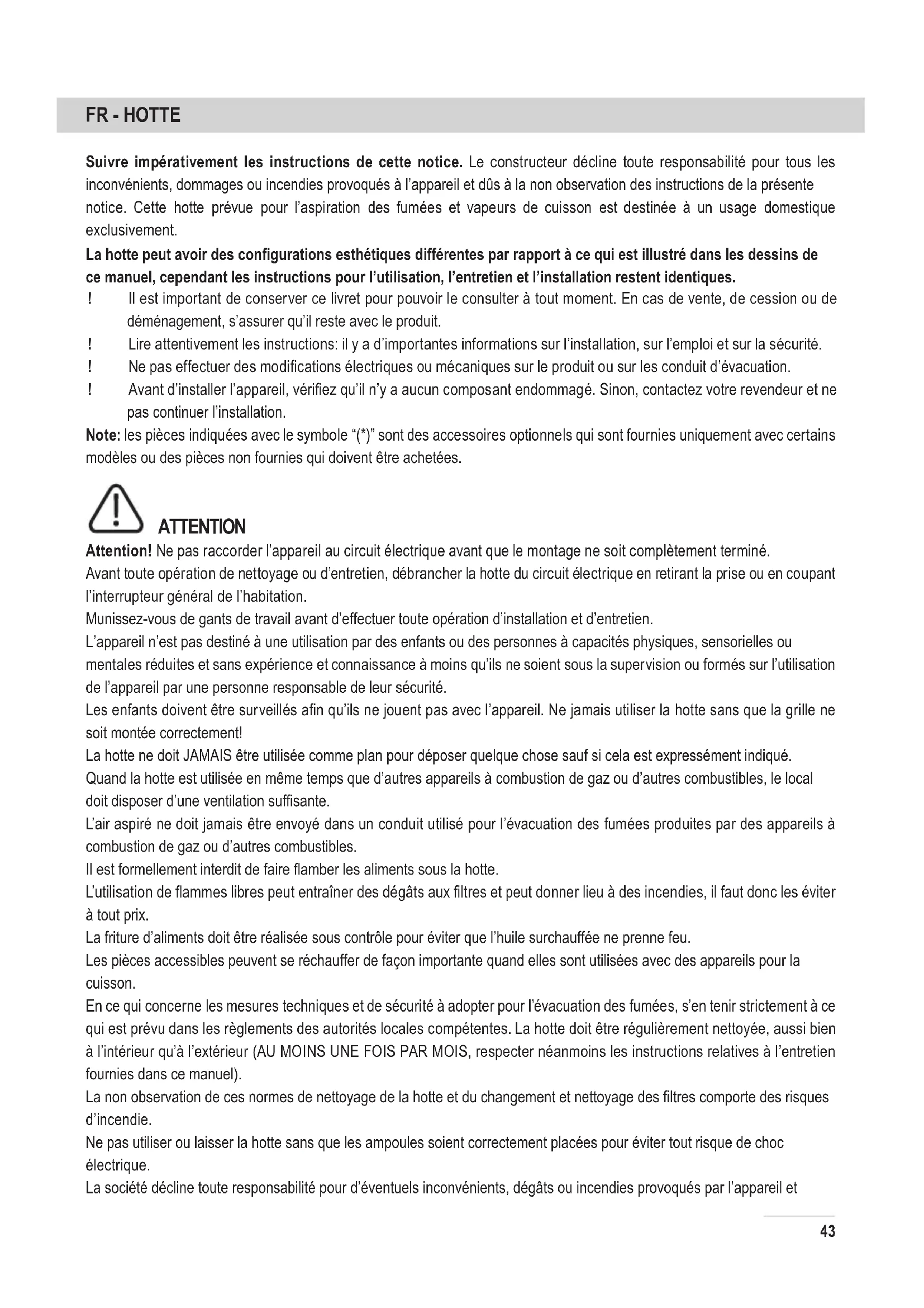Suivre impérativement les instructions de cette notice. Le constructeur décline toute responsabilité pour tous les inconvénients, dommages ou incendies provoqués à l’appareil et dûs à la non observation des instructions de la présente notice. Cette hotte prévue pour l’aspiration des fumées et vapeurs de cuisson est destinée à un usage domestique exclusivement. La hotte peut avoir des congurations esthétiques différentes par rapport à ce qui est illustré dans les dessins de ce manuel, cependant les instructions pour l’utilisation, l’entretien et l’installation restent identiques. ! Il est important de conserver ce livret pour pouvoir le consulter à tout moment. En cas de vente, de cession ou de déménagement, s’assurer qu’il reste avec le produit. ! Lire attentivement les instructions: il y a d’importantes informations sur l’installation, sur l’emploi et sur la sécurité. ! Ne pas effectuer des modications électriques ou mécaniques sur le produit ou sur les conduit d’évacuation. ! Avant d’installer l’appareil, vériez qu’il n’y a aucun composant endommagé. Sinon, contactez votre revendeur et ne pas continuer l’installation. Note: les pièces indiquées avec le symbole “(*)” sont des accessoires optionnels qui sont fournies uniquement avec certains modèles ou des pièces non fournies qui doivent être achetées. ATTENTION Attention! Ne pas raccorder l’appareil au circuit électrique avant que le montage ne soit complètement terminé. Avant toute opération de nettoyage ou d’entretien, débrancher la hotte du circuit électrique en retirant la prise ou en coupant l’interrupteur général de l’habitation. Munissez-vous de gants de travail avant d’effectuer toute opération d’installation et d’entretien. L’appareil n’est pas destiné à une utilisation par des enfants ou des personnes à capacités physiques, sensorielles ou mentales réduites et sans expérience et connaissance à moins qu’ils ne soient sous la supervision ou formés sur l’utilisation de l’appareil par une personne responsable de leur sécurité. Les enfants doivent être surveillés an qu’ils ne jouent pas avec l’appareil. Ne jamais utiliser la hotte sans que la grille ne soit montée correctement! La hotte ne doit JAMAIS être utilisée comme plan pour déposer quelque chose sauf si cela est expressément indiqué. Quand la hotte est utilisée en même temps que d’autres appareils à combustion de gaz ou d’autres combustibles, le local doit disposer d’une ventilation sufsante. L’air aspiré ne doit jamais être envoyé dans un conduit utilisé pour l’évacuation des fumées produites par des appareils à combustion de gaz ou d’autres combustibles. Il est formellement interdit de faire amber les aliments sous la hotte. L’utilisation de ammes libres peut entraîner des dégâts aux ltres et peut donner lieu à des incendies, il faut donc les éviter à tout prix. La friture d’aliments doit être réalisée sous contrôle pour éviter que l’huile surchauffée ne prenne feu. Les pièces accessibles peuvent se réchauffer de façon importante quand elles sont utilisées avec des appareils pour la cuisson. En ce qui concerne les mesures techniques et de sécurité à adopter pour l’évacuation des fumées, s’en tenir strictement à ce qui est prévu dans les règlements des autorités locales compétentes. La hotte doit être régulièrement nettoyée, aussi bien à l’intérieur qu’à l’extérieur (AU MOINS UNE FOIS PAR MOIS, respecter néanmoins les instructions relatives à l’entretien fournies dans ce manuel). La non observation de ces normes de nettoyage de la hotte et du changement et nettoyage des ltres comporte des risques d’incendie. Ne pas utiliser ou laisser la hotte sans que les ampoules soient correctement placées pour éviter tout risque de choc électrique. La société décline toute responsabilité pour d’éventuels inconvénients, dégâts ou incendies provoqués par l’appareil et44 dérivés de la non observation des instructions reprises dans ce manuel. Cet appareil porte le symbole du recyclage conformément à la Directive Européenne 2012/19/CE concernant les Déchets d’Équipements Électriques et Électroniques (DEEE ou WEEE). En procédant correctement à la mise au rebut de cet appareil, vous contribuerez à empêcher toute conséquence nuisible pour l’environnement et la santé de l’homme. L e s y m b o l e présent sur l’appareil ou sur la documentation qui l’accompagne indique que ce produit ne peut en aucun cas être traité comme déchet ménager. Il doit par conséquent être remis à un centre de collecte des déchets chargé du recyclage des équipements électriques et électroniques. Pour la mise au rebut, respectez les normes relatives à l’élimination des déchets en vigueur dans le pays d’installation. Pour obtenir de plus amples détails au sujet du traitement, de la récupération et du recyclage de cet appareil, veuillez vous adresser au bureau compétent de votre commune, à la société de collecte des déchets ou directement à votre revendeur. Appareil conçu, testé et fabriqué conformément aux normes suivantes :