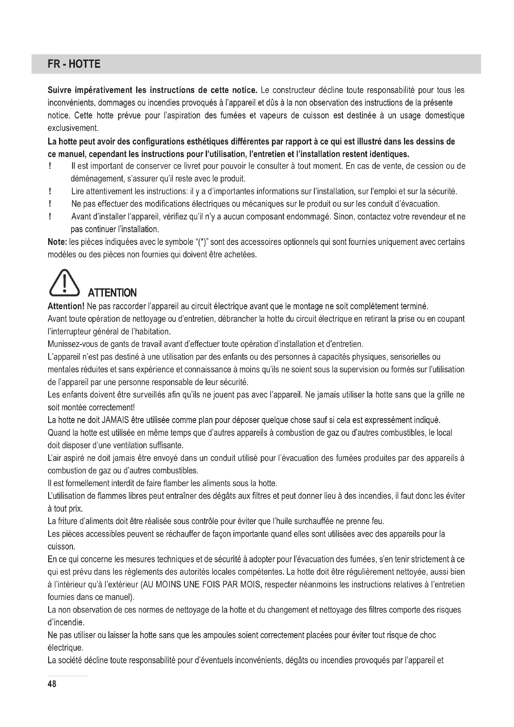 Suivre impérativement les instructions de cette notice. Le constructeur décline toute responsabilité pour tous les inconvénients, dommages ou incendies provoqués à l’appareil et dûs à la non observation des instructions de la présente notice. Cette hotte prévue pour l’aspiration des fumées et vapeurs de cuisson est destinée à un usage domestique exclusivement. La hotte peut avoir des congurations esthétiques différentes par rapport à ce qui est illustré dans les dessins de ce manuel, cependant les instructions pour l’utilisation, l’entretien et l’installation restent identiques. ! Il est important de conserver ce livret pour pouvoir le consulter à tout moment. En cas de vente, de cession ou de déménagement, s’assurer qu’il reste avec le produit. ! Lire attentivement les instructions: il y a d’importantes informations sur l’installation, sur l’emploi et sur la sécurité. ! Ne pas effectuer des modications électriques ou mécaniques sur le produit ou sur les conduit d’évacuation. ! Avant d’installer l’appareil, vériez qu’il n’y a aucun composant endommagé. Sinon, contactez votre revendeur et ne pas continuer l’installation. Note: les pièces indiquées avec le symbole “(*)” sont des accessoires optionnels qui sont fournies uniquement avec certains modèles ou des pièces non fournies qui doivent être achetées. ATTENTION Attention! Ne pas raccorder l’appareil au circuit électrique avant que le montage ne soit complètement terminé. Avant toute opération de nettoyage ou d’entretien, débrancher la hotte du circuit électrique en retirant la prise ou en coupant l’interrupteur général de l’habitation. Munissez-vous de gants de travail avant d’effectuer toute opération d’installation et d’entretien. L’appareil n’est pas destiné à une utilisation par des enfants ou des personnes à capacités physiques, sensorielles ou mentales réduites et sans expérience et connaissance à moins qu’ils ne soient sous la supervision ou formés sur l’utilisation de l’appareil par une personne responsable de leur sécurité. Les enfants doivent être surveillés an qu’ils ne jouent pas avec l’appareil. Ne jamais utiliser la hotte sans que la grille ne soit montée correctement! La hotte ne doit JAMAIS être utilisée comme plan pour déposer quelque chose sauf si cela est expressément indiqué. Quand la hotte est utilisée en même temps que d’autres appareils à combustion de gaz ou d’autres combustibles, le local doit disposer d’une ventilation sufsante. L’air aspiré ne doit jamais être envoyé dans un conduit utilisé pour l’évacuation des fumées produites par des appareils à combustion de gaz ou d’autres combustibles. Il est formellement interdit de faire amber les aliments sous la hotte. L’utilisation de ammes libres peut entraîner des dégâts aux ltres et peut donner lieu à des incendies, il faut donc les éviter à tout prix. La friture d’aliments doit être réalisée sous contrôle pour éviter que l’huile surchauffée ne prenne feu. Les pièces accessibles peuvent se réchauffer de façon importante quand elles sont utilisées avec des appareils pour la cuisson. En ce qui concerne les mesures techniques et de sécurité à adopter pour l’évacuation des fumées, s’en tenir strictement à ce qui est prévu dans les règlements des autorités locales compétentes. La hotte doit être régulièrement nettoyée, aussi bien à l’intérieur qu’à l’extérieur (AU MOINS UNE FOIS PAR MOIS, respecter néanmoins les instructions relatives à l’entretien fournies dans ce manuel). La non observation de ces normes de nettoyage de la hotte et du changement et nettoyage des ltres comporte des risques d’incendie. Ne pas utiliser ou laisser la hotte sans que les ampoules soient correctement placées pour éviter tout risque de choc électrique. La société décline toute responsabilité pour d’éventuels inconvénients, dégâts ou incendies provoqués par l’appareil et49 dérivés de la non observation des instructions reprises dans ce manuel. Cet appareil porte le symbole du recyclage conformément à la Directive Européenne 2002/96/CE concernant les Déchets d’Équipements Électriques et Électroniques (DEEE ou WEEE). En procédant correctement à la mise au rebut de cet appareil, vous contribuerez à empêcher toute conséquence nuisible pour l’environnement et la santé de l’homme. L e s y m b o l e présent sur l’appareil ou sur la documentation qui l’accompagne indique que ce produit ne peut en aucun cas être traité comme déchet ménager. Il doit par conséquent être remis à un centre de collecte des déchets chargé du recyclage des équipements électriques et électroniques. Pour la mise au rebut, respectez les normes relatives à l’élimination des déchets en vigueur dans le pays d’installation. Pour obtenir de plus amples détails au sujet du traitement, de la récupération et du recyclage de cet appareil, veuillez vous adresser au bureau compétent de votre commune, à la société de collecte des déchets ou directement à votre revendeur. Appareil conçu, testé et fabriqué conformément aux normes suivantes :