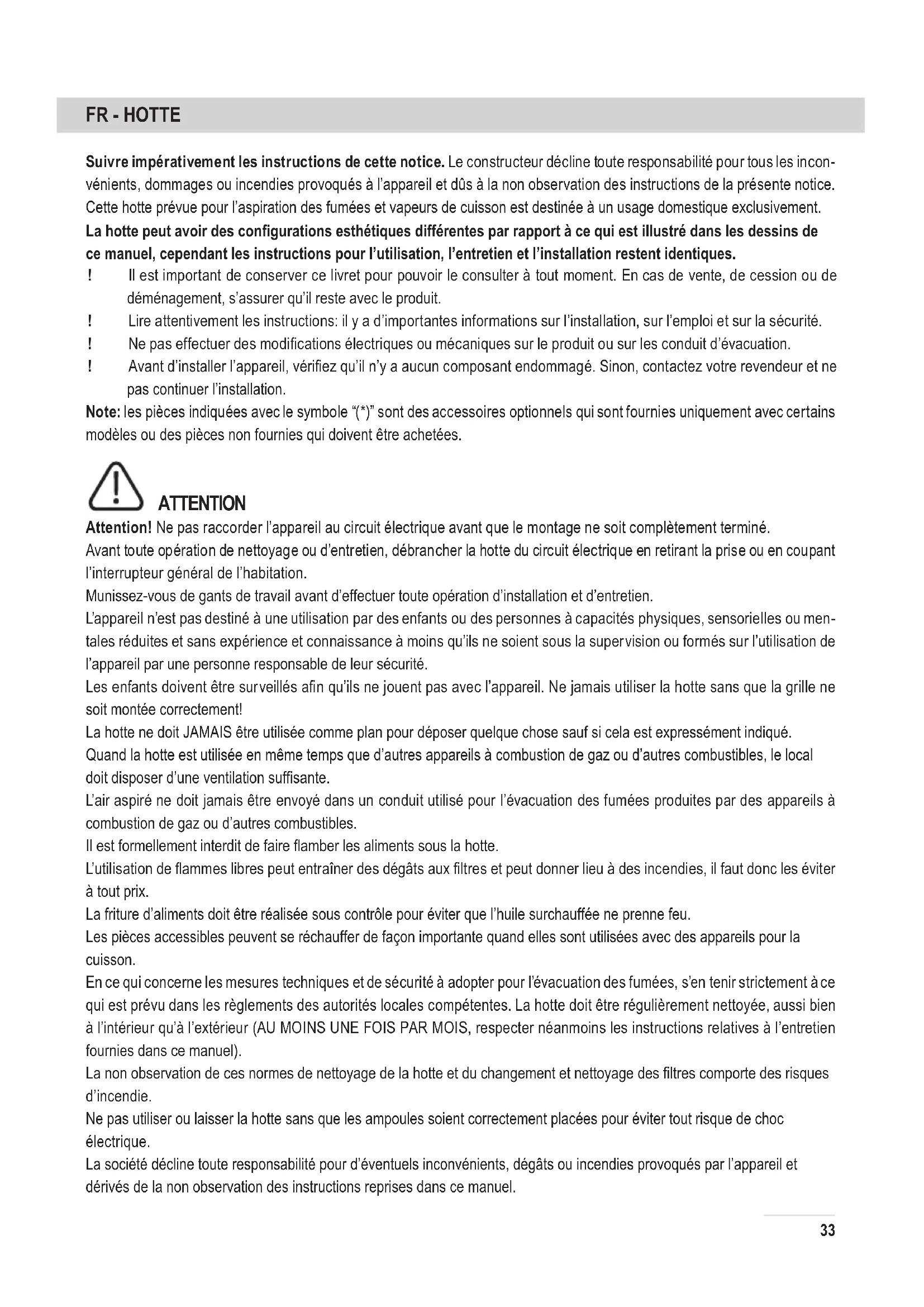 Suivre impérativement les instructions de cette notice. Le constructeur décline toute responsabilité pour tous les incon- vénients, dommages ou incendies provoqués à l’appareil et dûs à la non observation des instructions de la présente notice. Cette hotte prévue pour l’aspiration des fumées et vapeurs de cuisson est destinée à un usage domestique exclusivement. La hotte peut avoir des congurations esthétiques différentes par rapport à ce qui est illustré dans les dessins de ce manuel, cependant les instructions pour l’utilisation, l’entretien et l’installation restent identiques. ! Il est important de conserver ce livret pour pouvoir le consulter à tout moment. En cas de vente, de cession ou de déménagement, s’assurer qu’il reste avec le produit. ! Lire attentivement les instructions: il y a d’importantes informations sur l’installation, sur l’emploi et sur la sécurité. ! Ne pas effectuer des modications électriques ou mécaniques sur le produit ou sur les conduit d’évacuation. ! Avant d’installer l’appareil, vériez qu’il n’y a aucun composant endommagé. Sinon, contactez votre revendeur et ne pas continuer l’installation. Note: les pièces indiquées avec le symbole “(*)” sont des accessoires optionnels qui sont fournies uniquement avec certains modèles ou des pièces non fournies qui doivent être achetées. ATTENTION Attention! Ne pas raccorder l’appareil au circuit électrique avant que le montage ne soit complètement terminé. Avant toute opération de nettoyage ou d’entretien, débrancher la hotte du circuit électrique en retirant la prise ou en coupant l’interrupteur général de l’habitation. Munissez-vous de gants de travail avant d’effectuer toute opération d’installation et d’entretien. L’appareil n’est pas destiné à une utilisation par des enfants ou des personnes à capacités physiques, sensorielles ou men- tales réduites et sans expérience et connaissance à moins qu’ils ne soient sous la supervision ou formés sur l’utilisation de l’appareil par une personne responsable de leur sécurité. Les enfants doivent être surveillés an qu’ils ne jouent pas avec l’appareil. Ne jamais utiliser la hotte sans que la grille ne soit montée correctement! La hotte ne doit JAMAIS être utilisée comme plan pour déposer quelque chose sauf si cela est expressément indiqué. Quand la hotte est utilisée en même temps que d’autres appareils à combustion de gaz ou d’autres combustibles, le local doit disposer d’une ventilation sufsante. L’air aspiré ne doit jamais être envoyé dans un conduit utilisé pour l’évacuation des fumées produites par des appareils à combustion de gaz ou d’autres combustibles. Il est formellement interdit de faire amber les aliments sous la hotte. L’utilisation de ammes libres peut entraîner des dégâts aux ltres et peut donner lieu à des incendies, il faut donc les éviter à tout prix. La friture d’aliments doit être réalisée sous contrôle pour éviter que l’huile surchauffée ne prenne feu. Les pièces accessibles peuvent se réchauffer de façon importante quand elles sont utilisées avec des appareils pour la cuisson. En ce qui concerne les mesures techniques et de sécurité à adopter pour l’évacuation des fumées, s’en tenir strictement à ce qui est prévu dans les règlements des autorités locales compétentes. La hotte doit être régulièrement nettoyée, aussi bien à l’intérieur qu’à l’extérieur (AU MOINS UNE FOIS PAR MOIS, respecter néanmoins les instructions relatives à l’entretien fournies dans ce manuel). La non observation de ces normes de nettoyage de la hotte et du changement et nettoyage des ltres comporte des risques d’incendie. Ne pas utiliser ou laisser la hotte sans que les ampoules soient correctement placées pour éviter tout risque de choc électrique. La société décline toute responsabilité pour d’éventuels inconvénients, dégâts ou incendies provoqués par l’appareil et dérivés de la non observation des instructions reprises dans ce manuel.34 Cet appareil porte le symbole du recyclage conformément à la Directive Européenne 2002/96/CE concernant les Déchets d’Équipements Électriques et Électroniques (DEEE ou WEEE). En procédant correctement à la mise au rebut de cet appareil, vous contribuerez à empêcher toute conséquence nuisible pour l’environnement et la santé de l’homme. L e s y m b o l e présent sur l’appareil ou sur la documentation qui l’accompagne indique que ce produit ne peut en aucun cas être traité comme déchet ménager. Il doit par conséquent être remis à un centre de collecte des déchets chargé du recyclage des équipements électriques et électroniques. Pour la mise au rebut, respectez les normes relatives à l’élimination des déchets en vigueur dans le pays d’installation. Pour obtenir de plus amples détails au sujet du traitement, de la récupération et du recyclage de cet appareil, veuillez vous adresser au bureau compétent de votre commune, à la société de collecte des déchets ou directement à votre revendeur. Appareil conçu, testé et fabriqué conformément aux normes suivantes :