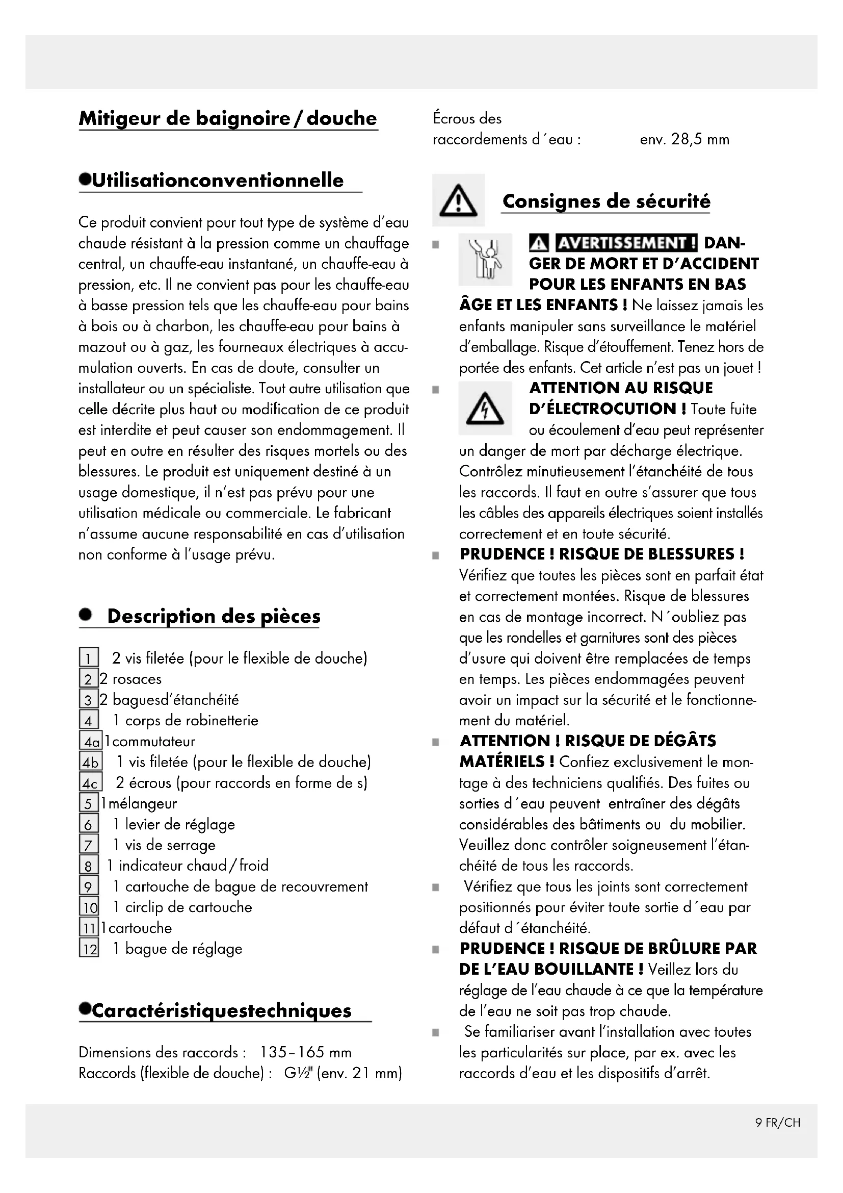 verfällt, wenn das Produkt beschädigt, nicht sach- gemäß benutzt oder gewartet wurde. Die Garantieleistung gilt für Material- oder Fabrika- tionsfehler. Diese Garantie erstreckt sich nicht auf Produktteile, die normaler Abnutzung ausgesetzt sind (z. B. Batterien) und daher als Verschleißteile ange- sehen werden können oder für Beschädigungen an zerbrechlichen Teilen, z. B. Schalter, Akkus oder die aus Glas gefertigt sind.9 FR/CH Mitigeur de baignoire / douche Utilisation conventionnelle Ce produit convient pour tout type de système d’eau chaude résistant à la pression comme un chauffage central, un chauffe-eau instantané, un chauffe-eau à pression, etc. Il ne convient pas pour les chauffe-eau à basse pression tels que les chauffe-eau pour bains à bois ou à charbon, les chauffe-eau pour bains à mazout ou à gaz, les fourneaux électriques à accu- mulation ouverts. En cas de doute, consulter un installateur ou un spécialiste. Tout autre utilisation que celle décrite plus haut ou modification de ce produit est interdite et peut causer son endommagement. Il peut en outre en résulter des risques mortels ou des blessures. Le produit est uniquement destiné à un usage domestique, il n‘est pas prévu pour une utilisation médicale ou commerciale. Le fabricant n’assume aucune responsabilité en cas d’utilisation non conforme à l’usage prévu. Description des pièces