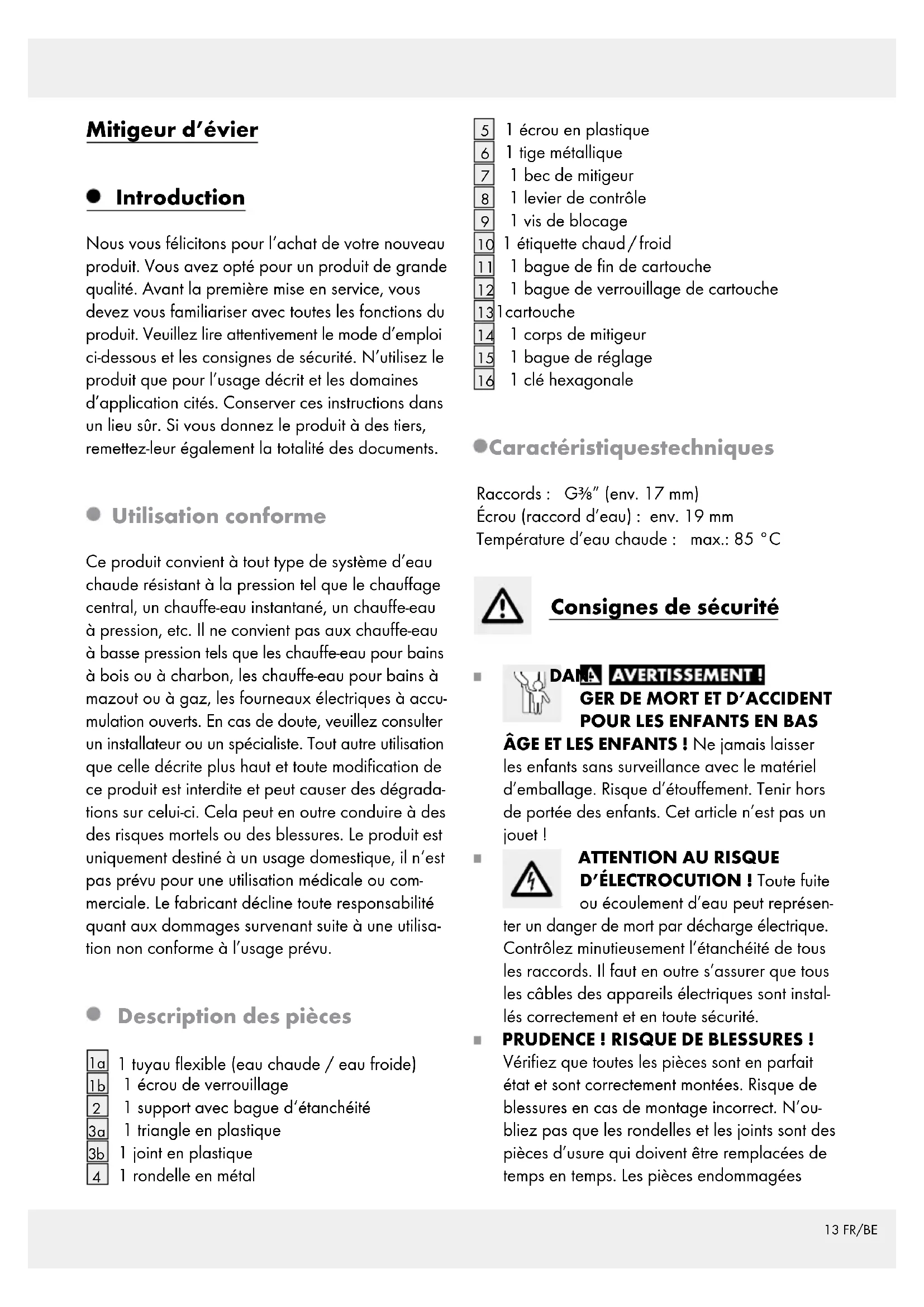 et éliminez les dépôts de calcaire ou les corps étrangers. Le non-respect des instructions d‘entretien peut entraîner des dommages sur la surface. Il est alors impossible de faire valoir ses droits de garantie. Recyclage L’emballage se compose de matières recyclables qui peuvent être mises au rebut dans les déchette- ries locales. Les possibilités de recyclage des produits usés sont à demander auprès de votre municipalité. Informations Potabilité de l’eau du robinet Informez-vous auprès des autorités locales sur la potabilité de l’eau dans votre ville / commune. D’une façon générale, pour la potabilité de l’eau du robinet, nous recommandons : Laissez couler l’eau un bref moment si elle a stagné plus de quatre heures dans les tuyaux. N’utilisez pas l’eau stagnante pour préparer les repas et les boissons, et surtout pas dans la préparation des aliments pour nourrissons. Dans le cas contraire, il existe des risques pour la santé. L’eau qui sort du robinet est bonne lorsqu’elle est nettement plus fraîche que l’eau stagnante. Ne pas utiliser d’eau stagnante venant de tuyauteries chromées pour la nourriture et / ou les soins corporels si vous êtes allergique au nickel. Une telle eau peut contenir une grande quantité de nickel et provoquer des réactions allergiques. N’utilisez pas d’eau potable venant de tuyau- teries de plomb pour la préparation d’aliments pour nourrisson et / ou pendant la grossesse pour la préparation des aliments. Le plomb16 FR/BE pénètre dans l’eau potable, ce qui est particu- lièrement dangereux pour la santé des nourris- sons et des jeunes enfants. Garantie Le produit a été fabriqué selon des critères de qua- lité stricts et contrôlé consciencieusement avant sa livraison. En cas de défaillance, vous êtes en droit de retourner ce produit au vendeur. La présente ga- rantie ne constitue pas une restriction de vos droits légaux. Ce produit bénéficie d‘une garantie de 5 ans à compter de sa date d’achat. La durée de garantie débute à la date d’achat. Veuillez conserver le ticket de caisse original. Il fera office de preuve d’achat. Si un problème matériel ou de fabrication devait survenir dans 5 ans suivant la date d‘achat de ce produit, nous assurons à notre discrétion la répara- tion ou le remplacement du produit sans frais sup- plémentaires. La garantie prend fin si le produit est endommagé suite à une utilisation inappropriée ou à un entretien défaillant. La garantie couvre les vices matériels et de fabrica- tion. Cette garantie ne s’étend ni aux pièces du produit soumises à une usure normale (p. ex. des piles) et qui, par conséquent, peuvent être considé- rées comme des pièces d’usure, ni aux dommages sur des composants fragiles, comme des interrup- teurs, des batteries ou des éléments fabriqués en verre.17 NL/BE Keukenkraan Inleiding Hartelijk gefeliciteerd met de aankoop van uw nieuwe product. U hebt voor een hoogwaardig product gekozen. Maak u voor de eerste ingebruik- name vertrouwd met het product. Lees hiervoor aandachtig de volgende gebruiksaanwijzing en de veiligheidsvoorschriften. Gebruik het product alleen zoals beschreven en voor de aangegeven toepas- singsgebieden. Bewaar deze gebruiksaanwijzing op een veilige plek. Geef, wanneer u het product doorgeeft aan derden, ook alle documenten mee. Correct gebruik Dit product is geschikt voor alle warmwatersystemen met constante druk zoals centrale verwarmingen, geisers, doorstroomboilers e.d. Het product is niet geschikt voor lagedruk-warm waterboilers zoals hout-, kolen-, olie- of gasbadkamerketels en open elektrische inbouwboilers. Neem in geval van twijfel contact op met een installateur of een deskundige. Een ander gebruik dan het beschreven gebruik of een verandering aan het product is niet toegestaan en leidt tot schade aan het product. Bovendien kan dit leiden tot levensgevaar en letsel. Het product is alleen bedoeld voor eigen gebruik, niet voor medi- sche of commerciële doeleinden. De fabrikant is niet aansprakelijk voor schade die terug te voeren is op ondeskundig gebruik. Beschrijving van de onderdelen