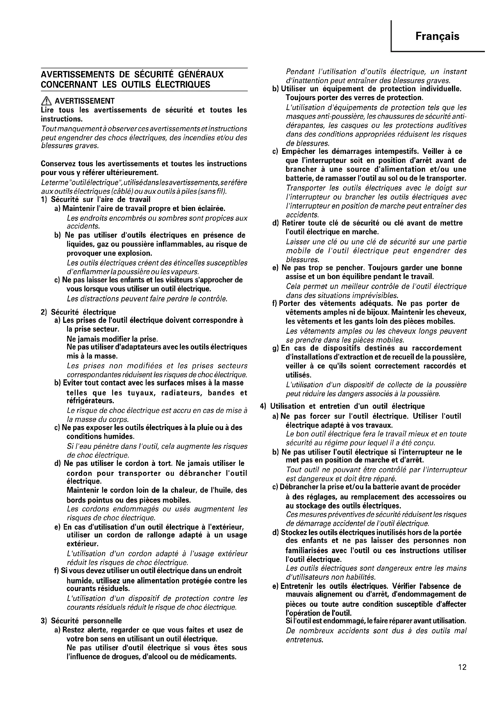 AVERTISSEMENT Lire tous les avertissements de sécurité et toutes les instructions. Tout manquement à observer ces avertissements et instructions peut engendrer des chocs électriques, des incendies et/ou des blessures graves. Conservez tous les avertissements et toutes les instructions pour vous y référer ultérieurement. Le terme "outil électrique", utilisé dans les avertissements, se réfère aux outils électriques (câblé) ou aux outils à piles (sans fil).