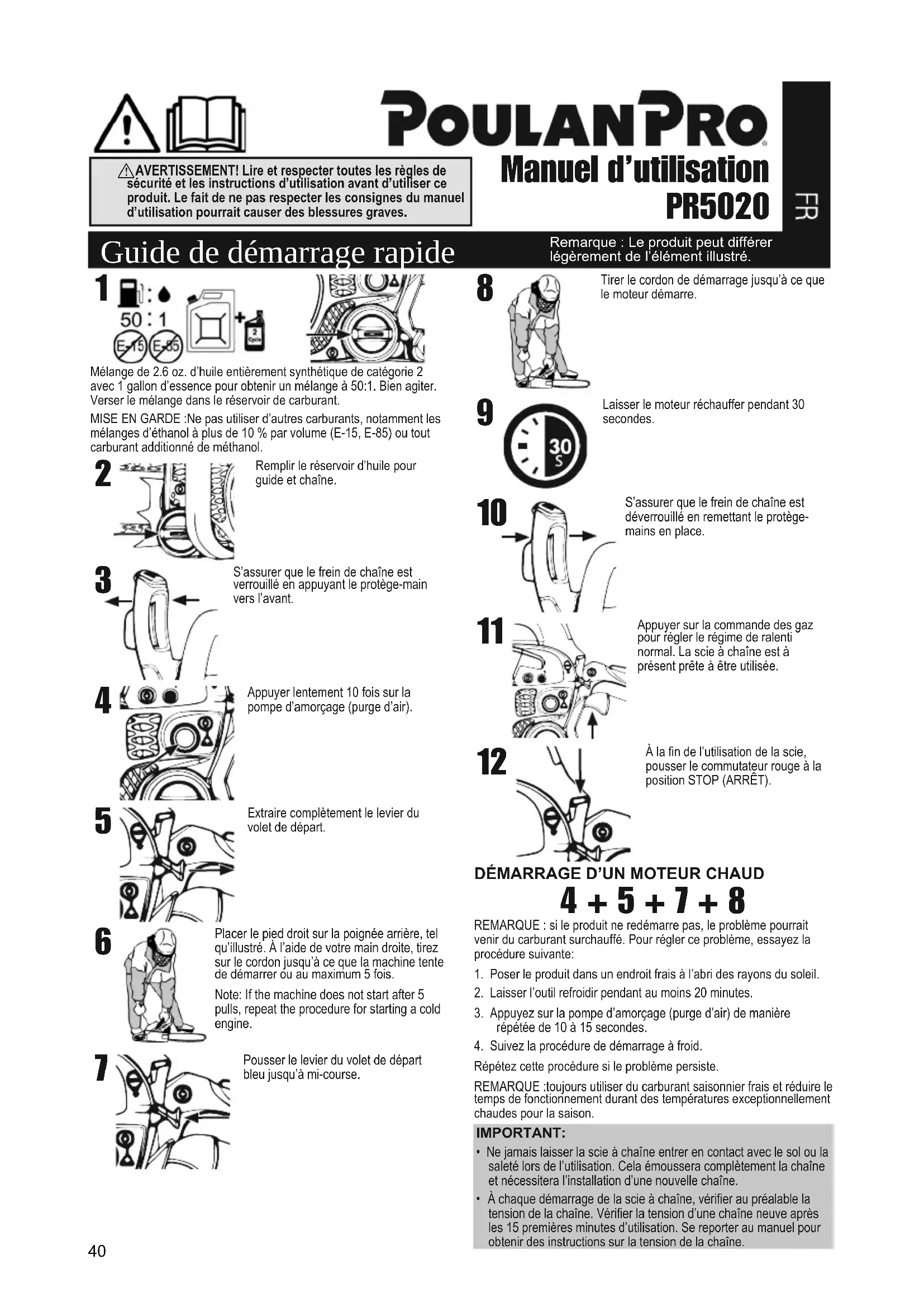 4 + 5 + 7 + 8 REMARQUE : si le produit ne redémarre pas, le problème pourrait venir du carburant surchauffé. Pour régler ce problème, essayez la procédure suivante:1. Poser le produit dans un endroit frais à l’abri des rayons du soleil.2. Laisser l’outil refroidir pendant au moins 20 minutes.3. Appuyez sur la pompe d’amorçage (purge d’air) de manière répétée de 10 à 15 secondes.4. Suivez la procédure de démarrage à froid.Répétez cette procédure si le problème persiste.REMARQUE :toujours utiliser du carburant saisonnier frais et réduire le temps de fonctionnement durant des températures exceptionnellement chaudes pour la saison.IMPORTANT:• Ne jamais laisser la scie à chaîne entrer en contact avec le sol ou la saleté lors de l’utilisation. Cela émoussera complètement la chaîne et nécessitera l’installation d’une nouvelle chaîne.
