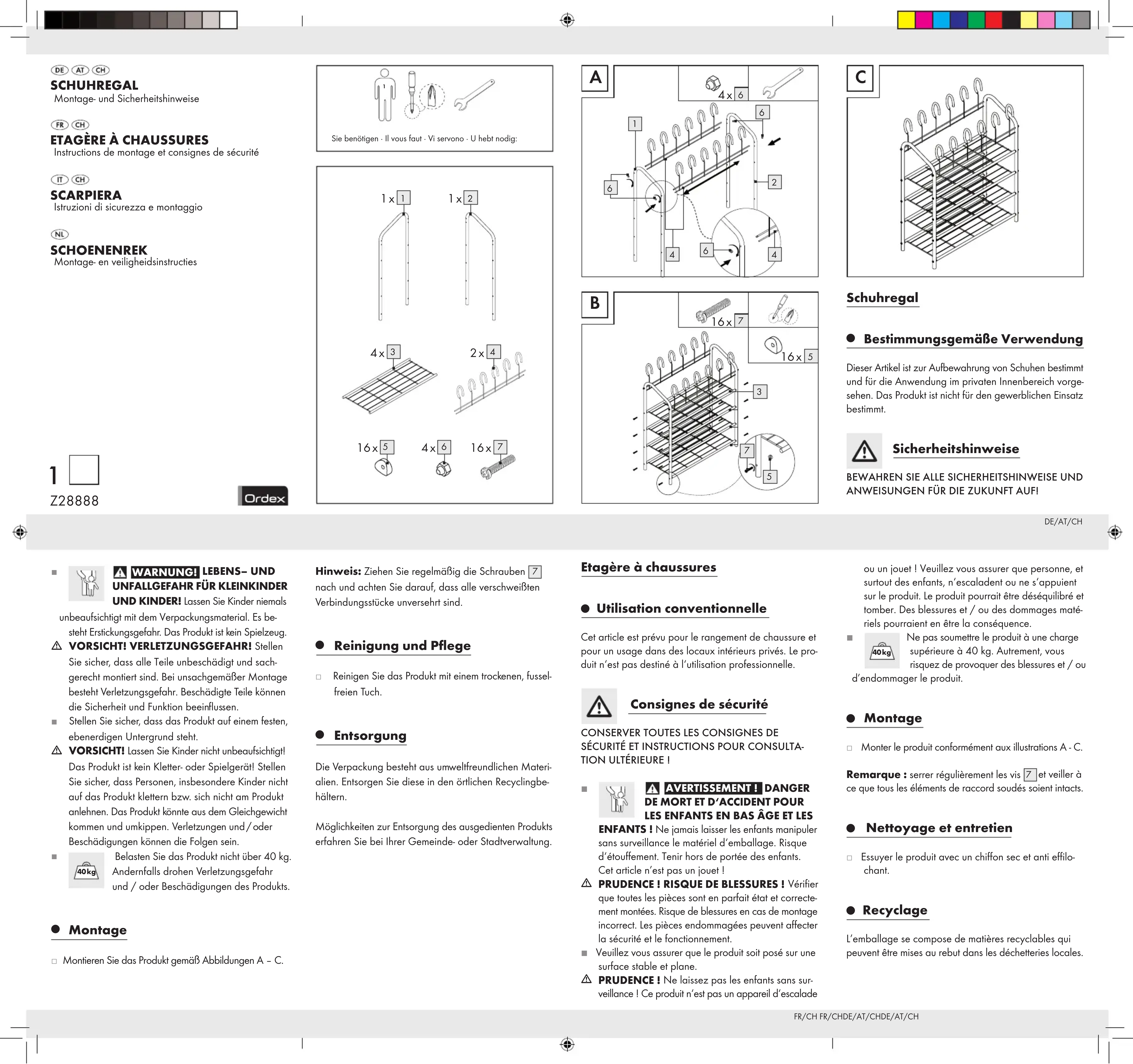 Utilisation conventionnelle Cet article est prévu pour le rangement de chaussure et pour un usage dans des locaux intérieurs privés. Le pro-duit n‘est pas destiné à l‘utilisation professionnelle. Consignes de sécurité Conserver toutes les Consignes de séCurité et instruCtions pour Consulta-tion ultérieure ! AVERTISSEMENT ! DANGER DE MORT ET D‘ACCIDENT POUR LES ENFANTS EN BAS ÂGE ET LES ENFANTS ! Ne jamais laisser les enfants manipuler sans surveillance le matériel d‘emballage. Risque d‘étouffement. Tenir hors de portée des enfants. Cet article n’est pas un jouet !m PRUDENCE ! RISQUE DE BLESSURES ! Vérifier que toutes les pièces sont en parfait état et correcte-ment montées. Risque de blessures en cas de montage incorrect. Les pièces endommagées peuvent affecter la sécurité et le fonctionnement. J Veuillez vous assurer que le produit soit posé sur une surface stable et plane. m PRUDENCE ! Ne laissez pas les enfants sans sur-veillance ! Ce produit n‘est pas un appareil d‘escalade Schuhregal