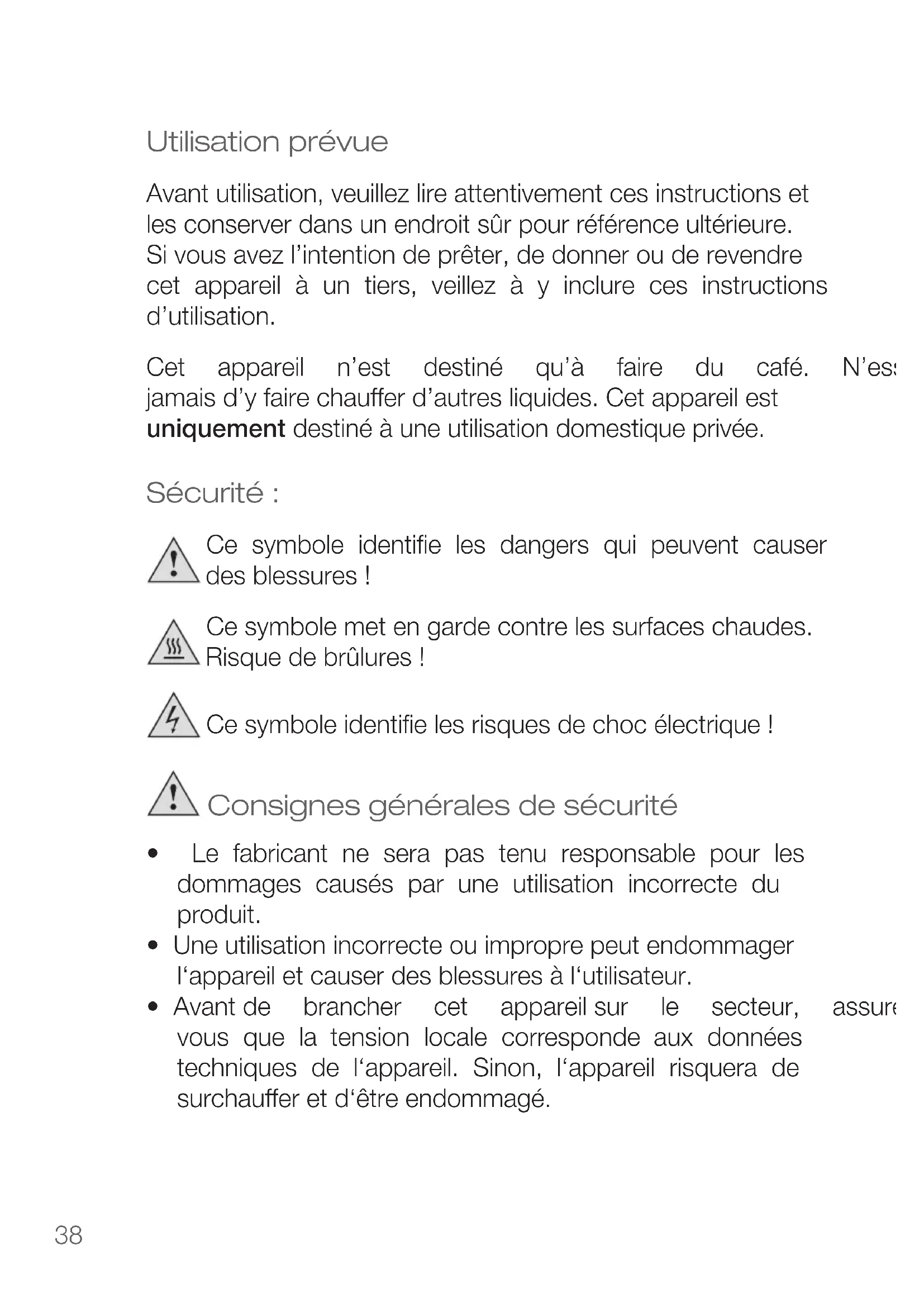 - N’ouvrez jamais le couvercle du ltre ou le porte-ltre respectivement pendant le fonctionnement car l’appareil émet de la vapeur chaude. Risque de brûlures graves !FRANçAIS Manuel d‘instructions