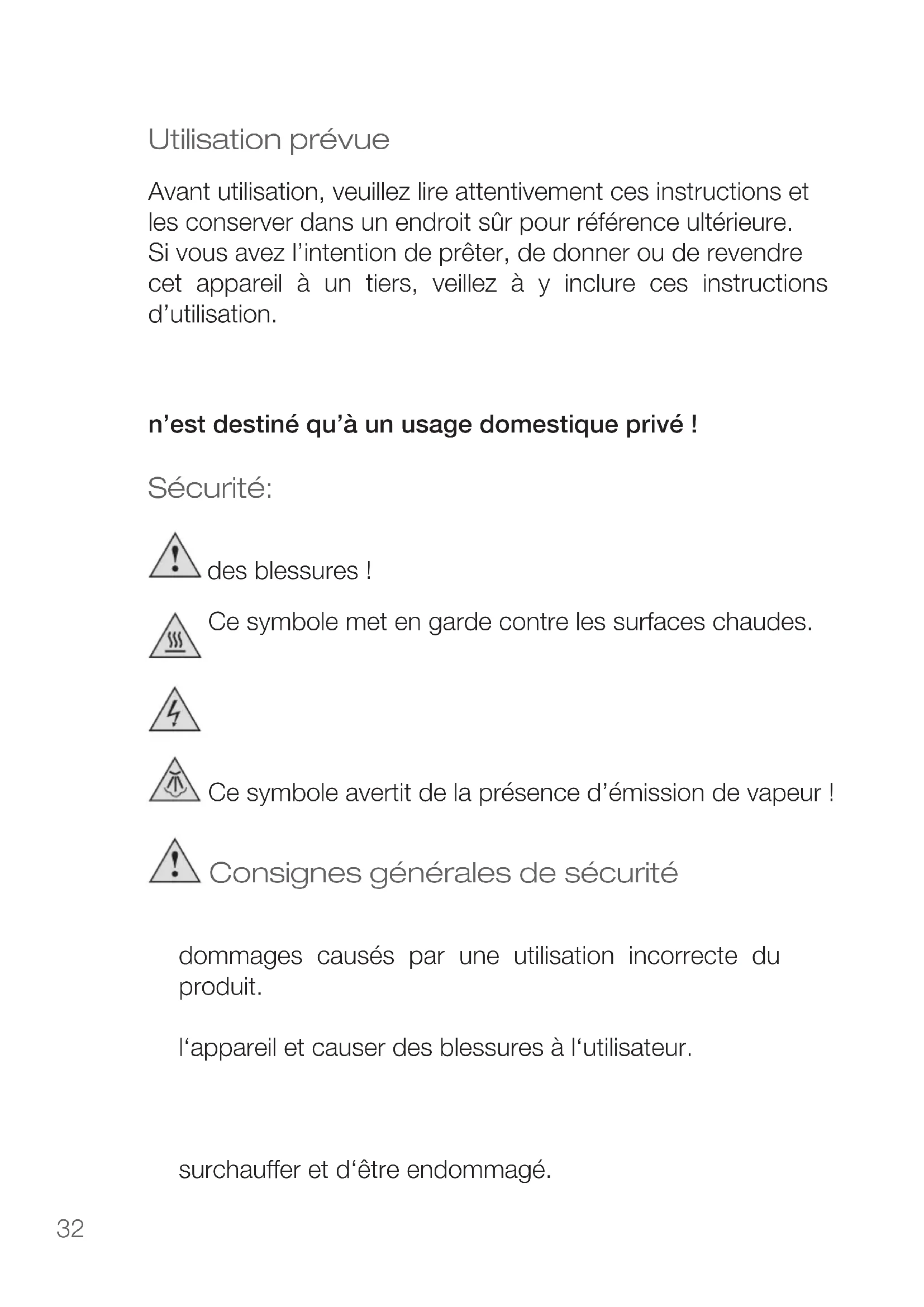 Ce symbole avertit de la présence d’émission de vapeur ! Consignes générales de sécurité Le fabricant ne sera pas tenu responsable pour les dommages causés par une utilisation incorrecte du produit. Une utilisation incorrecte ou impropre peut endommager l‘appareil et causer des blessures à l‘utilisateur.
