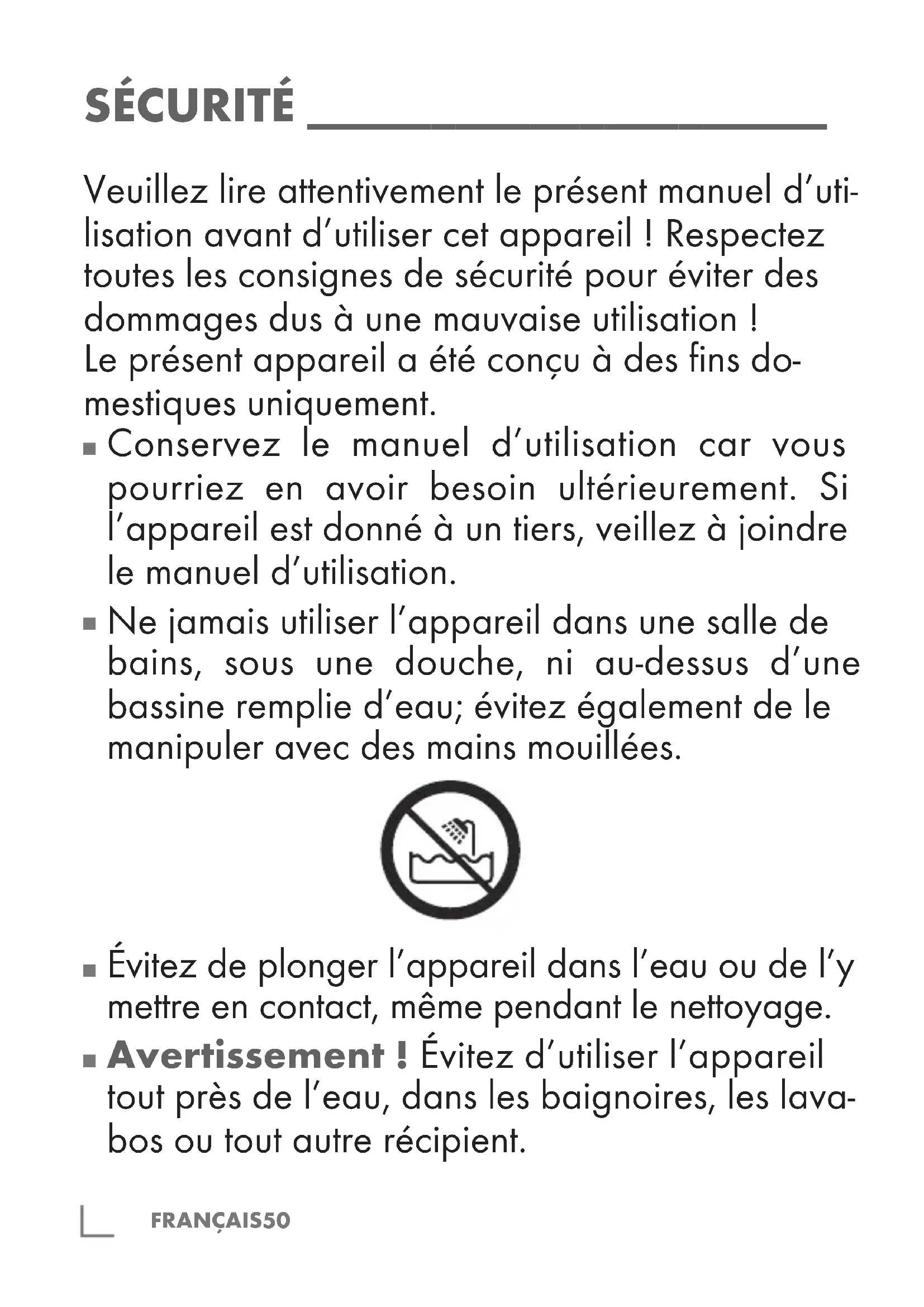 Ne jamais utiliser l’appareil dans une salle de bains, sous une douche, ni au-dessus d’une bassine remplie d’eau; évitez également de le manipuler avec des mains mouillées.