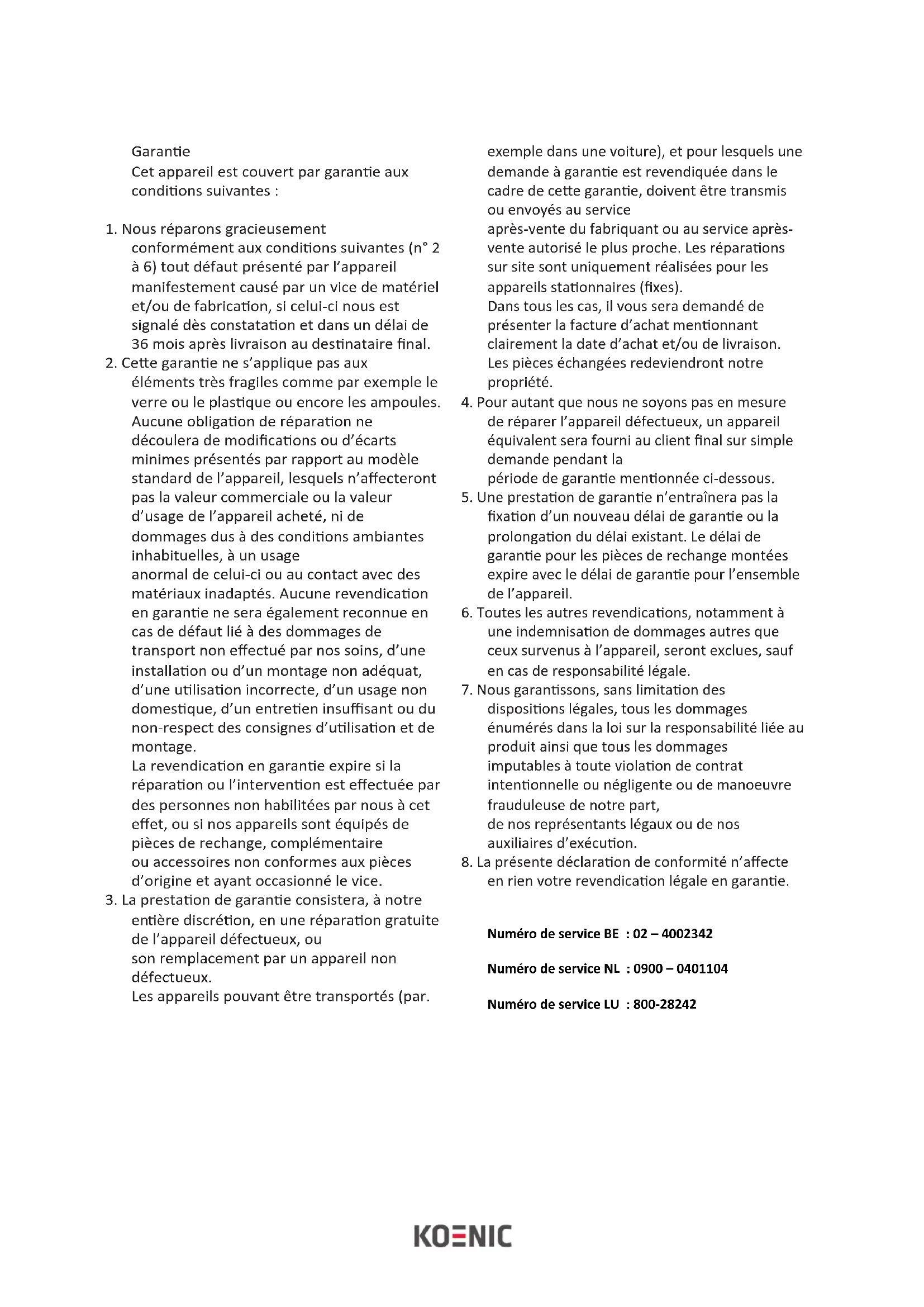 en rien votre revendication légale en garantie. Numéro de service BE : 02 – 4002342 Numéro de service NL : 0900 – 0401104 Numéro de service LU : 800-28242et