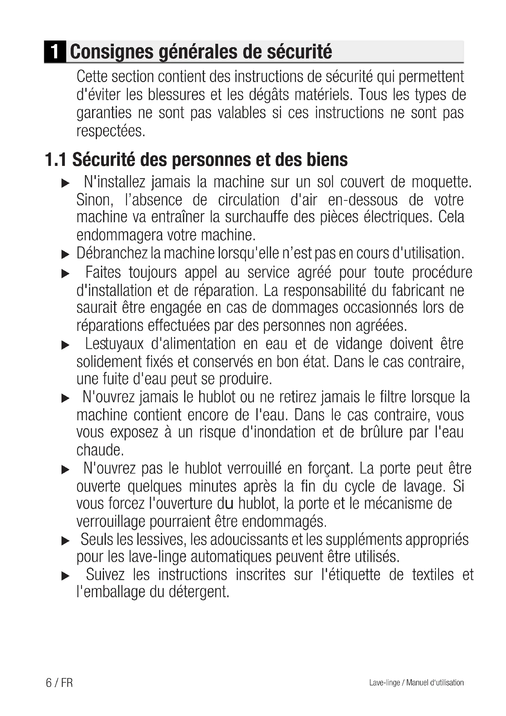 4.7.4 Nettoyage les filtres d'arrivée d'eau ---------------------------------------------------------------------------- 40 4.7.5 Évacuation de l'eau restante et nettoyage du filtre de la pompe-------------------------------------------------- 406 / FR Lave-linge / Manuel d‘utilisation 1 Consignes générales de sécurité Cette section contient des instructions de sécurité qui permettent d'éviter les blessures et les dégâts matériels. Tous les types de garanties ne sont pas valables si ces instructions ne sont pas respectées.