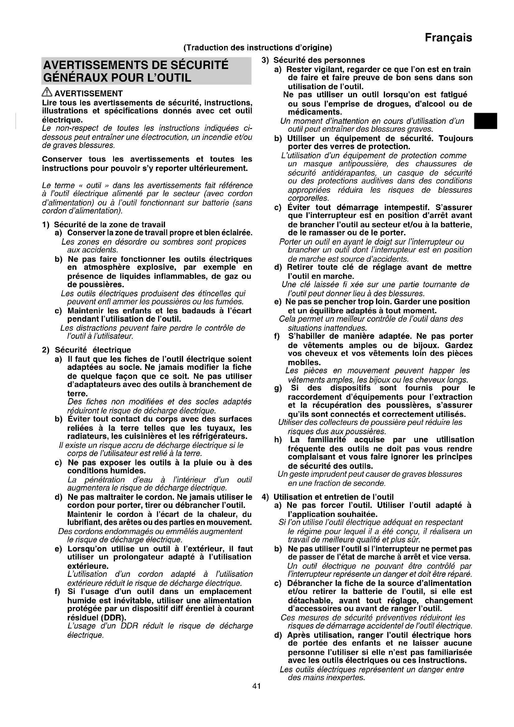 41. Toujours tenir l'outil fermement avec une main sur la
