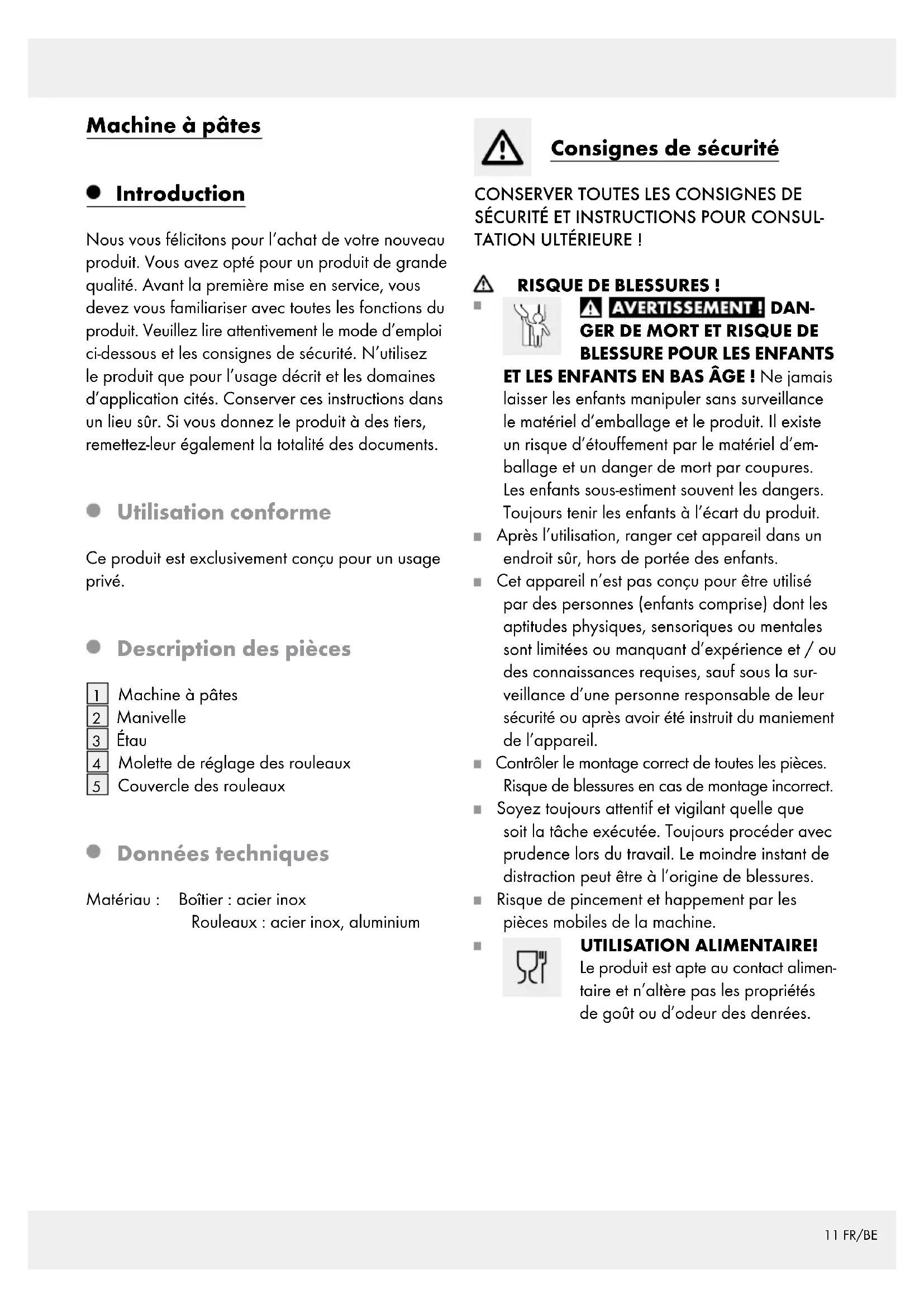 ET LES ENFANTS EN BAS ÂGE ! Ne jamais laisser les enfants manipuler sans surveillance le matériel d’emballage et le produit. Il existe un risque d’étouffement par le matériel d’em- ballage et un danger de mort par coupures. Les enfants sous-estiment souvent les dangers. Toujours tenir les enfants à l’écart du produit. Après l’utilisation, ranger cet appareil dans un endroit sûr, hors de portée des enfants. Cet appareil n’est pas conçu pour être utilisé par des personnes (enfants comprise) dont les aptitudes physiques, sensoriques ou mentales sont limitées ou manquant d’expérience et / ou des connaissances requises, sauf sous la sur- veillance d’une personne responsable de leur sécurité ou après avoir été instruit du maniement de l’appareil. Contrôler le montage correct de toutes les pièces. Risque de blessures en cas de montage incorrect. Soyez toujours attentif et vigilant quelle que soit la tâche exécutée. Toujours procéder avec prudence lors du travail. Le moindre instant de distraction peut être à l’origine de blessures. Risque de pincement et happement par les pièces mobiles de la machine. UTILISATION ALIMENTAIRE! Le produit est apte au contact alimen- taire et n’altère pas les propriétés de goût ou d’odeur des denrées.12 FR/BE Préparation Recette de base pour faire une pâte à pâtes italienne Ingrédients 300 g Farine (de préférence de blé dur) 130 ml d‘eau minérale naturelle ½ cuillère à café de sel