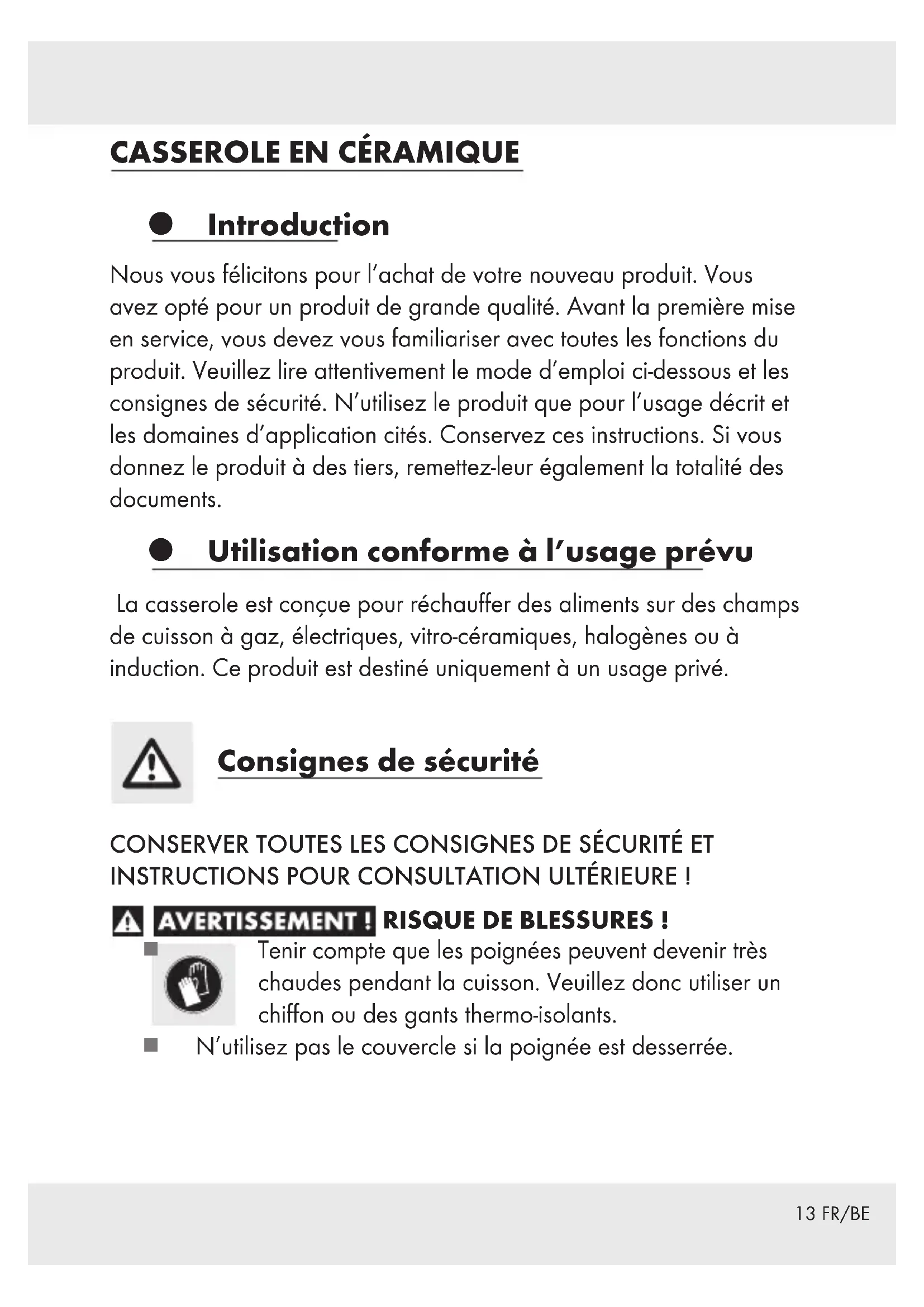 Tenir compte que les poignées peuvent devenir très chaudes pendant la cuisson. Veuillez donc utiliser un chiffon ou des gants thermo-isolants. N’utilisez pas le couvercle si la poignée est desserrée. 13 FR/BE14 FR/BE RISQUE DE DÉGÂTS MATÉRIELS ! Il est essentiel de ne pas laisser les casseroles et poêles contenant de la graisse sans surveillance pendant la cuisson. La graisse peut chauffer et s’enflammer rapidement. Si la graisse s’enflamme, ne jamais tenter de l’éteindre avec de l’eau ! Étouffer les flammes avec le couvercle de la casserole ou une couverture épaisse en laine. Afin de ne pas endommager le revêtement anti-adhésif, uniquement utiliser des ustensiles de cuisine en plastique ou en bois. Ne pas couper les aliments cuits directement dans la casserole. Ne pas déposer un morceau de viande dégoulinant dans de la graisse chaude. Les projections de graisse sur la plaque de cuisinière chaude peuvent aisément causer un incendie. Des températures élevées risquent de décolorer la partie extérieure du produit. Cette dose n’indique pas un défaut dans la matière. Elle ne nuit pas non plus à la qualité et au fonctionnement du produit. Sélectionner une plaque de cuisson d’un diamètre correspondant à celui de la casserole pour éviter toute perte de chaleur. Cet article convient pour tenir des mets au chaud dans un four (max. 150 °C pendant 1 heure). Prière de ne jamais tenir le produit chaud sous l’eau courante froide. Le dessous du produit pourrait être ainsi endommagé ou tomber du produit. Le produit est lavable en lave-vaisselle. Un nettoyage fréquent du produit à l’aide de produits de nettoyage agressifs peut endommager celui-ci et en provoquer la décoloration. Le nettoyage dans le lave-vaisselle peut décolorer les pièces en aluminium. ATTENTION ! Le couvercle en verre est fragile / non résistant aux chocs !15 FR/BE Nettoyer la casserole à la main avec de l’eau chaude et un liquide vaisselle en vente dans le commerce. Proscrire l’utilisation de tout objet coupant et pointu afin de ne pas endommager le matériel. ATTENTION ! RAYURE ! Évitez de pousser et de tirer le récipient de cuisson sur les plaques de cuisson en céramique / en verre ! Avant de commencer la cuisson, nous recommandons d’essuyer la surface de la plaque de cuisson et le fond du récipient de cuisson avec un chiffon propre et sans peluche (par exemple en microfibre). De cette manière vous pouvez prévenir des rayures. Veuillez noter qu’en raison de la couleur claire un léger changement de celle-ci peut apparaître lors de l’utilisation de ce produit. Ces colorations sont considérées comme des traces d’utilisation et ne représentent aucune atteinte à la qualité du revêtement et à son utilité. Remarque relative aux cuisinières à induction Remarque: un bruit peut se produire dans certaines conditions, causé par les propriétés électromagnétiques de la source de chaleur et de la marmite / casserole. Il s’agit d’un phénomène tout à fait normal et n’indique nullement que votre cuisinière à induction ou votre batterie de cuisine est endommagée. Placez la marmite / casserole au centre de la plaque chauffante à induction. ATTENTION! Vitesse de chauffe élevée ! Ne chauffez pas excessivement la batterie de cuisine lors du préchauffage.16 FR/BE La pièce doit être bien aéré, en cas de surchauffe de la batterie de cuisine. Cet article combine les avantages d’une batterie de cuisine en aluminium, comme son faible poids et sa conductibilité thermique élevée, aux avantages de la cuisson par induction. Pour permettre cet effet, des éléments en acier magnétiques ont été insérés dans le fond en aluminium. Le fond n’est pas magnétique dans son ensemble de sorte que si le diamètre du fond est plus grand que la plaque de cuisson à induction ce qui peut entraîner que les bobines d’induction ne réagissent pas. Cela n’est pas un manquement dans la qualité et ne représente pas d’atteinte à l’état de marche. Afin que l’article puisse fonctionner parfaitement, veuillez placer correctement le diamètre du fond sur la plaque de cuisson correspondante. Usage Avant la première utilisation, veuillez décoller les éventuelles étiquettes adhésives et rincer l’article à l’eau chaude. Avant la première utilisation, faire chauffer la casserole 2 ou 3 fois avec de l’eau pour éliminer complètement tous éventuels résidus de fabrication. Ne pas surchauffer la casserole vide ou contenant des aliments, car cela réduirait la propriété anti-adhésive et abîmerait la couche de protection.17 FR/BE Recyclage L’emballage se compose de matières recyclables qui peuvent être mises au rebut dans les déchetteries locales. Les possibilités de recyclage des produits usés sont à demander auprès de votre municipalité. Garantie Le produit a été fabriqué selon des critères de qualité stricts et contrôlé consciencieusement avant sa livraison. En cas de défaillance, vous êtes en droit de retourner ce produit au vendeur. La présente garantie ne constitue pas une restriction de vos droits légaux. Ce produit bénéficie d‘une garantie de 3 ans à compter de sa date d’achat. La durée de garantie débute à la date d’achat. Veuillez conserver le ticket de caisse original. Il fera office de preuve d’achat. Si un problème matériel ou de fabrication devait survenir dans 3 ans suivant la date d‘achat de ce produit, nous assurons à notre discrétion la réparation ou le remplacement du produit sans frais supplémentaires. La garantie prend fin si le produit est endommagé suite à une utilisation inappropriée ou à un entretien défaillant. La garantie couvre les vices matériels et de fabrication. Cette garantie ne s’étend ni aux pièces du produit soumises à une usure normale (p. ex. des piles) et qui, par conséquent, peuvent être considérées comme des pièces d’usure, ni aux dommages sur