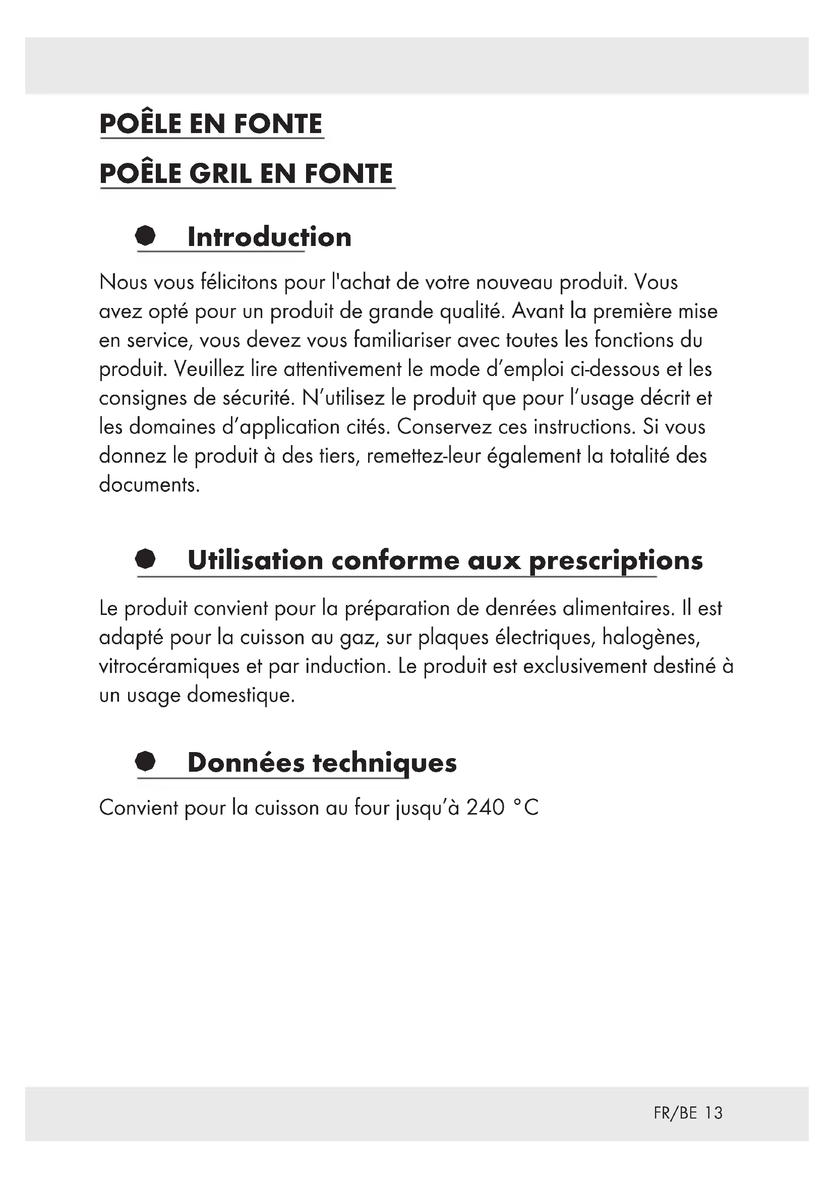 § Introduction Nous vous félicitons pour l'achat de votre nouveau produit. Vous avez opté pour un produit de grande qualité. Avant la première mise en service, vous devez vous familiariser avec toutes les fonctions du produit. Veuillez lire attentivement le mode d’emploi ci-dessous et les consignes de sécurité. N’utilisez le produit que pour l’usage décrit et les domaines d’application cités. Conservez ces instructions. Si vous donnez le produit à des tiers, remettez-leur également la totalité des documents. § Utilisation conforme aux prescriptions Le produit convient pour la préparation de denrées alimentaires. Il est adapté pour la cuisson au gaz, sur plaques électriques, halogènes, vitrocéramiques et par induction. Le produit est exclusivement destiné à un usage domestique. § Données techniques Convient pour la cuisson au four jusqu’à 240 °C14 FR/BE Consignes de sécurité CONSERVEZ TOUTES LES CONSIGNES DE SÉCURITÉ