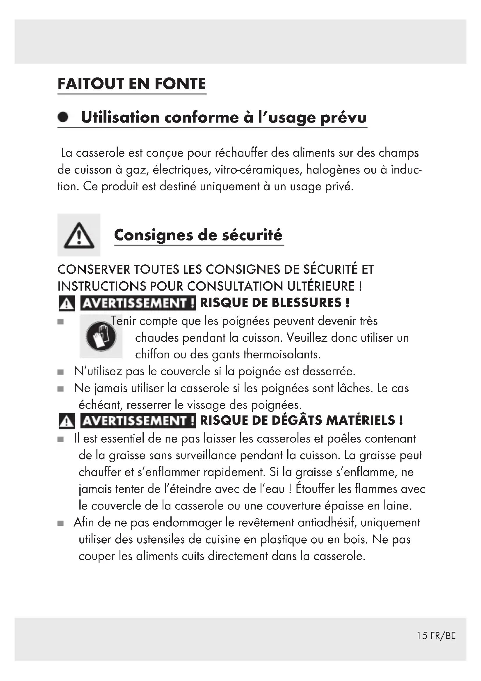 Utilisation conforme à l’usage prévu La casserole est conçue pour réchauffer des aliments sur des champs de cuisson à gaz, électriques, vitro-céramiques, halogènes ou à induc- tion. Ce produit est destiné uniquement à un usage privé. Consignes de sécurité CONSERVER TOUTES LES CONSIGNES DE SÉCURITÉ ET INSTRUCTIONS POUR CONSULTATION ULTÉRIEURE ! RISQUE DE BLESSURES ! Tenir compte que les poignées peuvent devenir très chaudes pendant la cuisson. Veuillez donc utiliser un chiffon ou des gants thermoisolants. N’utilisez pas le couvercle si la poignée est desserrée. Ne jamais utiliser la casserole si les poignées sont lâches. Le cas échéant, resserrer le vissage des poignées. RISQUE DE DÉGÂTS MATÉRIELS ! Il est essentiel de ne pas laisser les casseroles et poêles contenant de la graisse sans surveillance pendant la cuisson. La graisse peut chauffer et s’enflammer rapidement. Si la graisse s’enflamme, ne jamais tenter de l’éteindre avec de l’eau ! Étouffer les flammes avec le couvercle de la casserole ou une couverture épaisse en laine. Afin de ne pas endommager le revêtement antiadhésif, uniquement utiliser des ustensiles de cuisine en plastique ou en bois. Ne pas couper les aliments cuits directement dans la casserole. 271147_271148_271150_CB3.indd 15 9/11/2015 5:09:03 PM16 FR/BE Ne pas déposer un morceau de viande dégoulinant dans de la graisse chaude. Les projections de graisse sur la plaque de cuisinière chaude peuvent aisément causer un incendie. Sélectionner une plaque de cuisson d’un diamètre correspondant à celui de la casserole pour éviter toute perte de chaleur. Cet article convient pour tenir des mets au chaud dans un four (max. 180 °C pendant 1 heure). Le produit est lavable en lave-vaisselle. Le nettoyage fréquent avec des nettoyants agressifs peut entraîner un endommagement et / ou une coloration de la marmite. Le nettoyage dans le lave-vaisselle peut décolorer les pièces en aluminium. ATTENTION ! Le couvercle en verre est fragile / non résistant aux chocs ! Nettoyer la casserole à la main avec de l’eau chaude et un liquide vaisselle en vente dans le commerce. Proscrire l’utilisation de tout objet coupant et pointu afin de ne pas endommager le matériel. Ne tirez et ne poussez pas le produit sur les plaques de cuisson vitrocéramiques ou halogènes. La plaque de cuisson risque alors d’être rayée. Veuillez noter qu’en raison de la couleur claire un léger change- ment de celle-ci peut apparaître lors de l’utilisation de ce produit. Ces colorations sont considérées comme des traces d’utilisation et ne représentent aucune atteinte à la qualité du revêtement et à son utilité. P Remarque relative aux cuisinières à induction J Remarque: un bruit peut se produire dans certaines conditions, causé par les propriétés électromagnétiques de la source de chaleur et de la marmite/casserole. 271147_271148_271150_CB3.indd 16 9/11/2015 5:09:03 PM17 FR/BE J Il s’agit d’un phénomène tout à fait normal et n’indique nullement que votre cuisinière à induction ou votre batterie de cuisine est endommagée. J Placez la marmite/casserole au centre de la plaque chauffante à induction. J ATTENTION! Vitesse de chauffe élevée ! Ne chauffez pas excessivement la batterie de cuisine lors du préchauffage. J La pièce doit être bien aéré, en cas de surchauffe de la batterie de cuisine. Usage Avant la première utilisation, veuillez décoller les éventuelles étiquettes adhésives et rincer l’article à l’eau chaude. Avant la première utilisation, faire chauffer la casserole 2 ou 3 fois avec de l’eau pour éliminer complètement tous éventuels résidus de fabrication. Ne pas surchauffer la casserole vide ou contenant des aliments, car cela réduirait la propriété antiadhésive et abîmerait la couche de protection. Mise au rebut L’emballage se compose exclusivement de matières recy- clables qui peuvent être mises au rebut dans les déchette- ries locales. Renseignez-vous auprès de votre mairie ou de l’administration municipale concernant les possibilités de mise au rebut des produits usés. 271147_271148_271150_CB3.indd 17 9/11/2015 5:09:04 PM18 NL/BE ALUMINIUMGIETWERK KOOKPAN Doelmatig gebruik De pan is geschikt voor het verwarmen van levensmiddelen op gas- fornuizen, elektrische, ceran-, halogeen- en inductiekookvelden. Het product is uitsluitend bestemd voor privégebruik. Veiligheidsinstructies