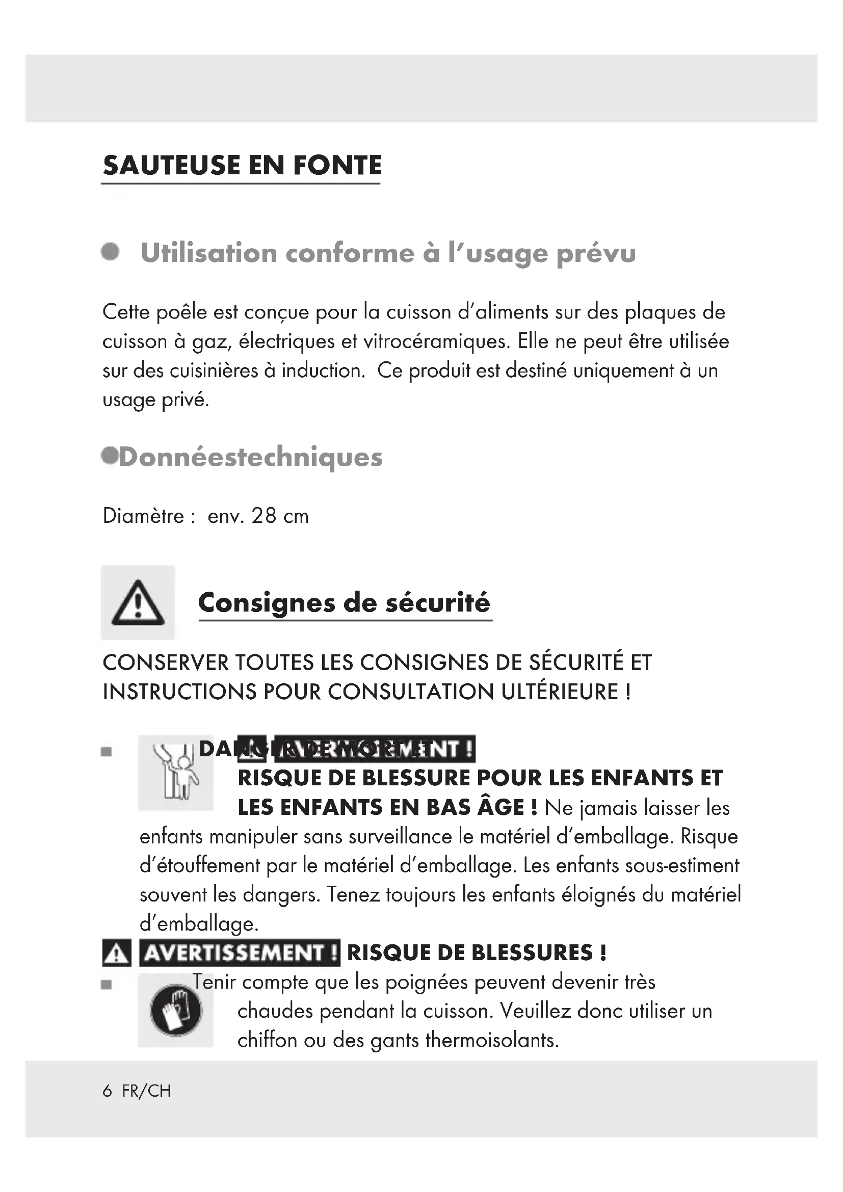 Utilisation conforme à l’usage prévu Cette poêle est conçue pour la cuisson d’aliments sur des plaques de cuisson à gaz, électriques et vitrocéramiques. Elle ne peut être utilisée sur des cuisinières à induction. Ce produit est destiné uniquement à un usage privé. Données techniques Diamètre : env. 28 cm Consignes de sécurité CONSERVER TOUTES LES CONSIGNES DE SÉCURITÉ ET INSTRUCTIONS POUR CONSULTATION ULTÉRIEURE !