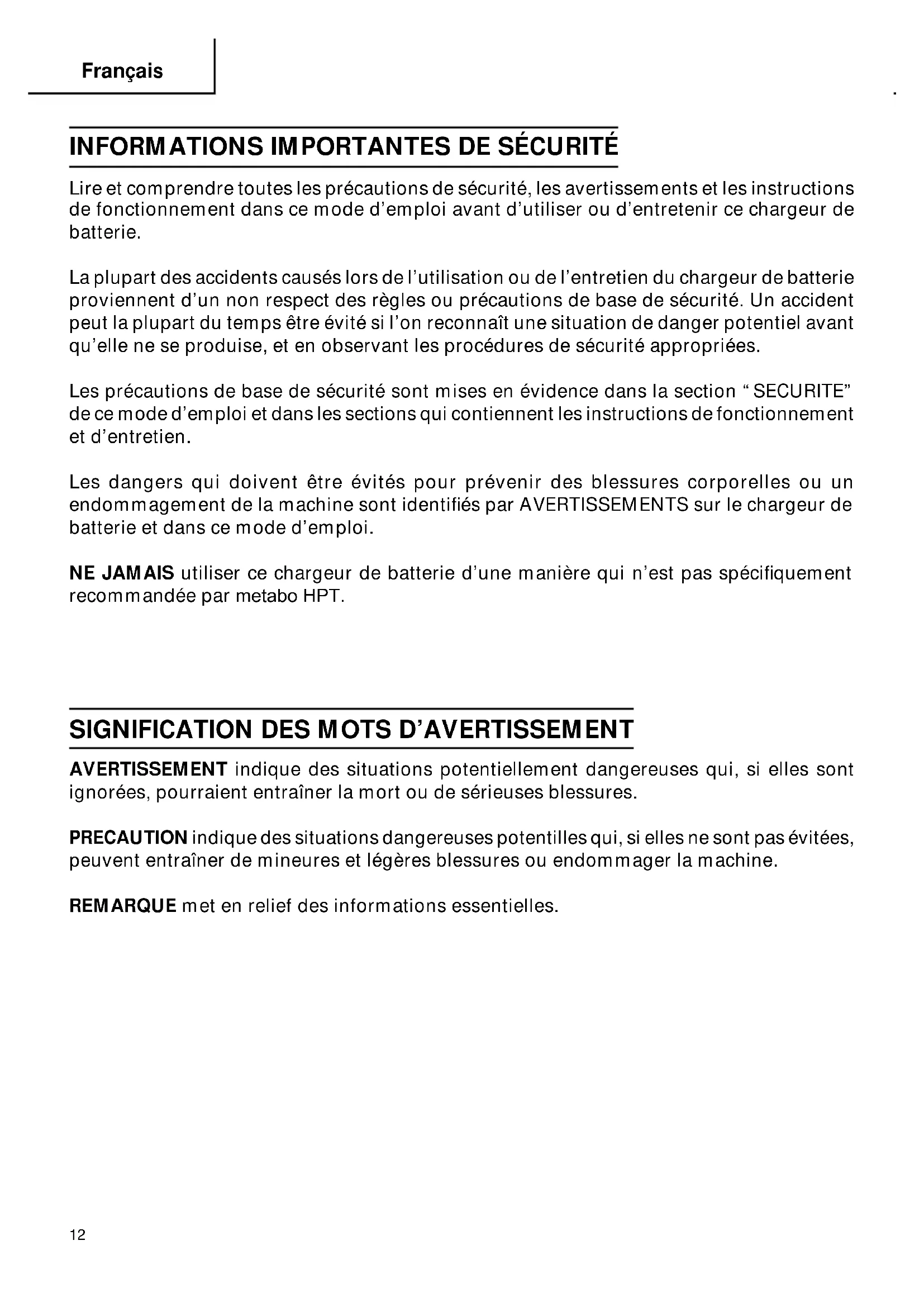 Lire et comprendre toutes les précautions de sécurité, les avertissements et les instructions de fonctionnement dans ce mode d’emploi avant d’utiliser ou d’entretenir ce chargeur de batterie. La plupart des accidents causés lors de l’utilisation ou de l’entretien du chargeur de batterie proviennent d’un non respect des règles ou précautions de base de sécurité. Un accident peut la plupart du temps être évité si l’on reconnaît une situation de danger potentiel avant qu’elle ne se produise, et en observant les procédures de sécurité appropriées. Les précautions de base de sécurité sont mises en évidence dans la section “SECURITE” de ce mode d’emploi et dans les sections qui contiennent les instructions de fonctionnement et d’entretien. Les dangers qui doivent être évités pour prévenir des blessures corporelles ou un endommagement de la machine sont identifiés par AVERTISSEMENTS sur le chargeur de batterie et dans ce mode d’emploi. NE JAMAIS utiliser ce chargeur de batterie d’une manière qui n’est pas spécifiquement recommandée par metabo HPT.