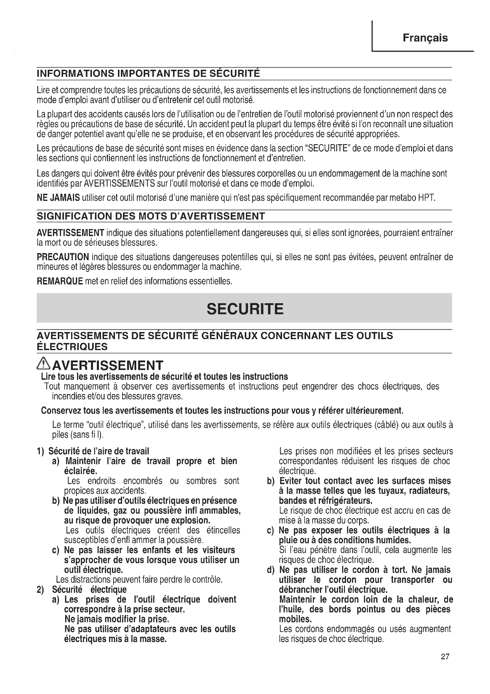 Lire et comprendre toutes les précautions de sécurité, les avertissements et les instructions de fonctionnement dans ce mode d’emploi avant d’utiliser ou d’entretenir cet outil motorisé. La plupart des accidents causés lors de l’utilisation ou de l’entretien de l’outil motorisé proviennent d’un non respect des règles ou précautions de base de sécurité. Un accident peut la plupart du temps être évité si l’on reconnaît une situation de danger potentiel avant qu’elle ne se produise, et en observant les procédures de sécurité appropriées. Les précautions de base de sécurité sont mises en évidence dans la section “SECURITE” de ce mode d’emploi et dans les sections qui contiennent les instructions de fonctionnement et d’entretien. Les dangers qui doivent être évités pour prévenir des blessures corporelles ou un endommagement de la machine sont identifi és par AVERTISSEMENTS sur l’outil motorisé et dans ce mode d’emploi. NE JAMAIS utiliser cet outil motorisé d’une manière qui n’est pas spécifi quement recommandée par metabo HPT.
