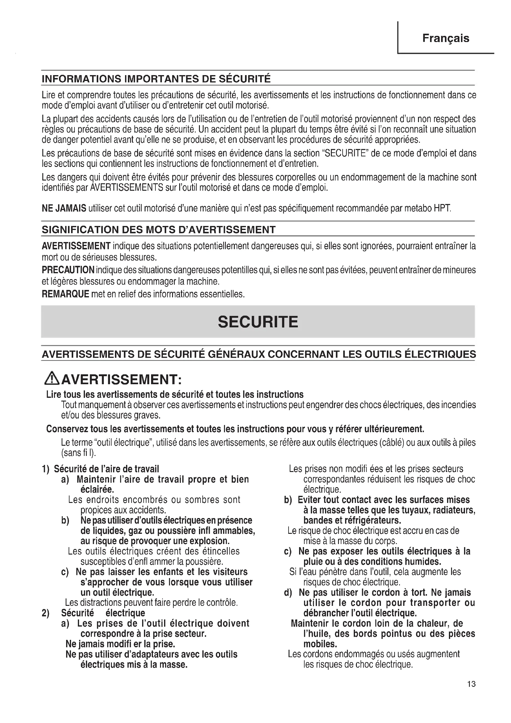 Lire et comprendre toutes les précautions de sécurité, les avertissements et les instructions de fonctionnement dans ce mode d’emploi avant d’utiliser ou d’entretenir cet outil motorisé. La plupart des accidents causés lors de l’utilisation ou de l’entretien de l’outil motorisé proviennent d’un non respect des règles ou précautions de base de sécurité. Un accident peut la plupart du temps être évité si l’on reconnaît une situation de danger potentiel avant qu’elle ne se produise, et en observant les procédures de sécurité appropriées. Les précautions de base de sécurité sont mises en évidence dans la section “SECURITE” de ce mode d’emploi et dans les sections qui contiennent les instructions de fonctionnement et d’entretien. Les dangers qui doivent être évités pour prévenir des blessures corporelles ou un endommagement de la machine sont identifi és par AVERTISSEMENTS sur l’outil motorisé et dans ce mode d’emploi. NE JAMAIS utiliser cet outil motorisé d’une manière qui n’est pas spécifi quement recommandée par metabo HPT.