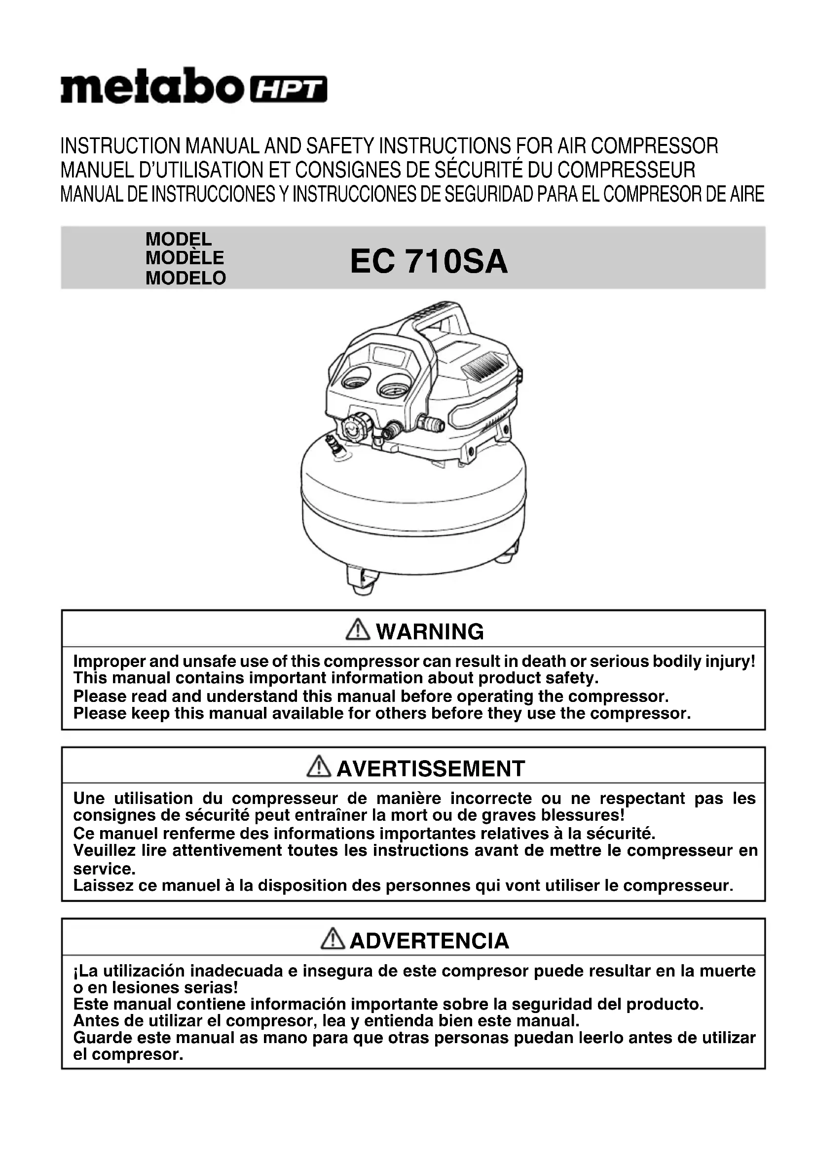 All quality compressors will eventually require servicing or replacement of parts because of wear and tear from normal use. To assure that only genuine replacement parts will be used, all service and repairs must be performed by a metabo HPT AUTHORIZED SERVICE CENTER, only. NOTE: Specifi cations are subject to change without any obligation on the part of the metabo HPT. 000BookEC710SA.indb13000BookEC710SA.indb13 2018/10/2610:58:442018/10/2610:58:4414 Français INFORMATIONS IMPORTANTES Lire attentivement toutes les instructions de fonctionnement, les consignes de sécurité et les mises en garde contenues dans ce manuel avant de faire fonctionner le compresseur ou de procéder à son entretien. La majorité des accident résultant de l’utilisation ou de l’entretien du compresseur sont dus au non respect des consignes et règles de sécurité élémentaires. En identifi ant à temps les situations potentiellement dangereuses et en observant les consignes de sécurité appropriées, on évite bien souvent des accidents. Les consignes élémentaires de sécurité sont décrites dans la section « SÉCURITÉ » de ce manuel ainsi que dans les sections renfermant les instructions d’utilisation et d’entretien. Les situations dangereuses à éviter pour prévenir tout risque de blessure grave ou de dommages de la machine sont signalées par des « AVERTISSEMENT » sur le compresseur et dans el manuel d’utilisation. Ne jamais utiliser le compresseur d’une manière autre que celles spécifi quement recommandées par metabo HPT, à moins de s’être préalablement assuré que l’utilisation envisagée ne sera dangereuse ni pour soi ni pour les autres.