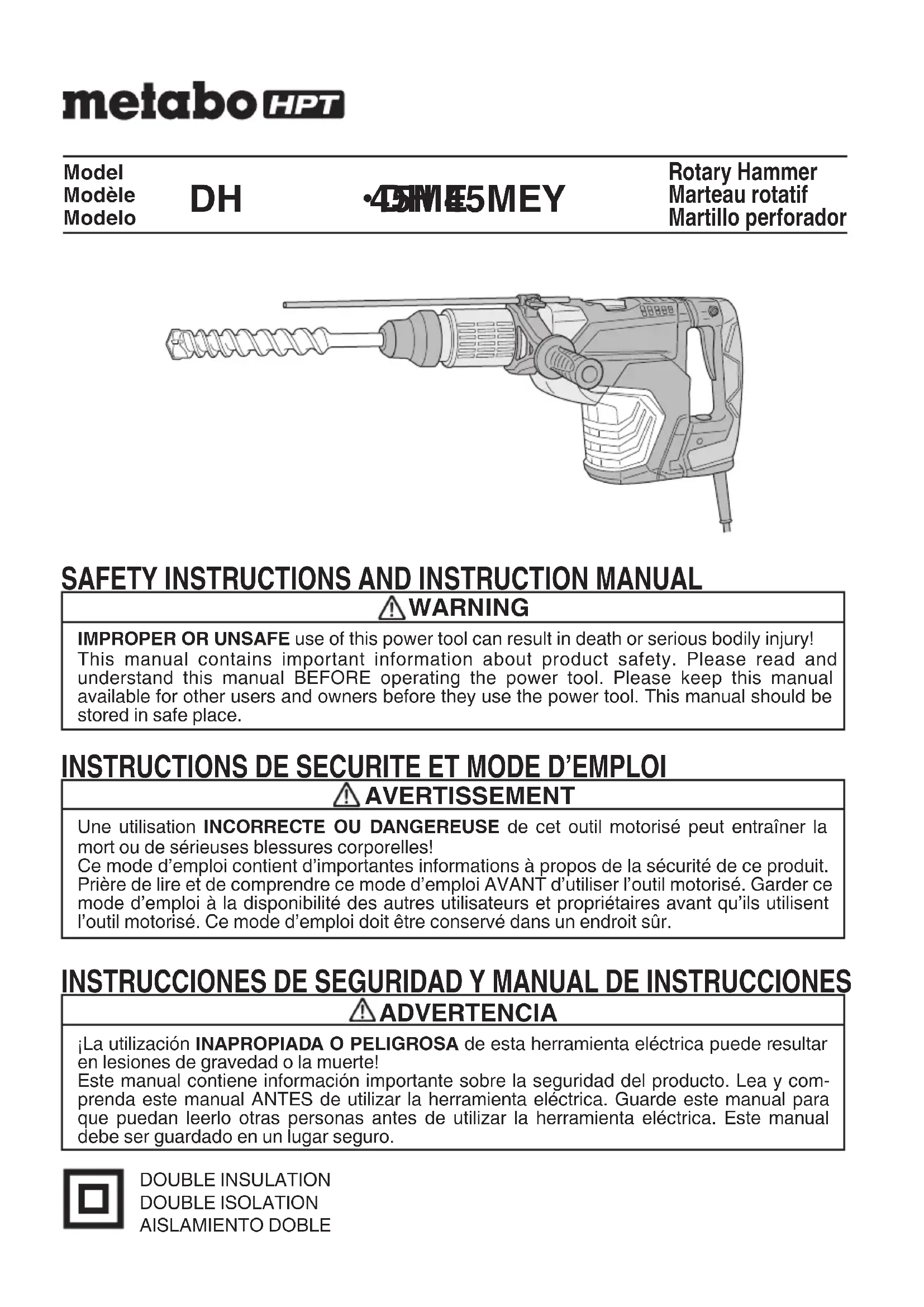 DH 45MEY DOUBLE INSULATION DOUBLE ISOLATION AISLAMIENTO DOBLE INSTRUCTIONS DE SECURITE ET MODE D’EMPLOI AVERTISSEMENT Une utilisation INCORRECTE OU DANGEREUSE de cet outil motorisé peut entraîner la mort ou de sérieuses blessures corporelles! Ce mode d’emploi contient d’importantes informations à propos de la sécurité de ce produit. Prière de lire et de comprendre ce mode d’emploi AVANT d’utiliser l’outil motorisé. Garder ce mode d’emploi à la disponibilité des autres utilisateurs et propriétaires avant qu’ils utilisent l’outil motorisé. Ce mode d’emploi doit être conservé dans un endroit sûr.
