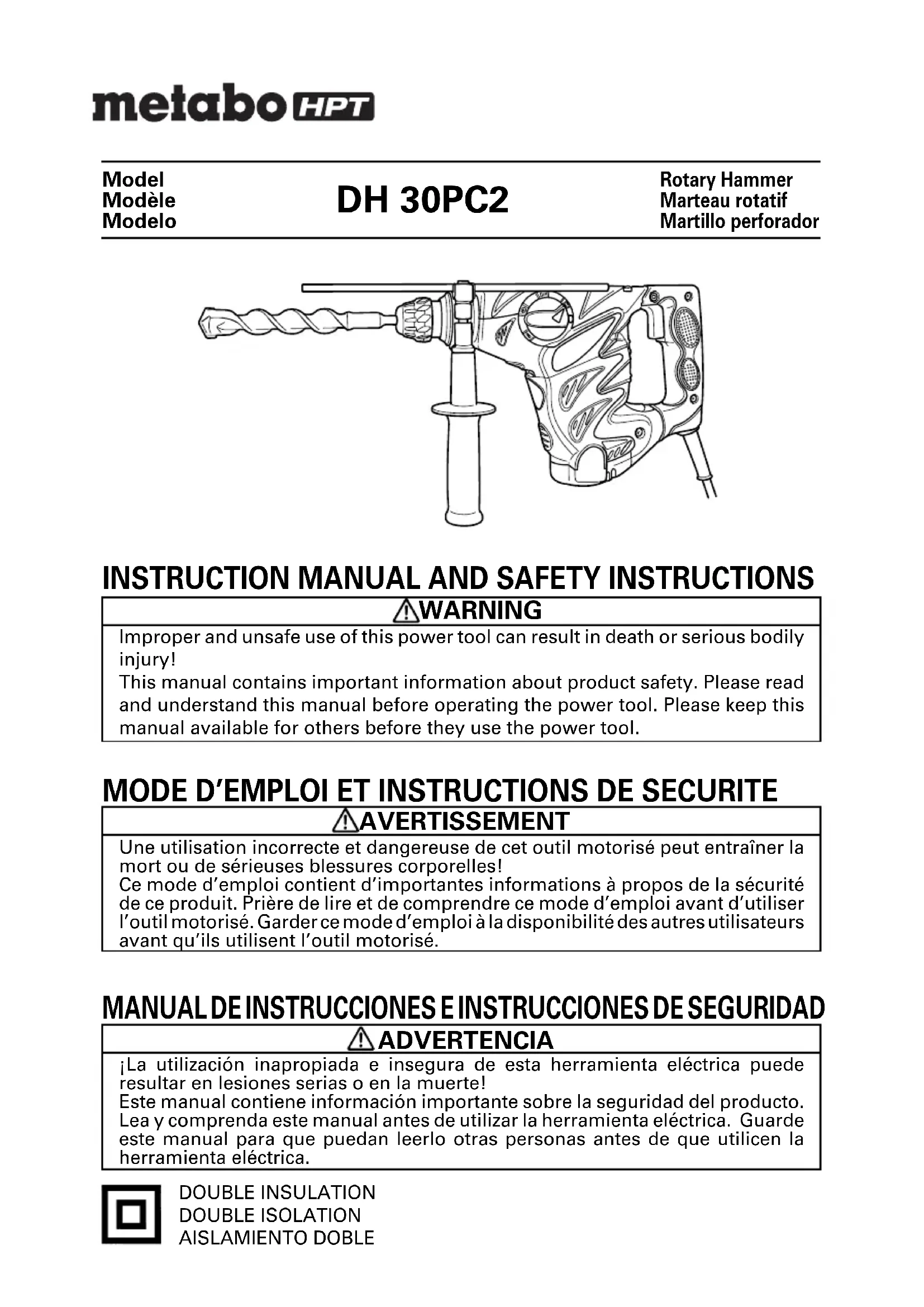 DH 30PC2 DOUBLE INSULATION DOUBLE ISOLATION AISLAMIENTO DOBLE MODE D’EMPLOI ET INSTRUCTIONS DE SECURITE AVERTISSEMENT Une utilisation incorrecte et dangereuse de cet outil motorisé peut entraîner la mort ou de sérieuses blessures corporelles! Ce mode d’emploi contient d’importantes informations à propos de la sécurité de ce produit. Prière de lire et de comprendre ce mode d’emploi avant d’utiliser l’outil motorisé. Garder ce mode d’emploi à la disponibilité des autres utilisateurs avant qu’ils utilisent l’outil motorisé.