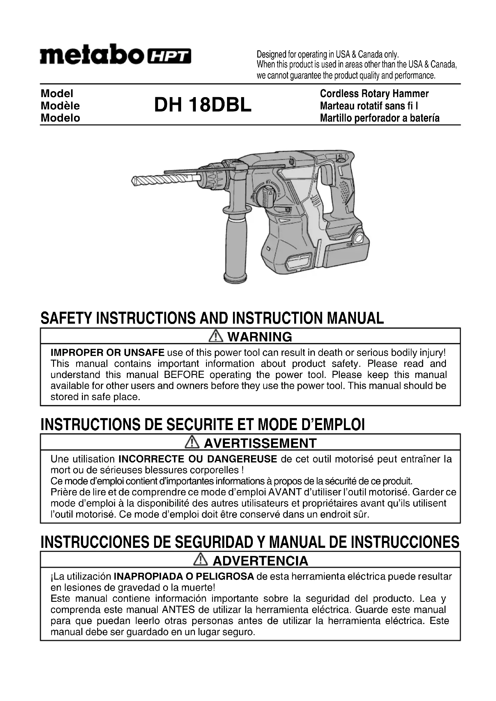 Lire toutes les précautions de sécurité, les avertissements et les instructions de fonctionnement dans ce mode d’emploi avant d’utiliser ou d’entretenir cet outil motorisé. La plupart des accidents causés lors de l’utilisation ou de l’entretien de l’outil motorisé proviennent d’un non respect des règles ou précautions de base de sécurité. Un accident peut la plupart du temps être évité si l’on reconnaît une situation de danger potentiel avant qu’elle ne se produise, et en observant les procédures de sécurité appropriées. Les précautions de base de sécurité sont mises en évidence dans la section “SECURITE” de ce mode d’emploi et dans les sections qui contiennent les instructions de fonctionnement et d’entretien. Les dangers qui doivent être évités pour prévenir des blessures corporelles ou un endommagement de la machine sont identifi és par AVERTISSEMENTS sur l’outil motorisé et dans ce mode d’emploi. NE JAMAIS utiliser cet outil motorisé d’une manière qui n’est pas spécifi quement recommandée par metabo HPT.