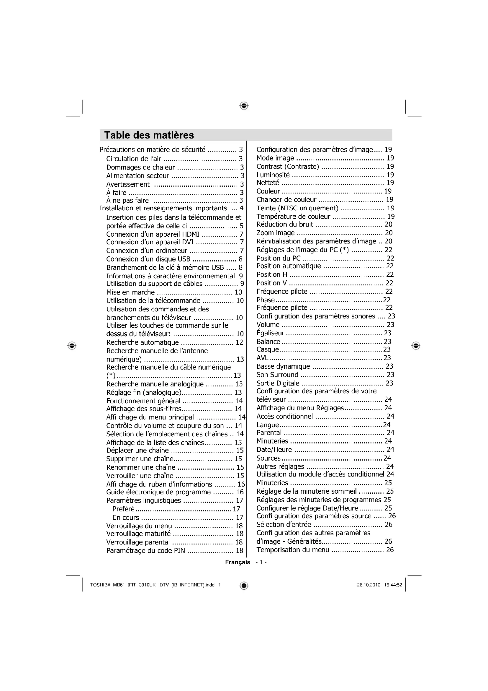 CONSÉQUENT RESTER FACILE D’ACCÈS TOSHIBA_MB61_[FR]_3910UK_IDTV_(IB_INTERNET).indd 3TOSHIBA_MB61_[FR]_3910UK_IDTV_(IB_INTERNET).indd 3 26.10.2010 15:44:5426.10.2010 15:44:54Français - 4 - Éloignez le téléviseur de la lumière directe du soleil et des autres intempéries. Pour utiliser votre appareil dans des conditions optimales, nous vous recommandons un éclairage indirect. Utilisez des rideaux ou des stores pour empêcher que les rayons de soleil atteignent l’écran. Installez votre téléviseur sur une surface stable et uniforme susceptible de supporter le poids de l’appareil. Afi n d’en maintenir la stabilité et d’éviter qu’il ne tombe, sécurisez le téléviseur au mur à l’aide d’un support mural solide relié à l’arrière de l’appareil. Les écrans LCD sont fabriqués en utilisant une technologie de précision de pointe, cependant il peut manquer des Nota bene La fonction de réception numérique du présent téléviseur est effective uniquement dans les pays cités dans la section « Pays » du menu « Confi guration ». Suivant le pays ou la région, certaines fonctions de ce téléviseur peuvent ne pas être disponibles. La réception des services supplémentaires futurs ou modifi és ne peut être garantie avec cet appareil. Si les images stationnaires générées par les diffusions au format 4 :3, les services de télétexte, les logos d’identifi cation de chaîne, les écrans d’ordinateur, les jeux vidéos, les menus à l’écran, etc. s’affi chent à l’écran pendant un certain temps, ils pourraient se faire remarquer. Il est toujours conseillé de réduire aussi bien la luminosité que le contraste du téléviseur. Une utilisation très longue et continue de l’image au format 4 :3 sur un écran prévu pour affi cher une image au format 16 :9 est susceptible de provoquer une certaine rétention de l’image au niveau du rapport d’aspect 4 :3. Lorsque c’est le cas, il ne s’agit nullement d’une défaillance du téléviseur LCD qui ne saurait par conséquent être couverte par la garantie du fabricant. L’utilisation régulière des autres formats d’image évitera de manière permanente de tels problèmes